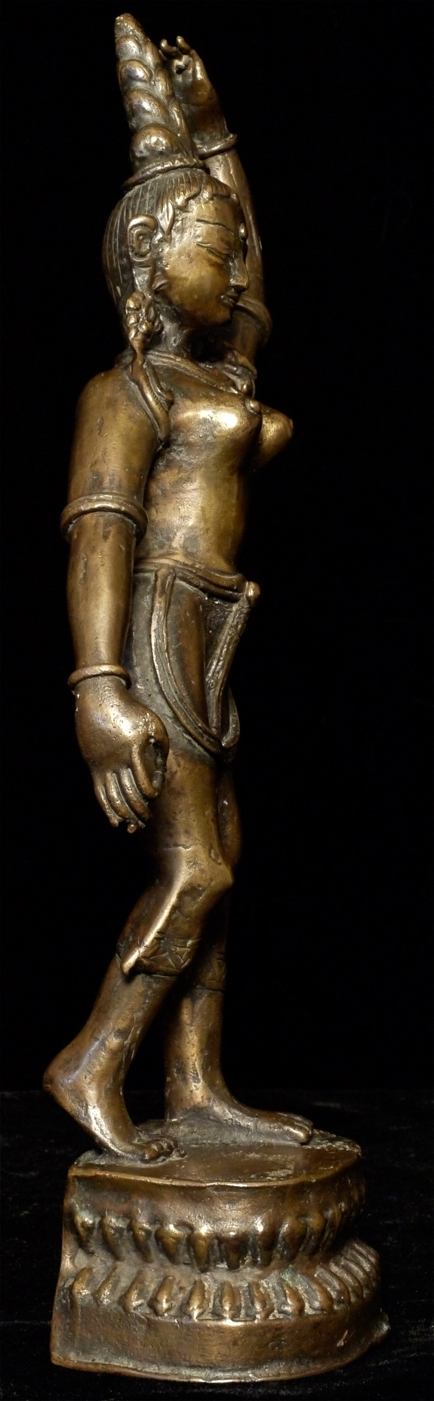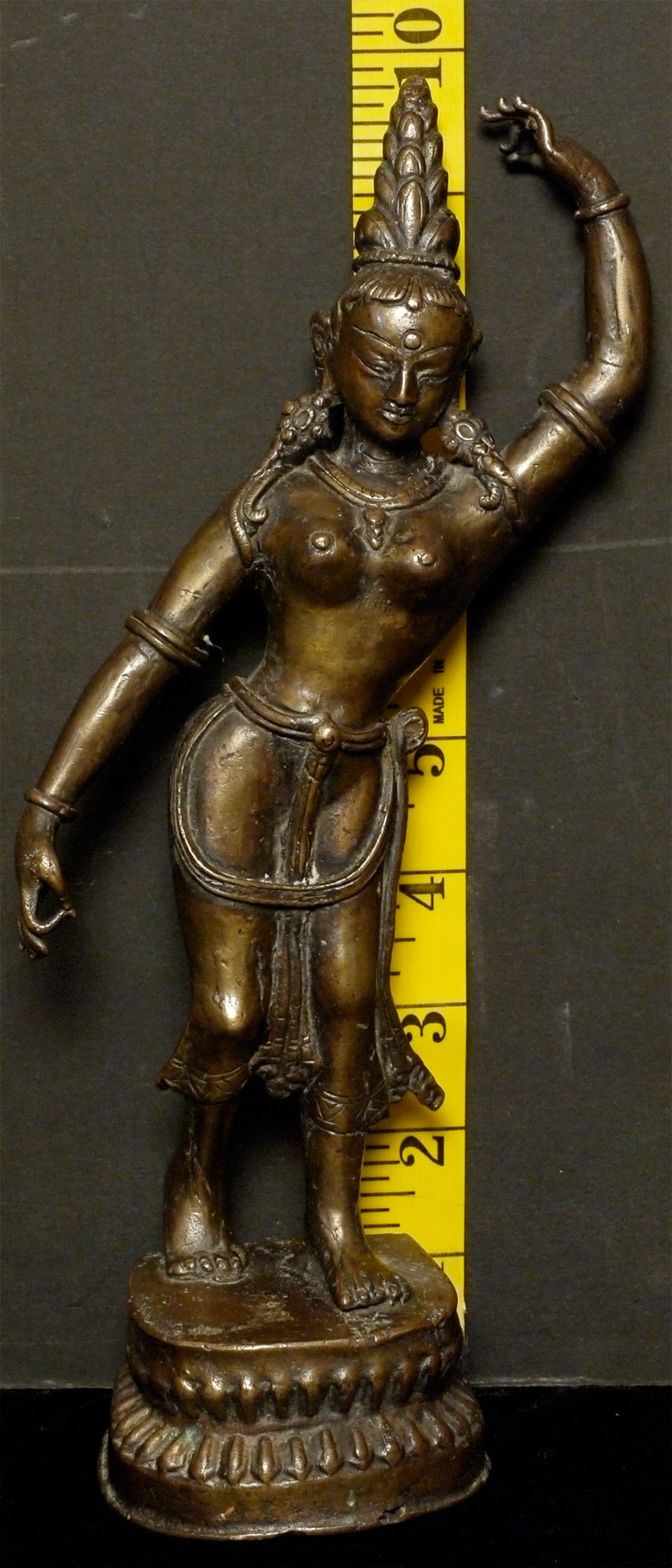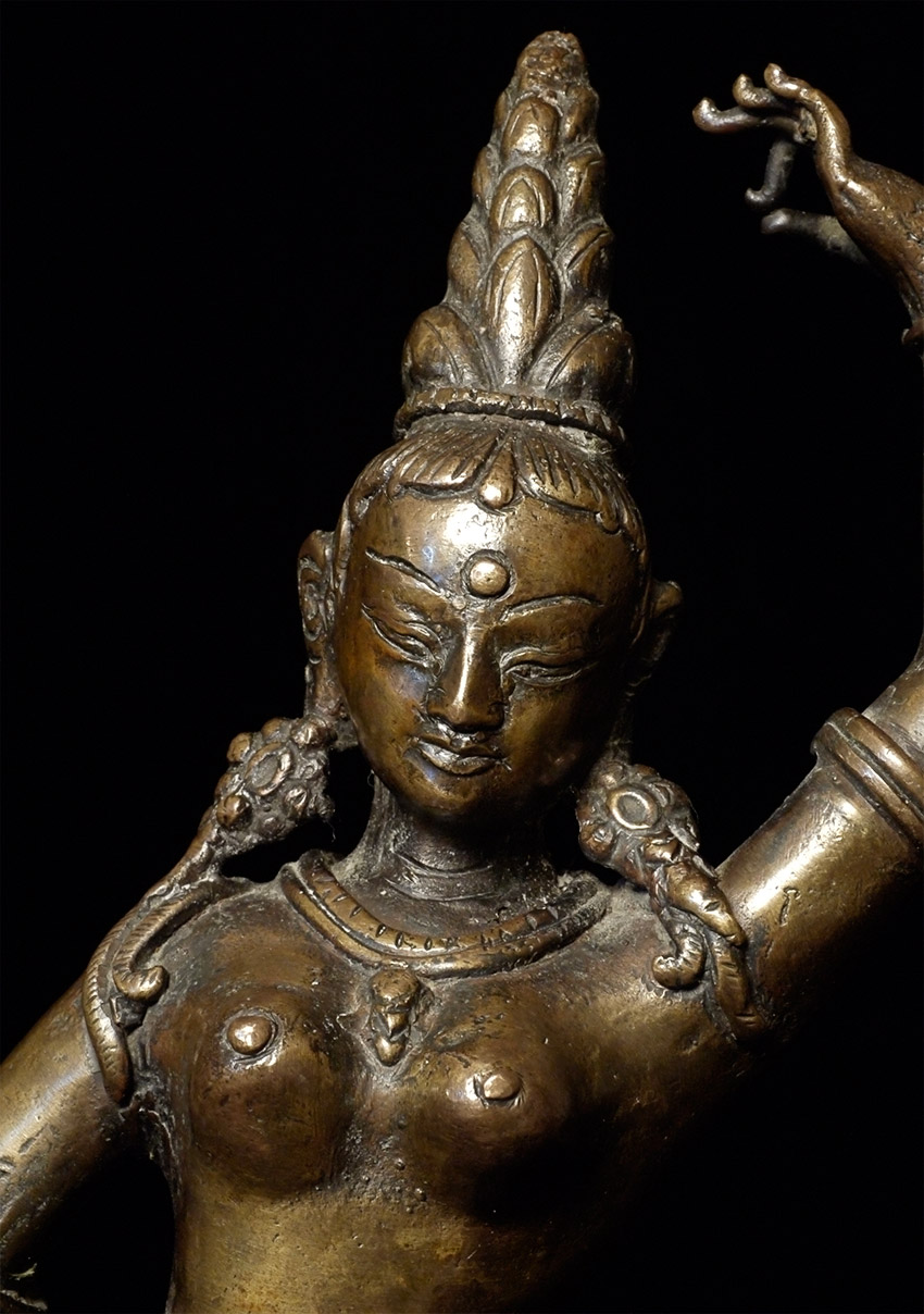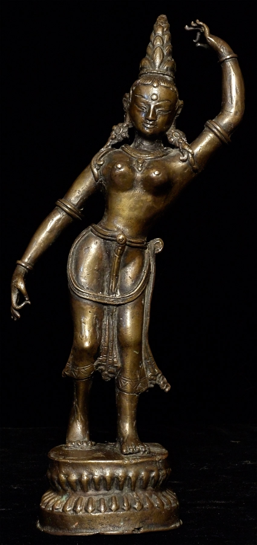 A Superb Nepalese Bodhisattva. Note how the graceful shapes of the fingers echo the hair and the earrings. Also, note the grace and elegance in the fingers and head dress. Stands 9.75 inches tall.