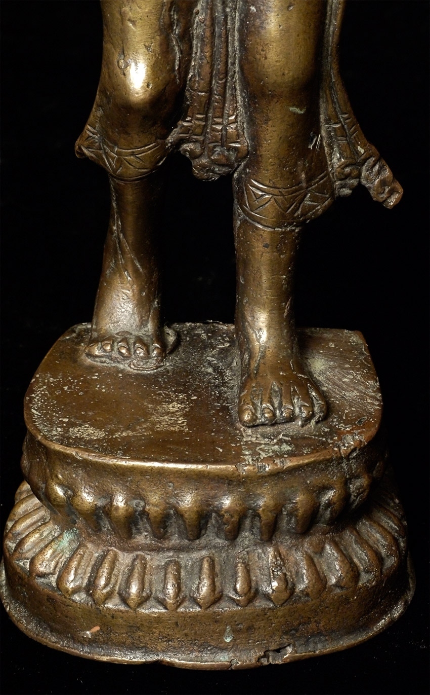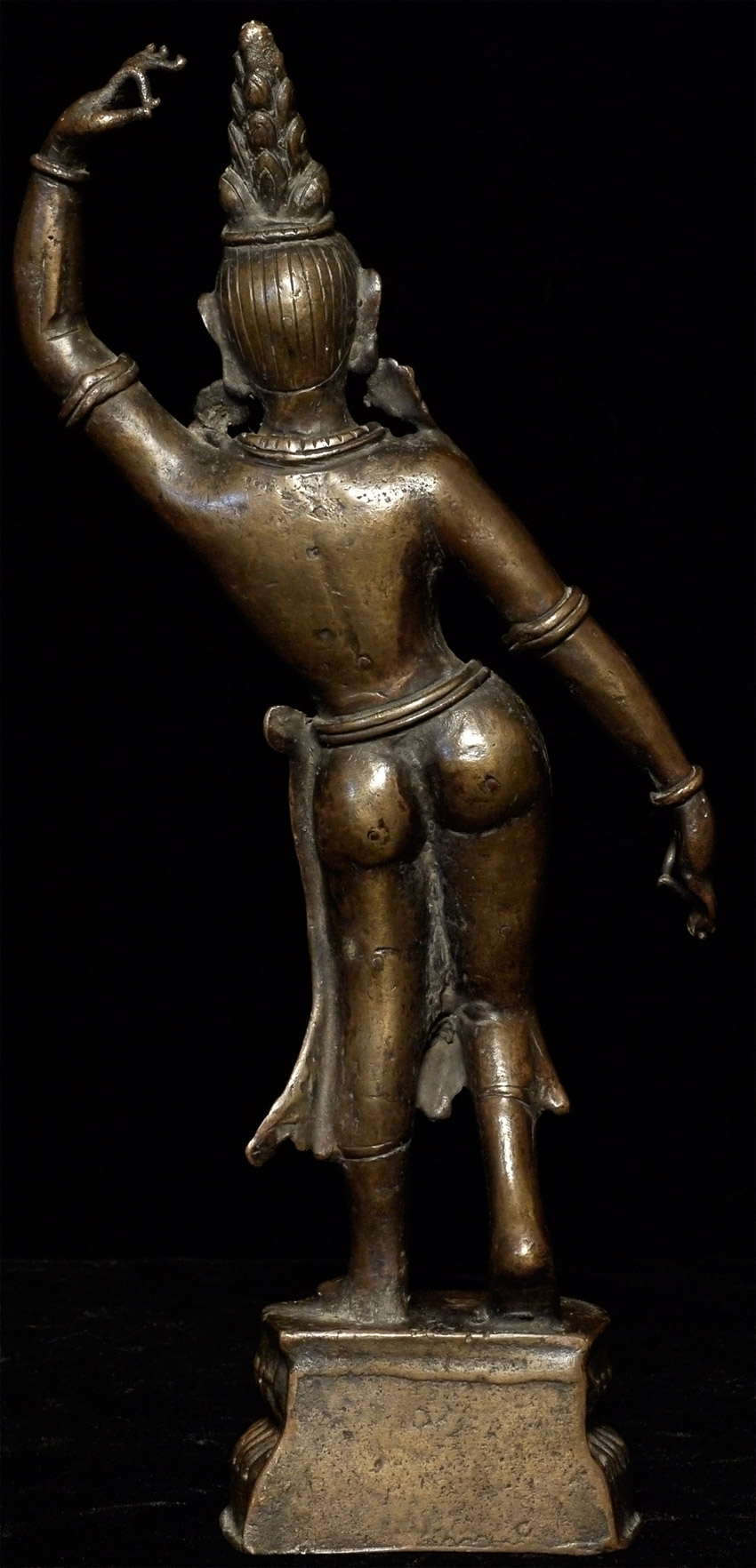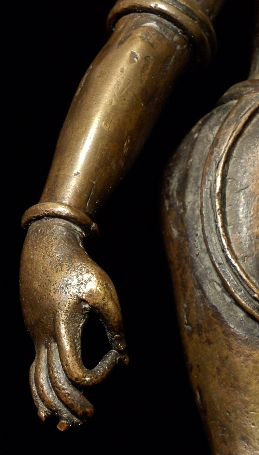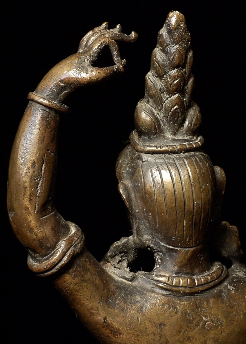 A Superb Nepalese Bodhisattva. Note how the graceful shapes of the fingers echo the hair and the earrings. Also, note the grace and elegance in the fingers and head dress. Stands 9.75 inches tall.