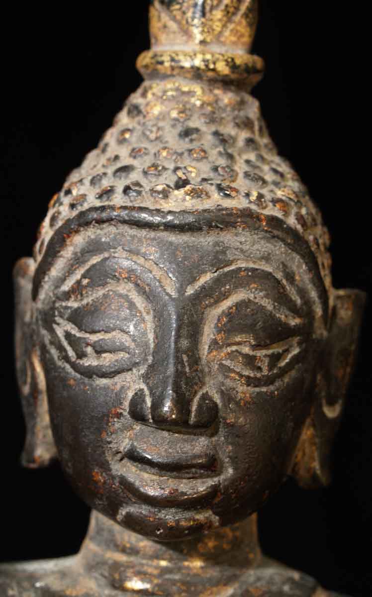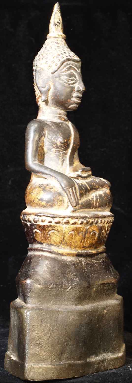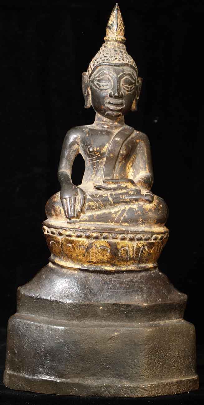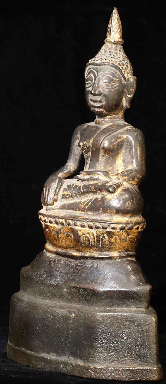 This is an authentic Fang style Northern Thai bronze Buddha. They have a very distinctive look to their faces, and are often mis-categorized as being from Laos. Fang (now a city you can find on the map) was once one of the Kingdoms in the area which is now Northern Thailand. (Note: there are many copies of this style out there, so be careful ). Sits 8.5 inches tall on his base, which is more elaborate than typical bases on this type of Buddha. Look in to his face…………..