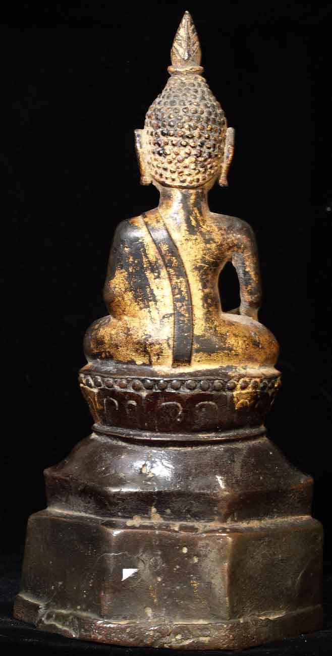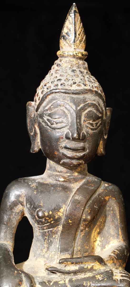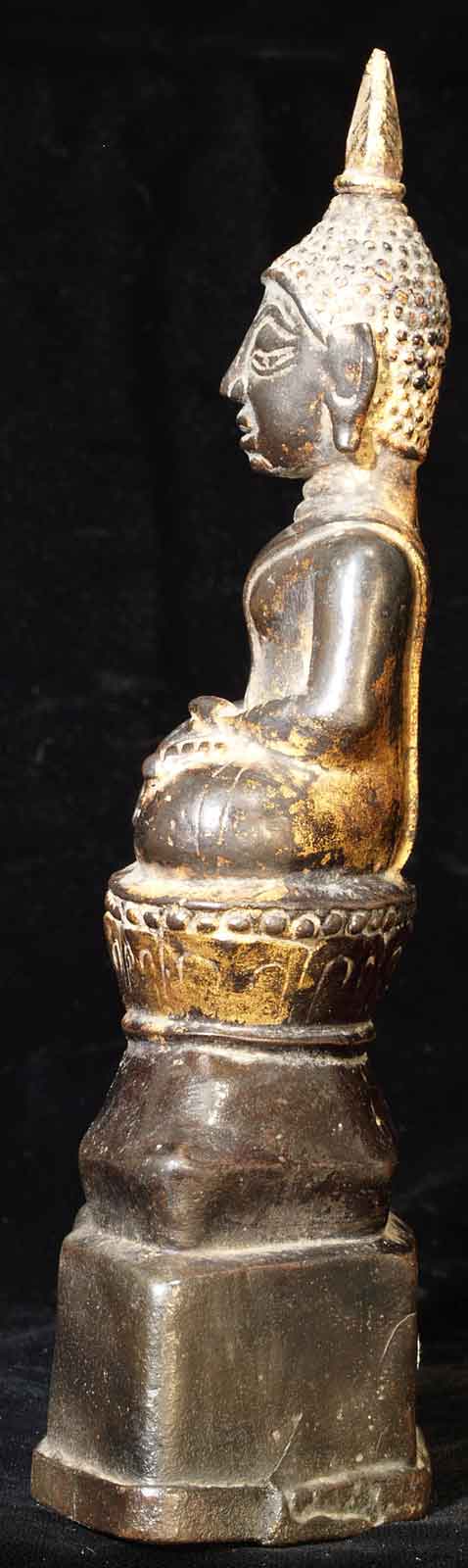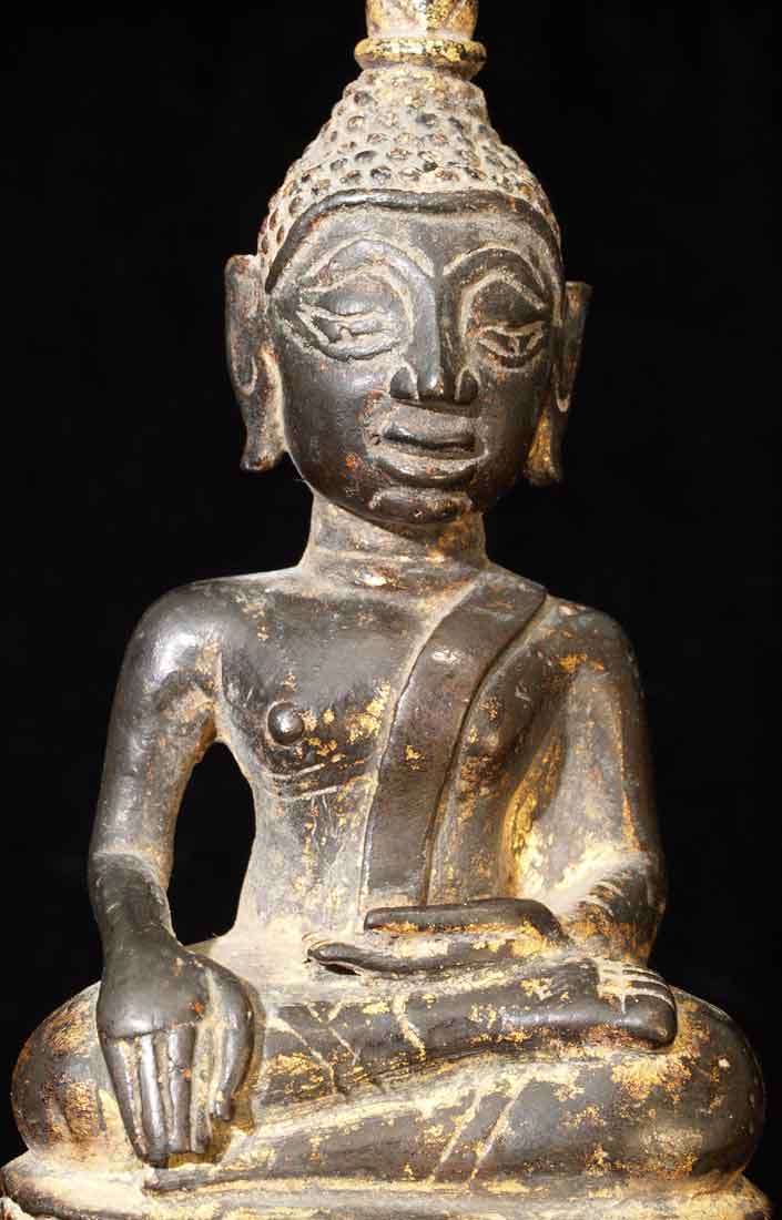 This is an authentic Fang style Northern Thai bronze Buddha. They have a very distinctive look to their faces, and are often mis-categorized as being from Laos. Fang (now a city you can find on the map) was once one of the Kingdoms in the area which is now Northern Thailand. (Note: there are many copies of this style out there, so be careful ). Sits 8.5 inches tall on his base, which is more elaborate than typical bases on this type of Buddha. Look in to his face…………..