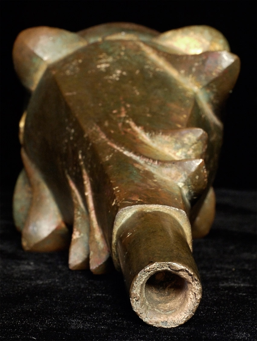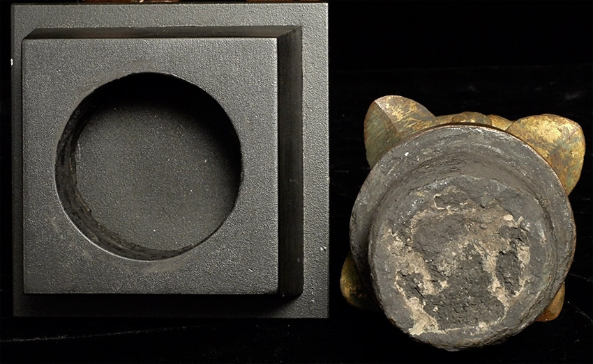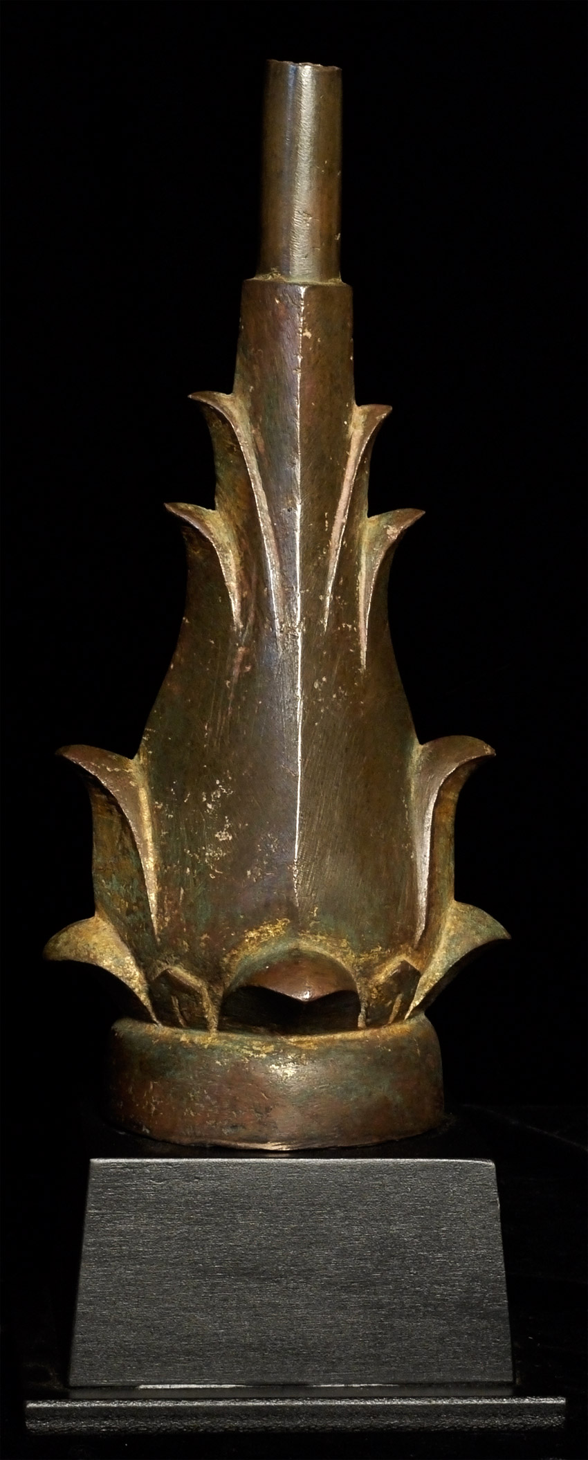 Massive Buddha flame from a monumental Buddha--stood a good 10 to 12 feet tall! Traces of gilding. Likely had a pure gold tip which was melted down hundreds of years ago. Wonderful! Extremely heavy. Never seen another this massive available for sale. 13 1/8 inches tall, base elevates it to 14, bottom of base is 5 1/2 inches square. Probably 16th/17thC, almost certainly later than 18thC.
