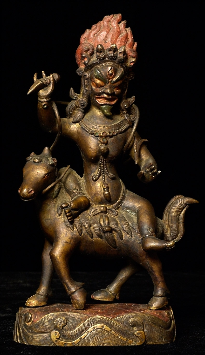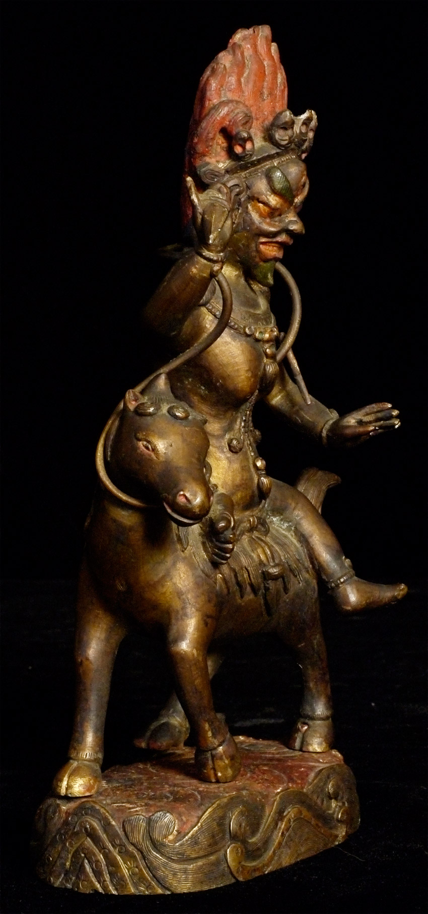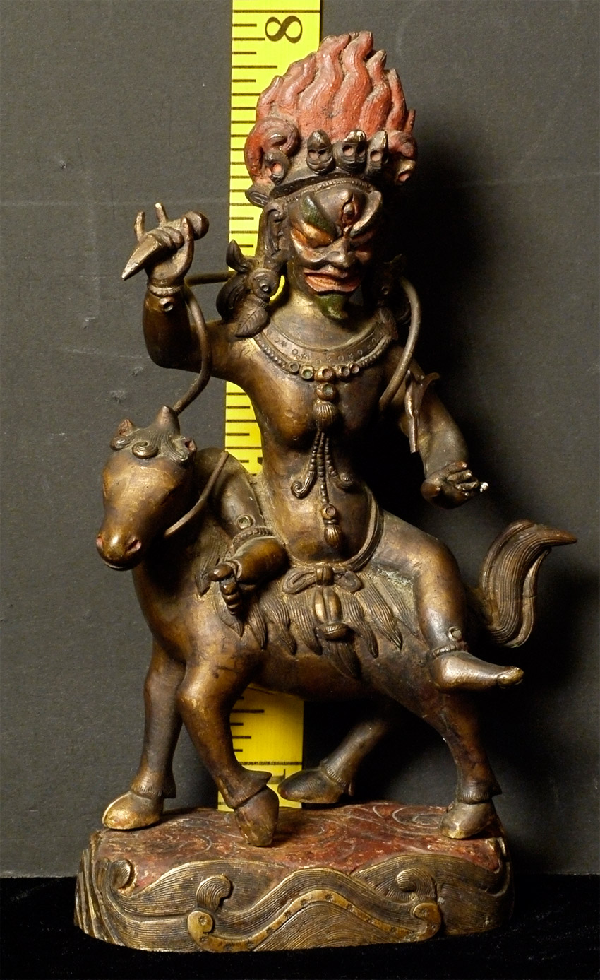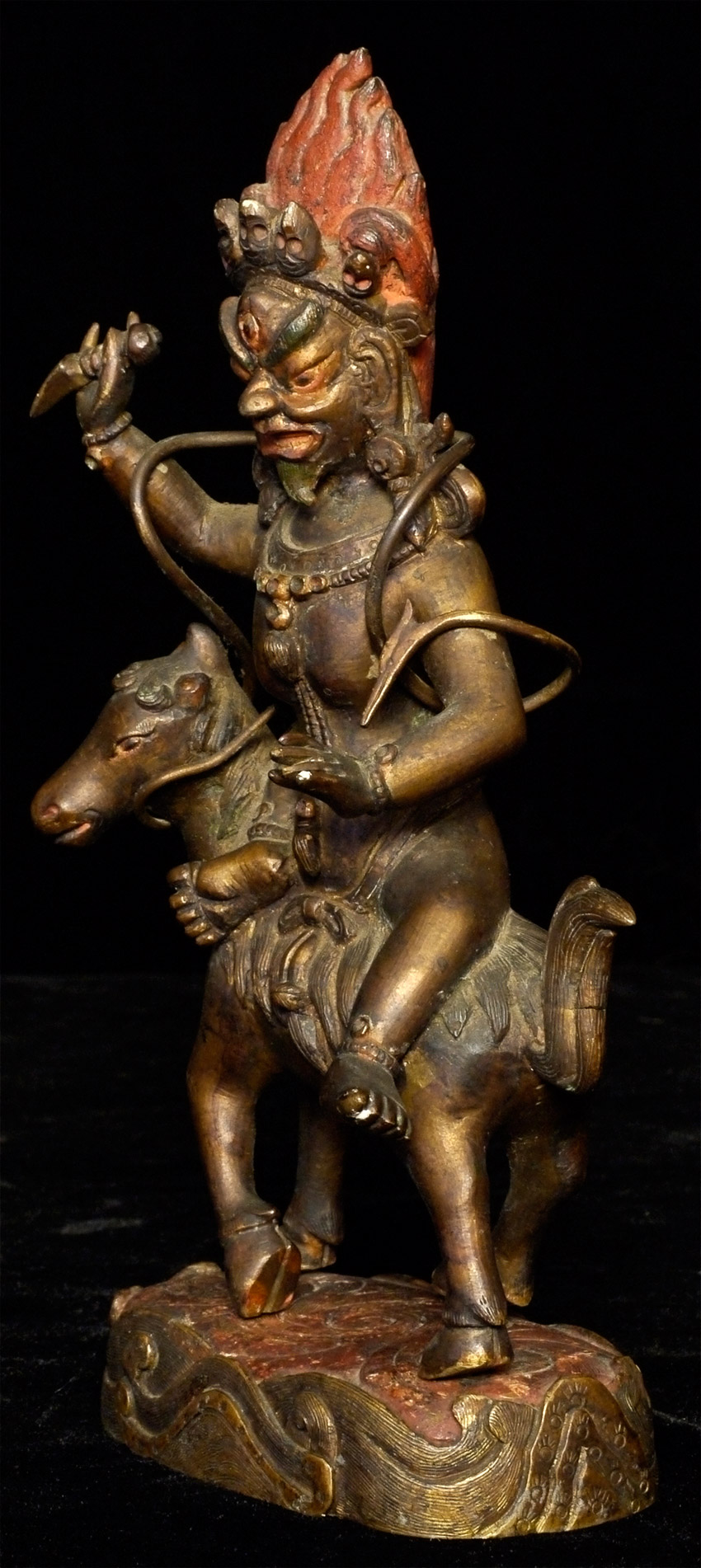 19thC Mongolian Deity on Horse. Particularly expressive example (and especially wonderful horse!). Unususal alloy sometimes seen in Mongolia. 8 inches tall