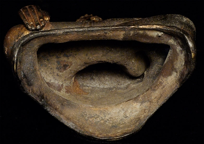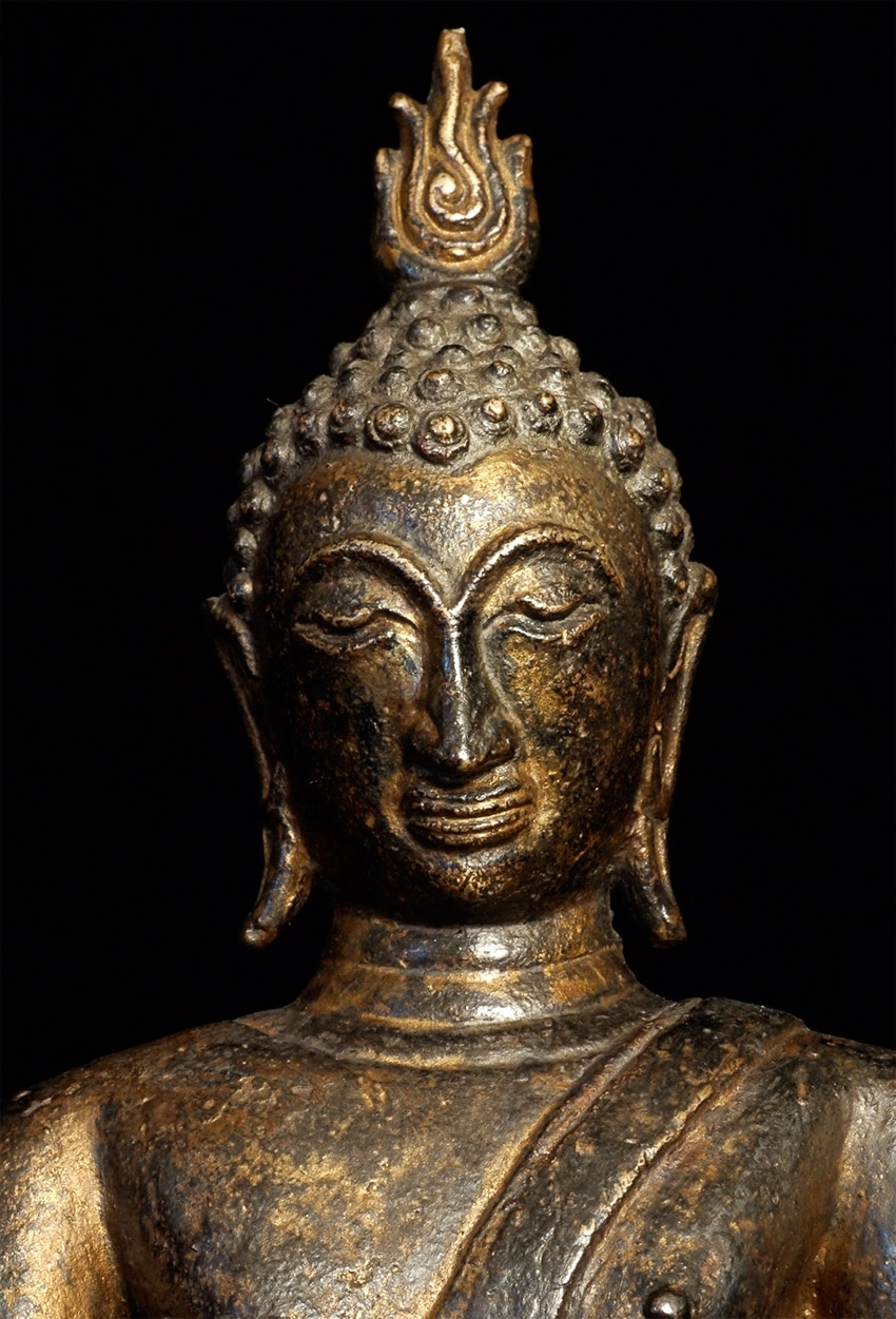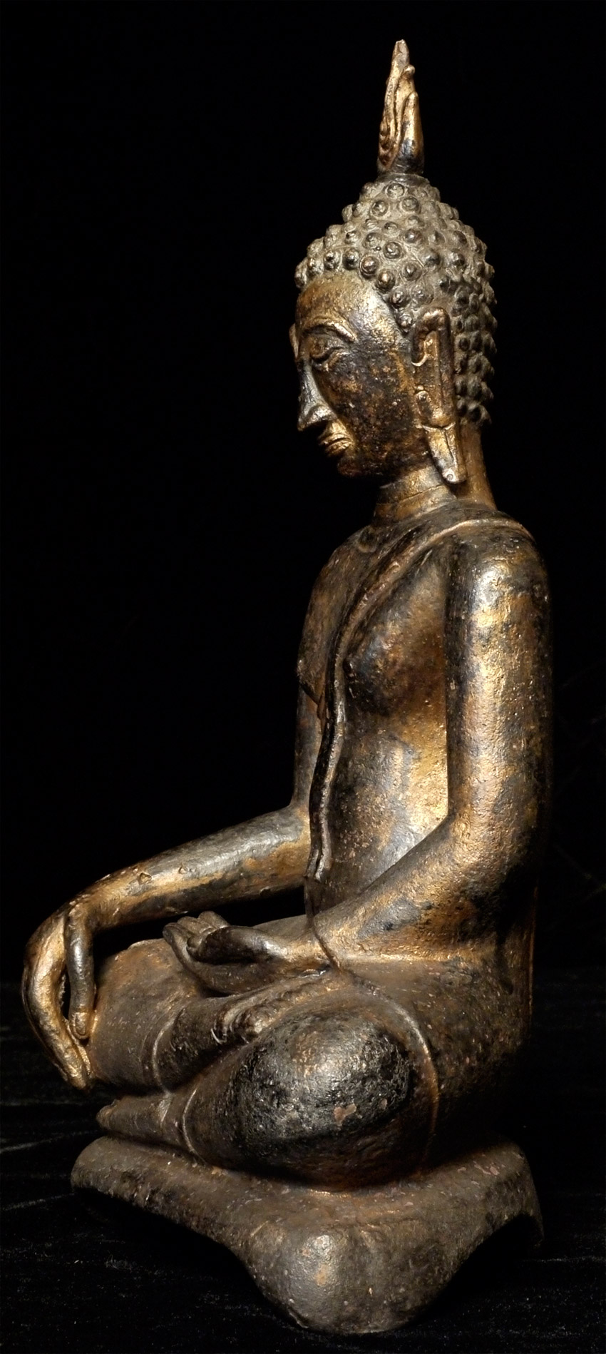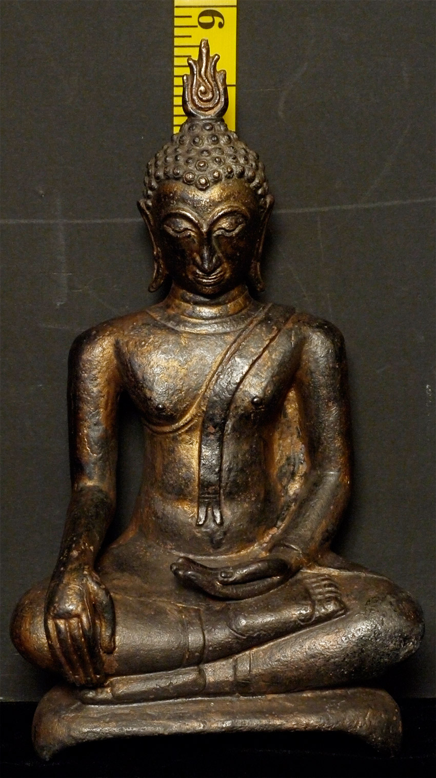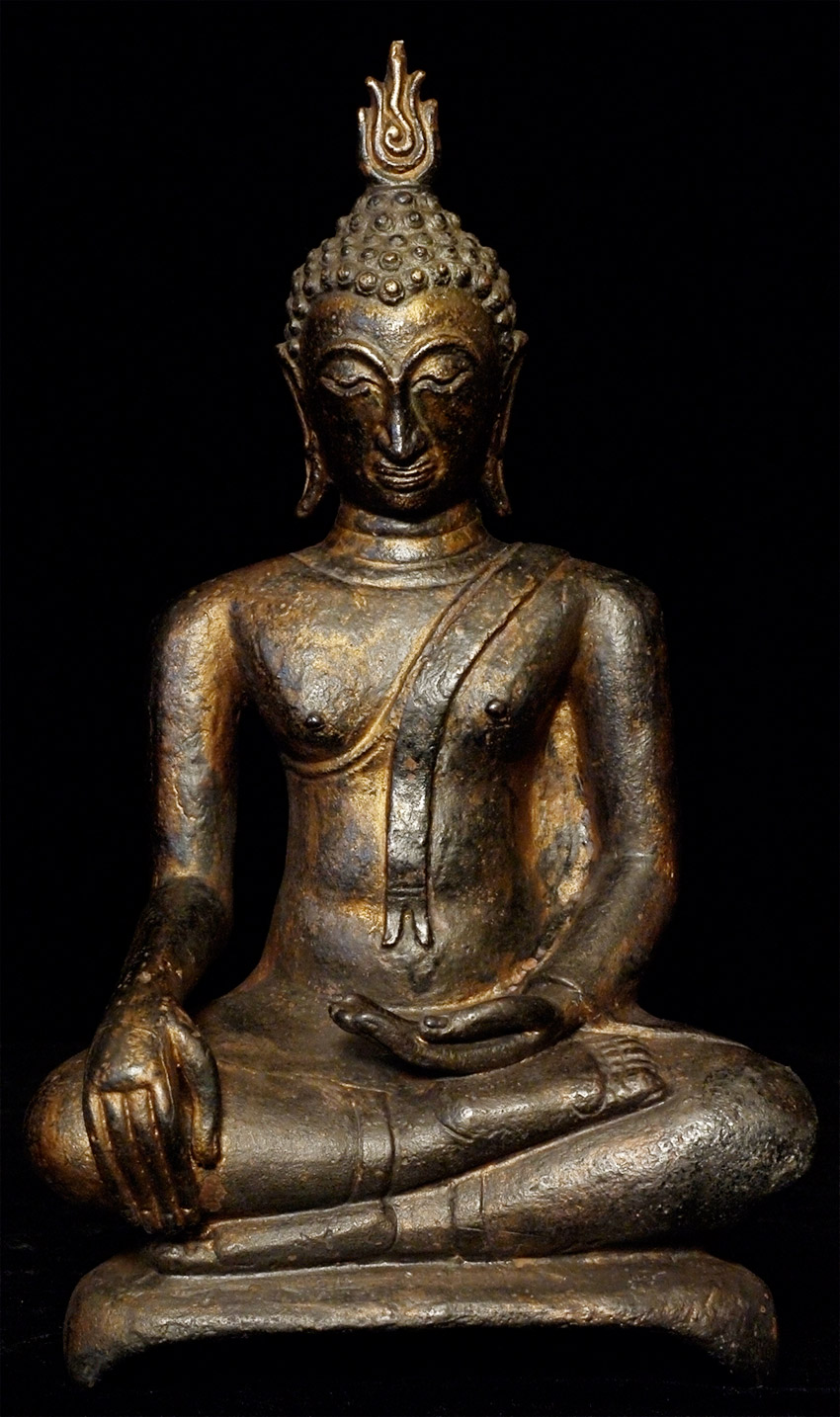 Fine 14thC sitting Sukhothai Buddha. This type rare to fine in sitting posture from this period in this size.Few portable bronze examples like this exist. Sits 8 5/8 inches tall. Face is very different than other Thai Buddhas.