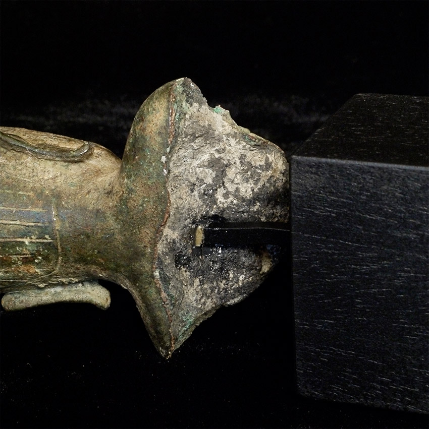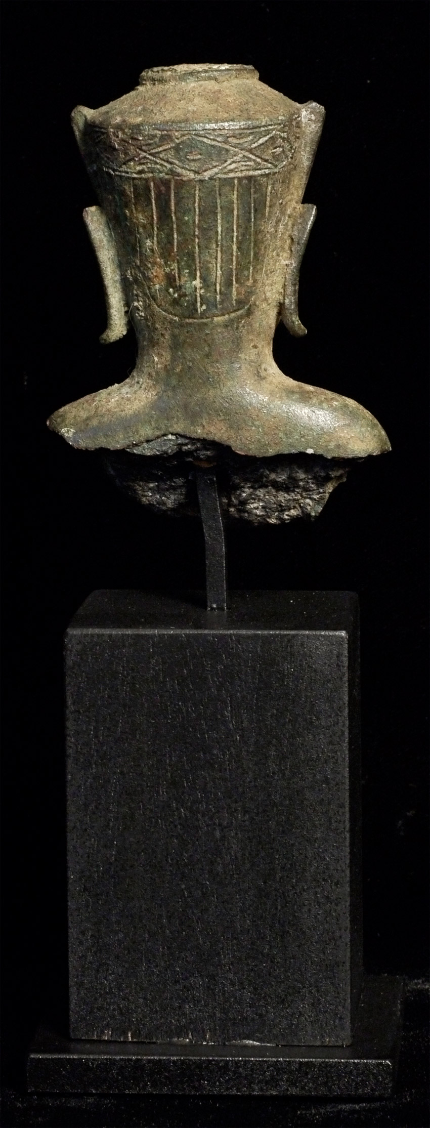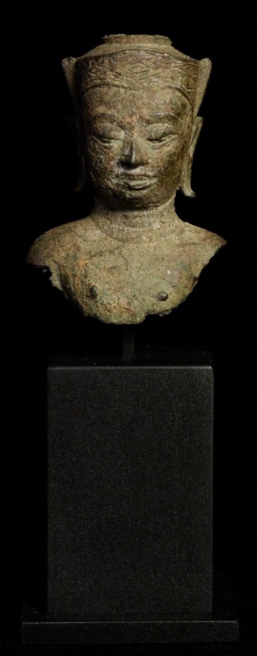 Very good 16/17thC Ayuthaya bronze bust on recently made custom stand. Bust is 3 1/8 inches high, total height on stand is 6 3/8 inches. Classic example of its type