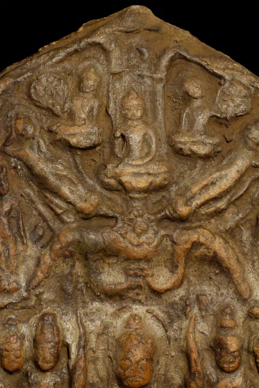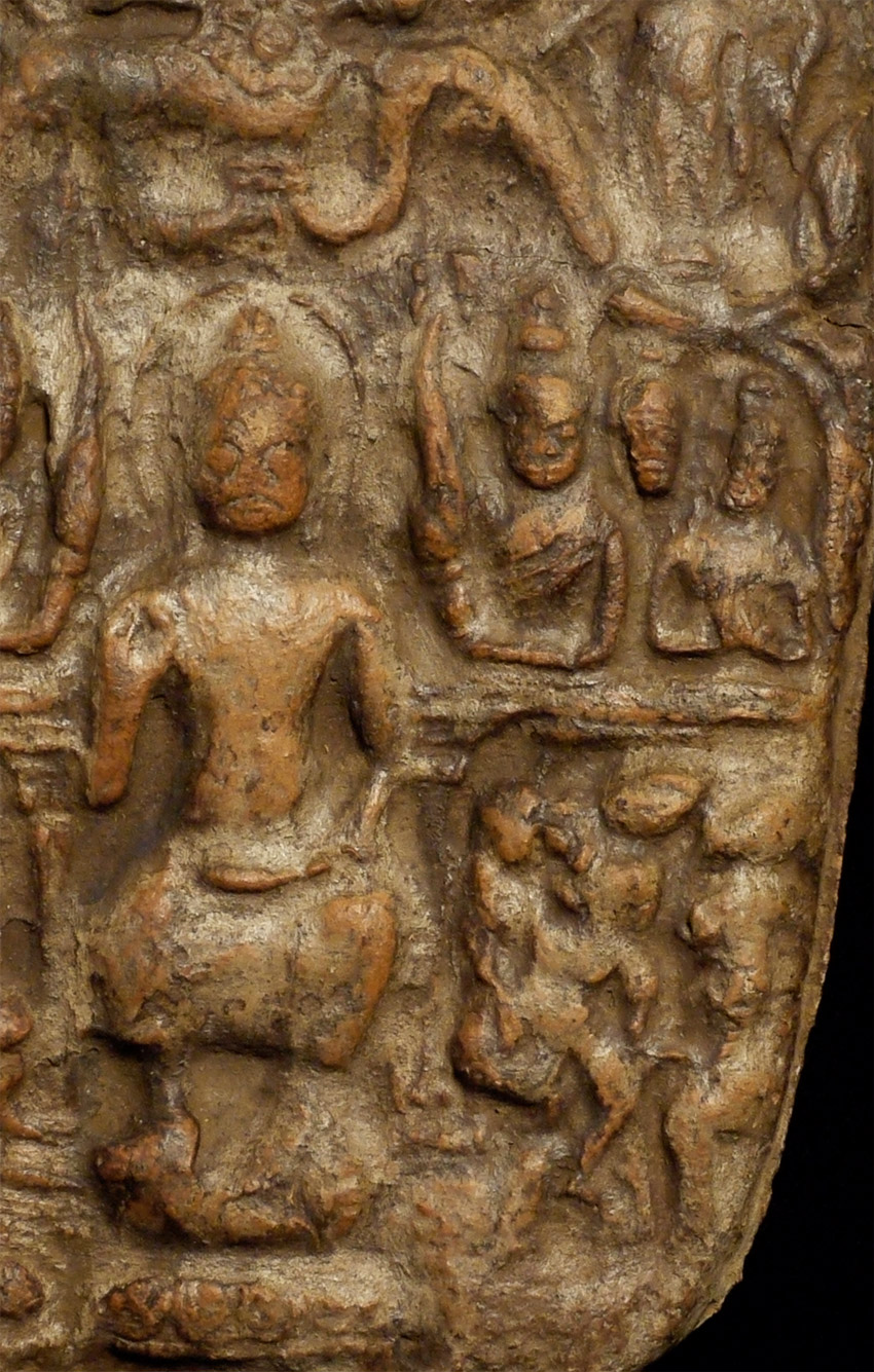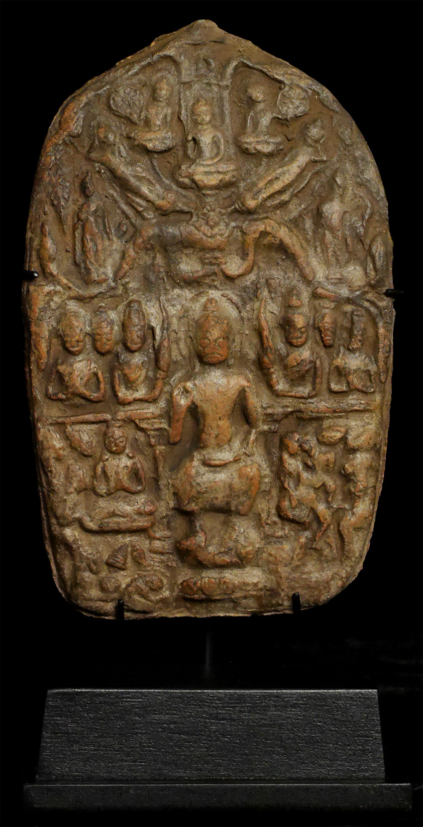 Large, wonderful Dvarati clay/terracotta Buddha plaque with devotees and possibly stories from the life of the Buddha. Size is 5 inches tall, 6.75 on custom stand. Probably 8 to 11thC, and from somewhere in what is currently modern Thailand or possibly Burma.