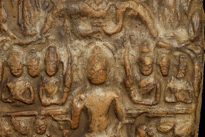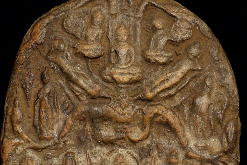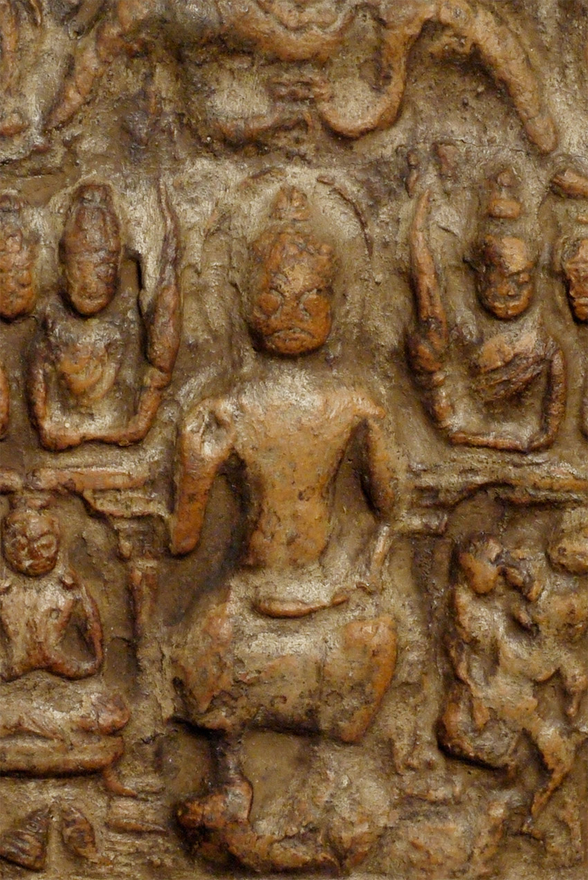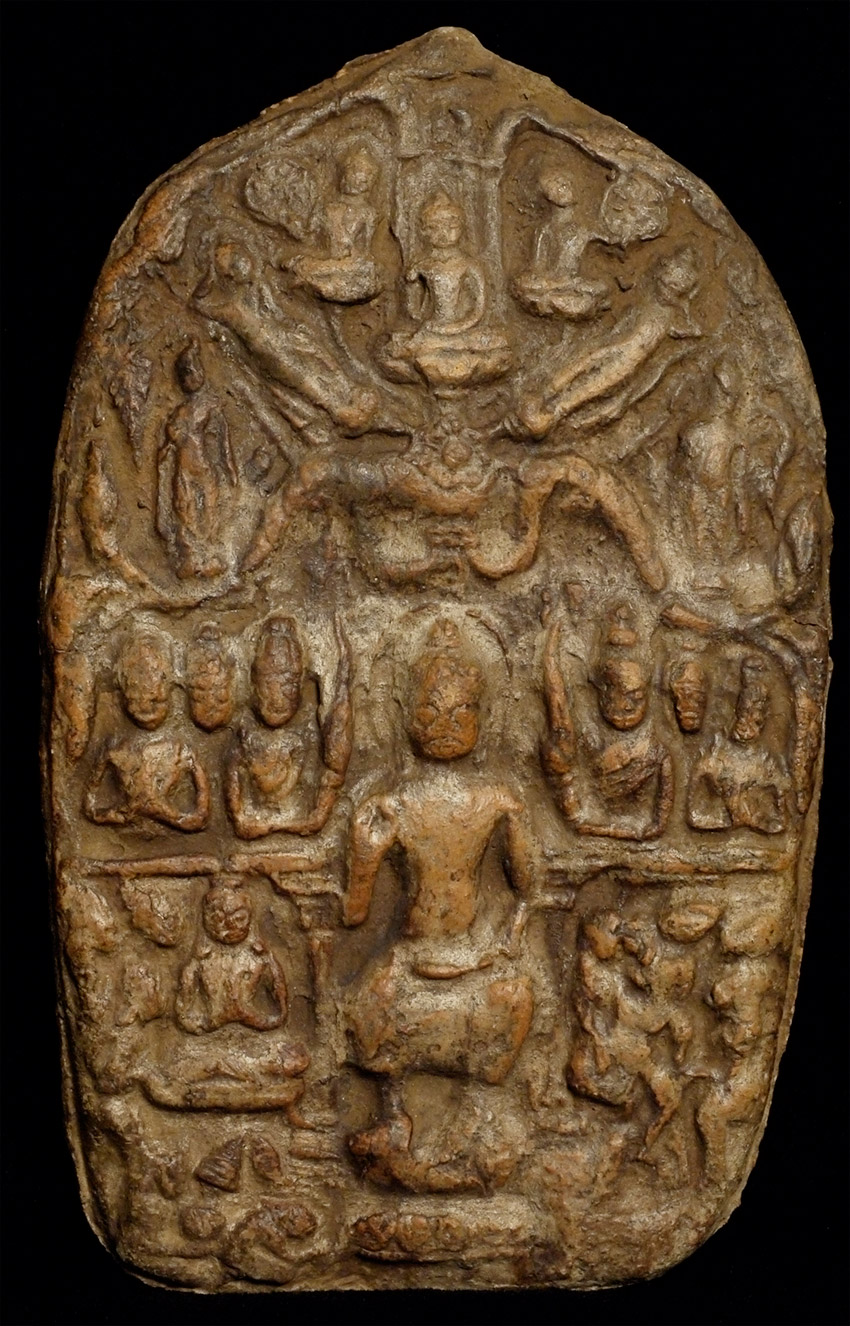 Large, wonderful Dvarati clay/terracotta Buddha plaque with devotees and possibly stories from the life of the Buddha. Size is 5 inches tall, 6.75 on custom stand. Probably 8 to 11thC, and from somewhere in what is currently modern Thailand or possibly Burma.