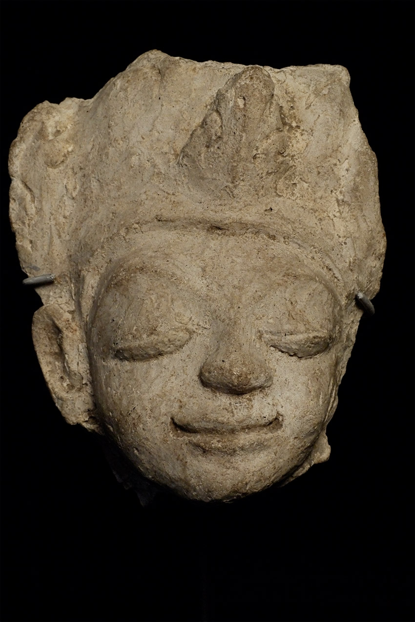A long time personal favorite. Northern Thai early Haripunchai face of a Buddha or other Buddhist figure that was original part of a stucco wall. Probably 9/19thC give or take a century or 2. One of my all-time favorite faces. Head is approximately 4 inches tall, the height on stand is approximately 6.5 inches