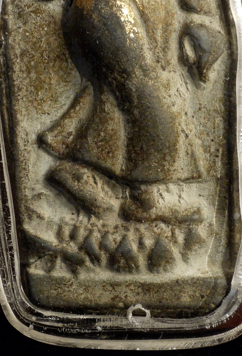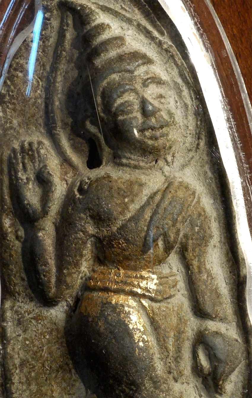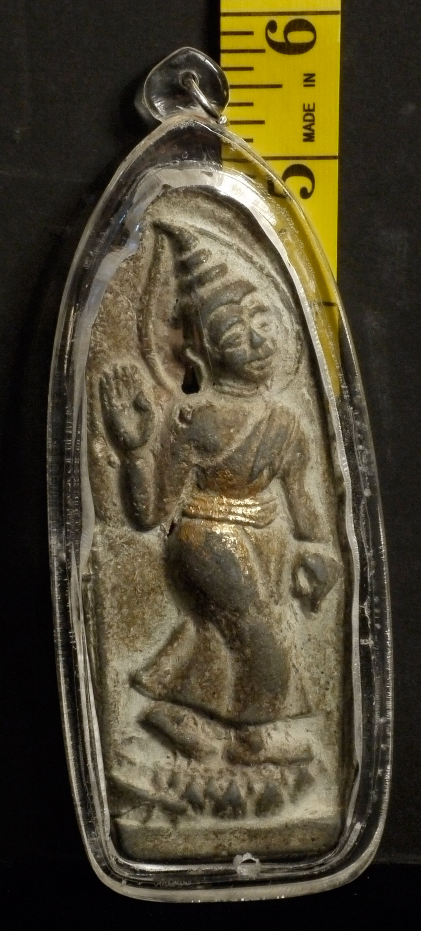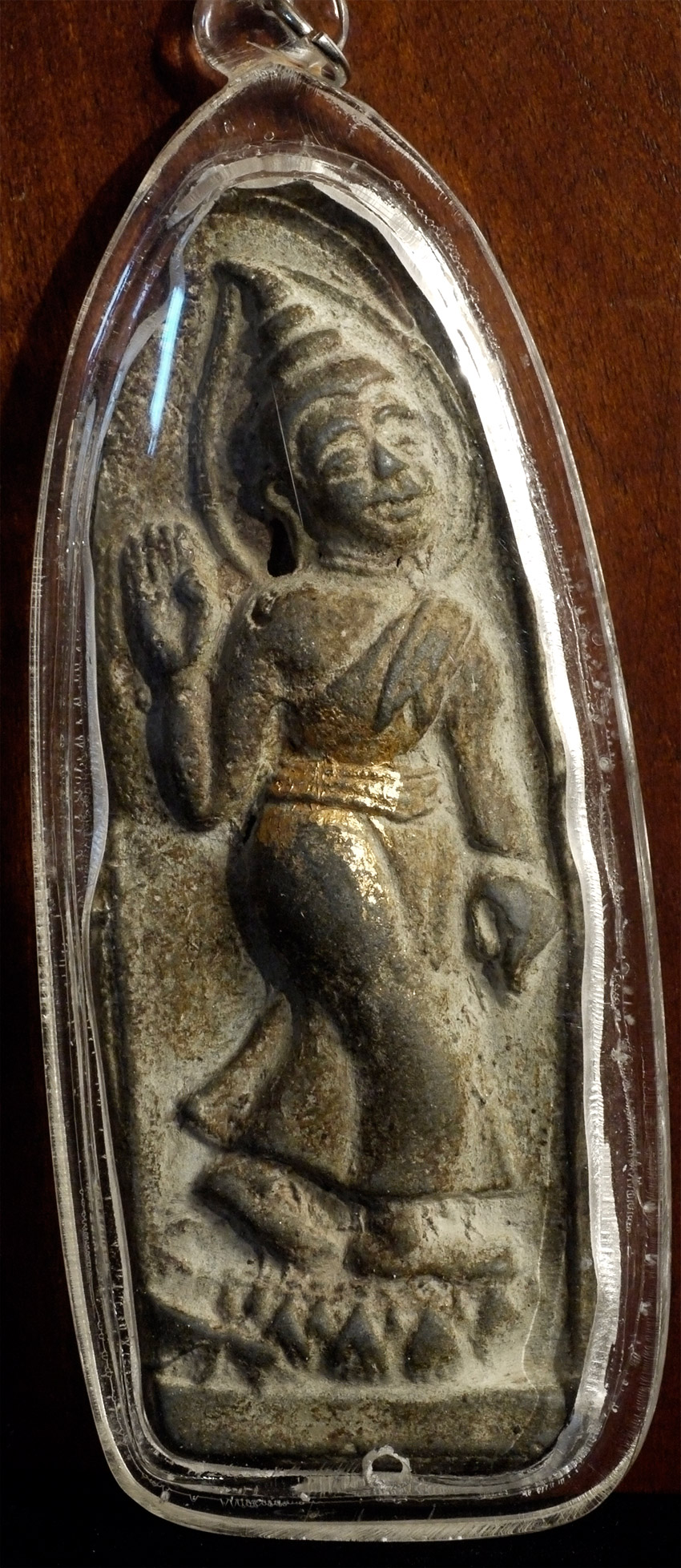 Remarkable Thai Walking Buddha Bronze Plaque. Remarkable styling, with a unique crown and halo, and animated face. I am not positive where exactly it was made-quite different than Sukhothai classic style- may even be Burmese. I believe it is at least 17thC and possibly a century or 2 earlier. I do not believe it is later based on the patina, wear, and styling, but I did not examine this outside the protective case. Size is large for his type at 5 inches tall, plastic amulet case height is 5.75 inches.
