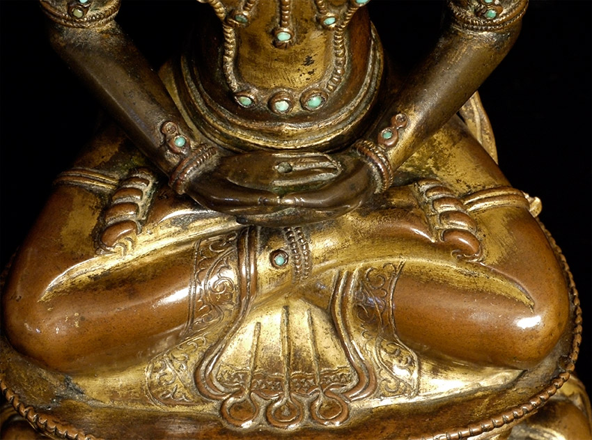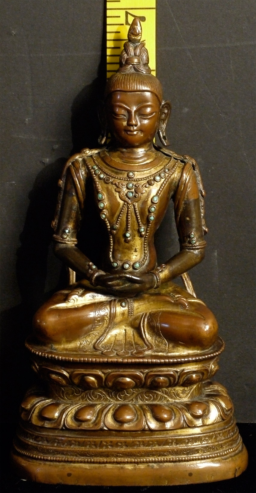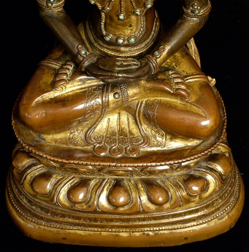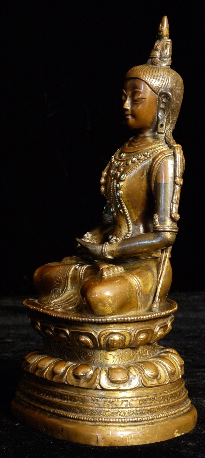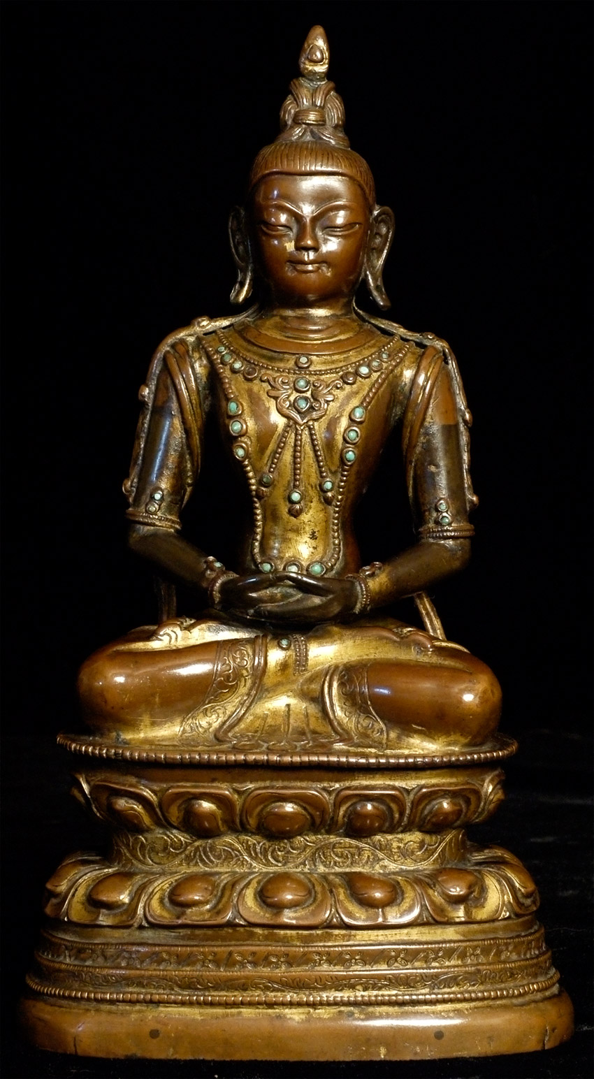 18thC Tibetan Copper Repousse Amateyus-Bodhisattva of long life. Extremely fine example of it's type- you are unlikely to ever see one of its type at any price that is better. Sits a full 6 7/8 inches tall