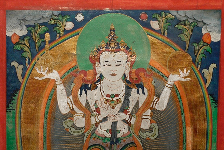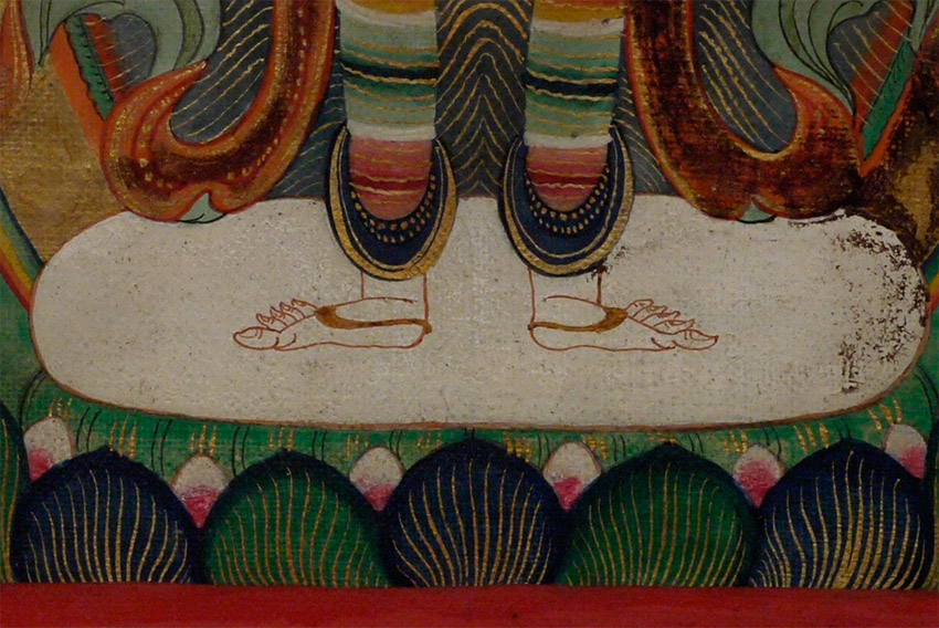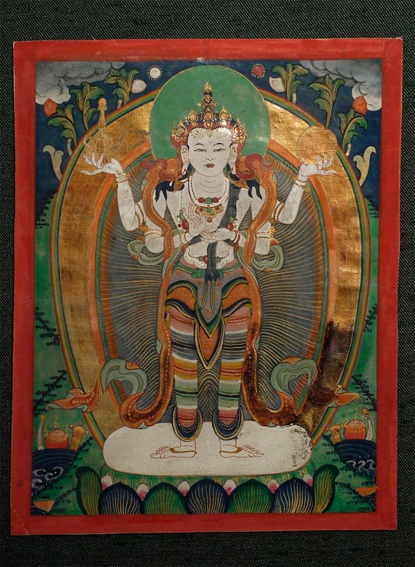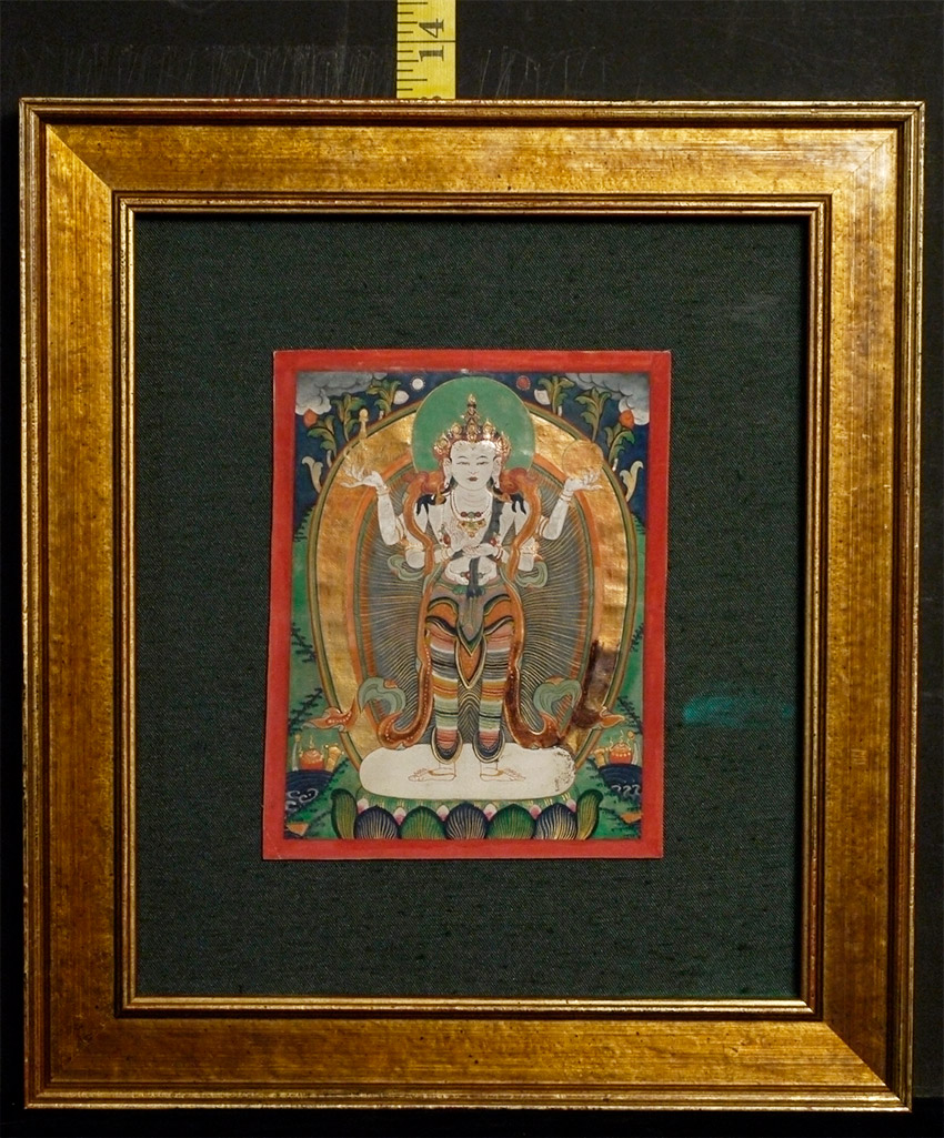 Supremely beautiful antique Mongolian Thangka. Framed to a high standard with museum glass and hand wrapped silk matting. One of the nicest small ones in my personal collection. Purchased in the mid-1990's when Mongolia was just beginning to open to the west and the very best was still available. Even then this was relatively expensive. Size of Thangka is 5.25 x 6.75 inches, frame measures 11 7/8 x 13 1/8