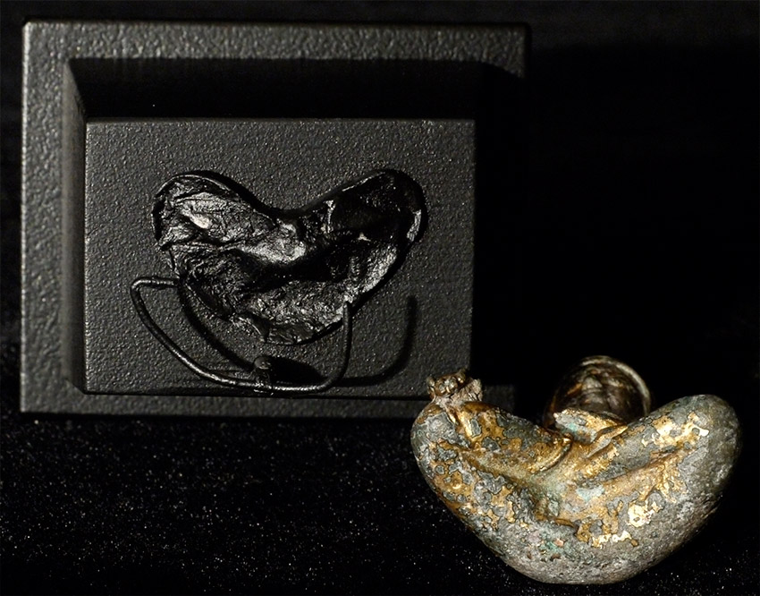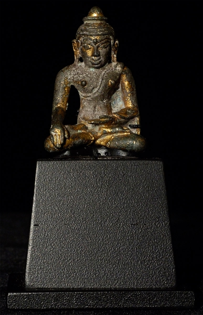 12thC solid cast Burmese Pagan bronze Buddha. I've seen 2 others of this type over the past 25 years, and unlike those examples, this one still retains much of it's original thick, high karat gilding. Sits only 2.25 inches tall but exudes a presence which is much larger. Height on custom stand is 4.25 inches.