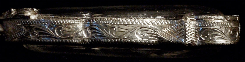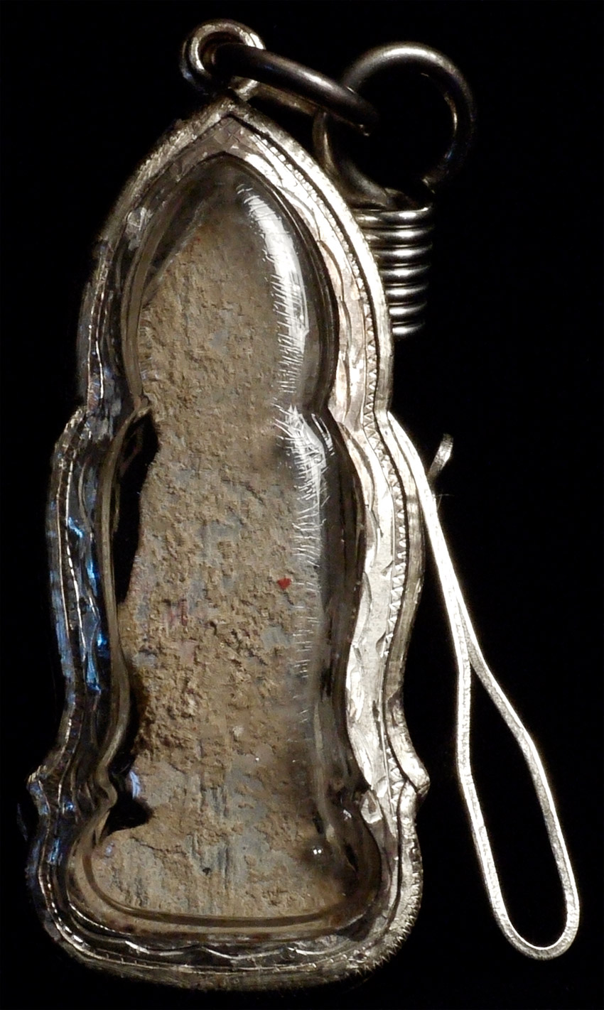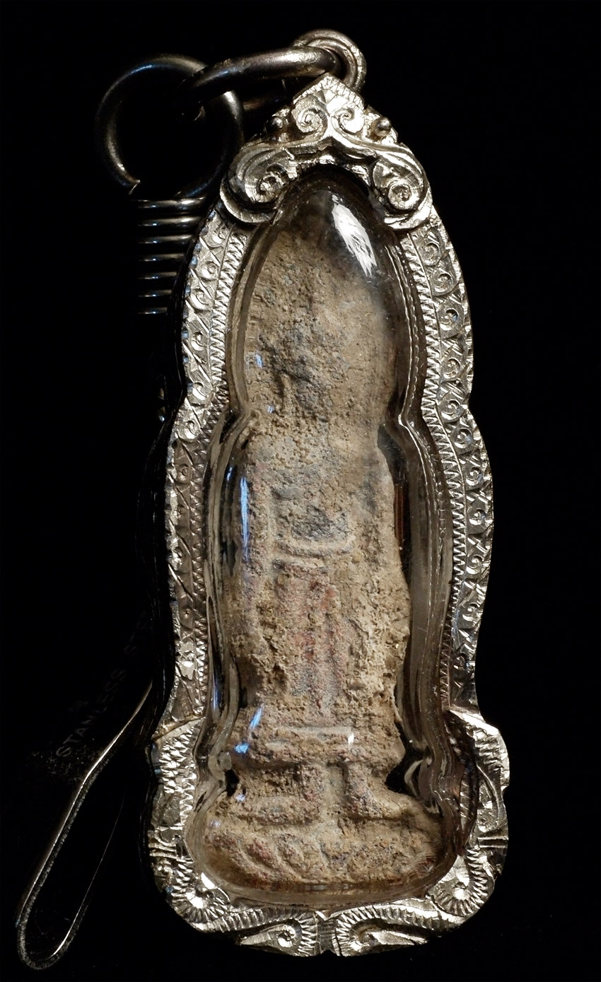 Authentic 14/15thC Khmer Northern Thailand of a standing Buddha from the Ancient City that preceded Chian Seng in the North of Thailand. Probably made of a lead/silver alloy, but hard to know under the strong burial patina. Excavated with a cache of dozens of identical examples in a a container in the forest, probably in the early 1960's. I managed to acquire 8 of them. From a large collection put together in the 1960's and 70's. This is a spectacular example of an authentic amulet in a perfect small size-almost impossible to find. In a modern silver and plexi-glass amulet case. Amulet is 2 1/8 inches tall.