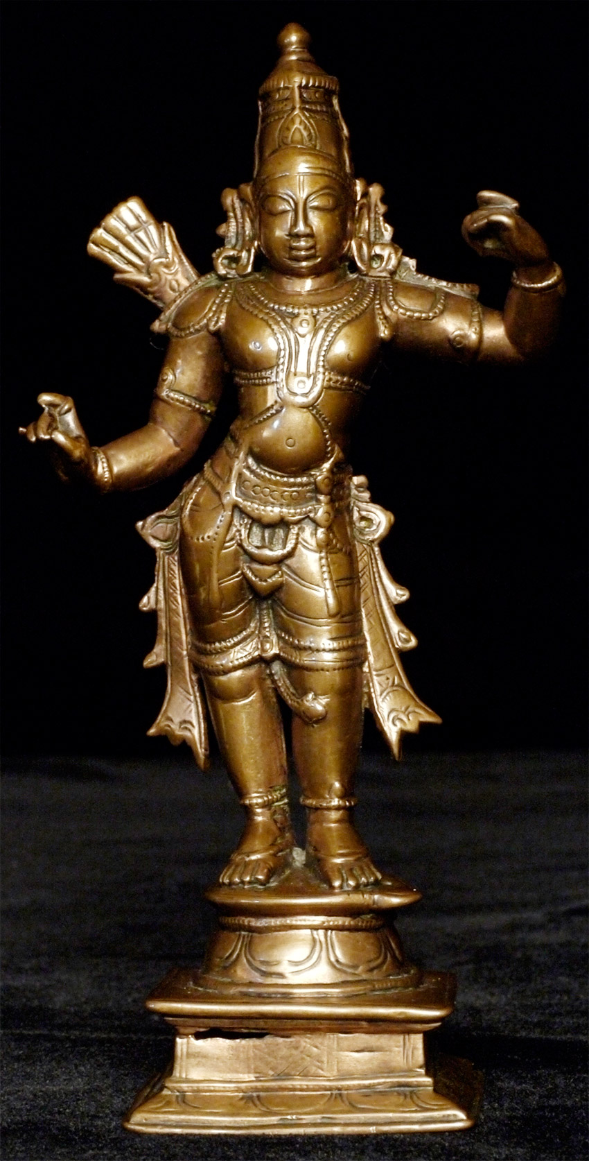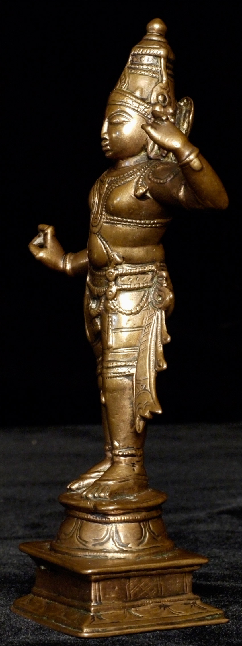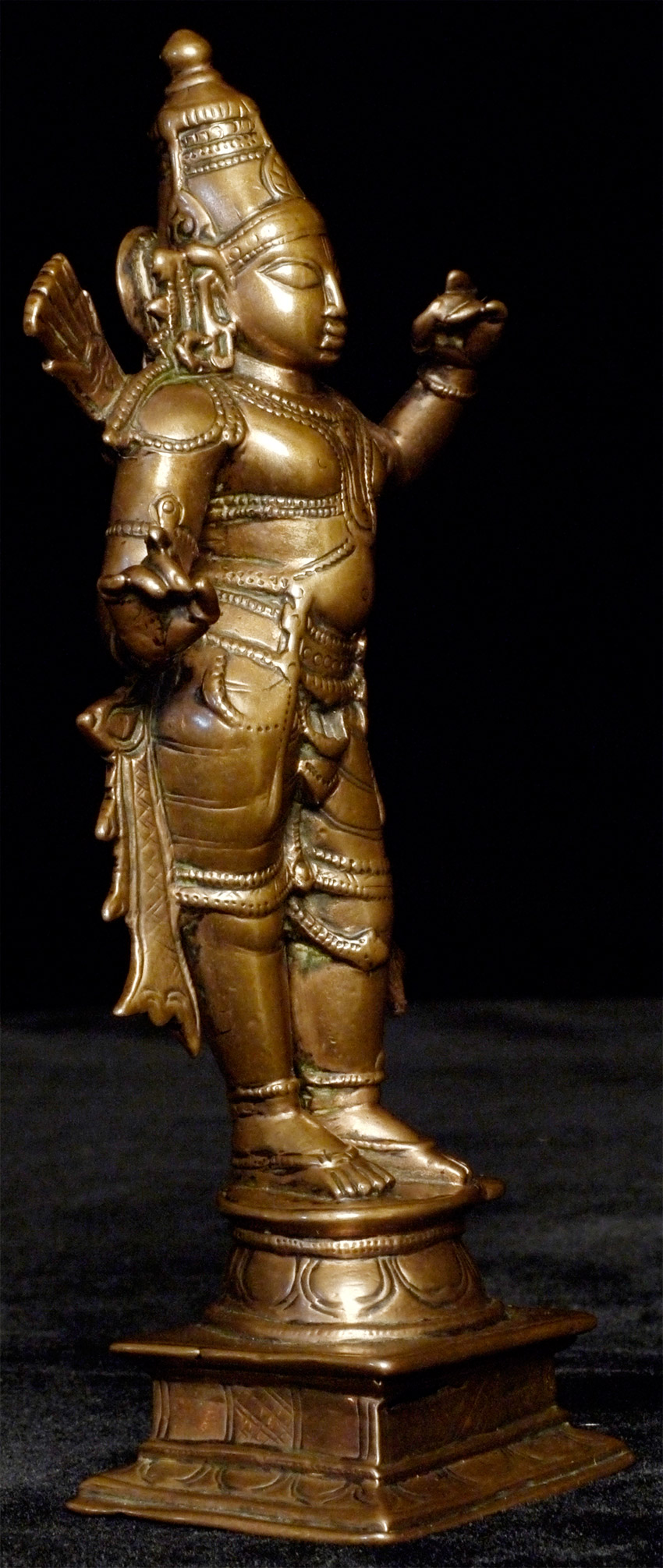Extremely finely sculpted, cast and finished Rama or his brother Lakshmana created out of a very high quality alloy that appears to contain precious metal. Probably 17/18thC, though I am not expert on dating this type. Stands a full 5 5/8 inches tall, and quite heavy for its size. Really stands out as a quality example.