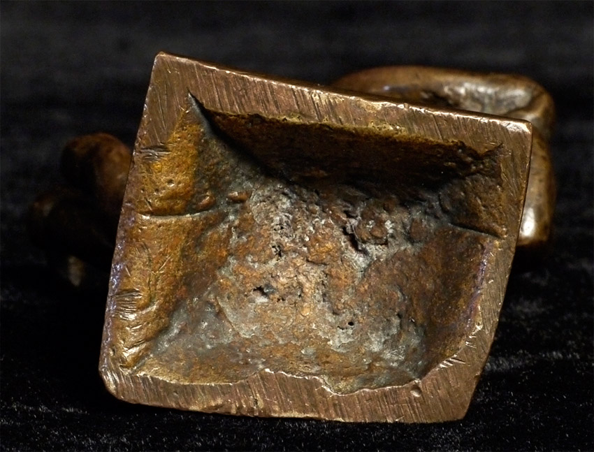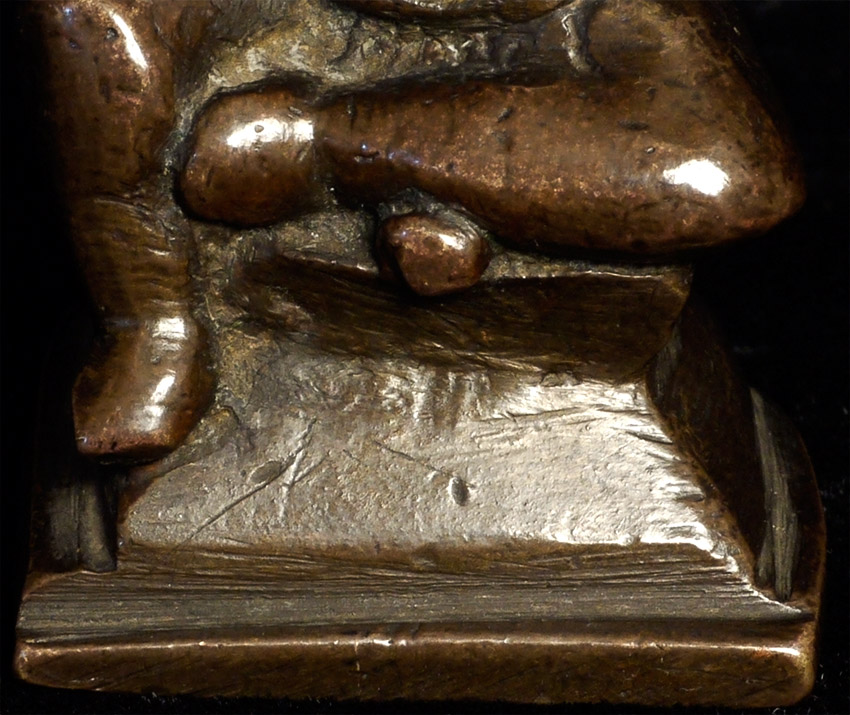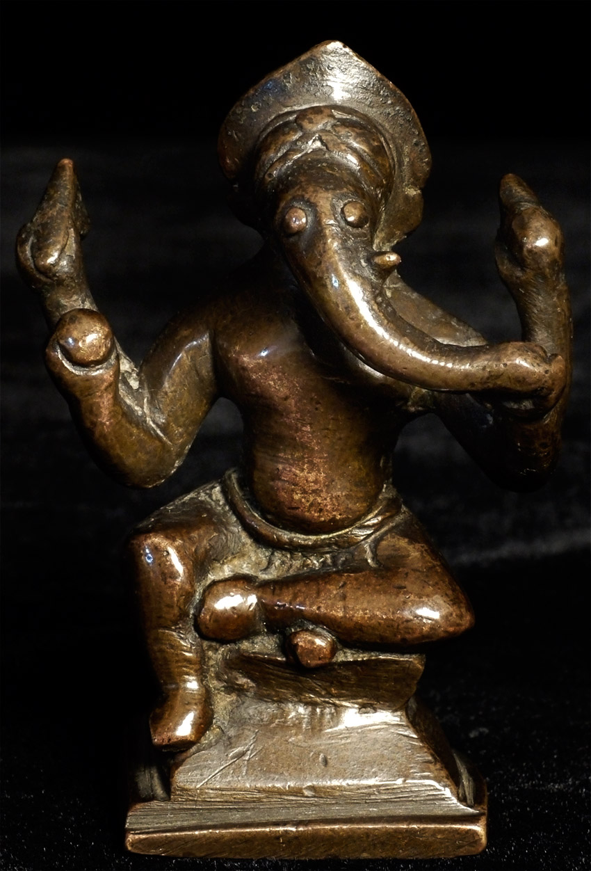 Antique bronze Ganesh from India. Delightfully quirky face that shows his big personality in his little body. Nice chocolate brown patina. Unusual type. Ganesh is 2 7/8 inches tall.