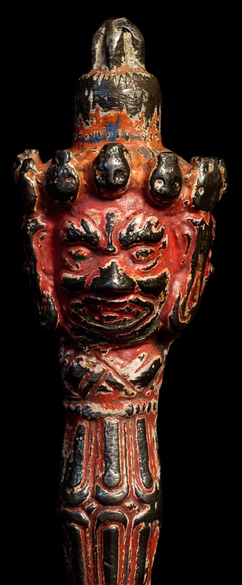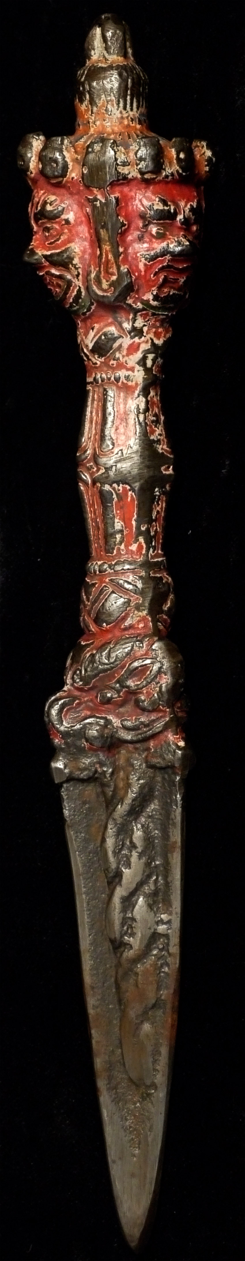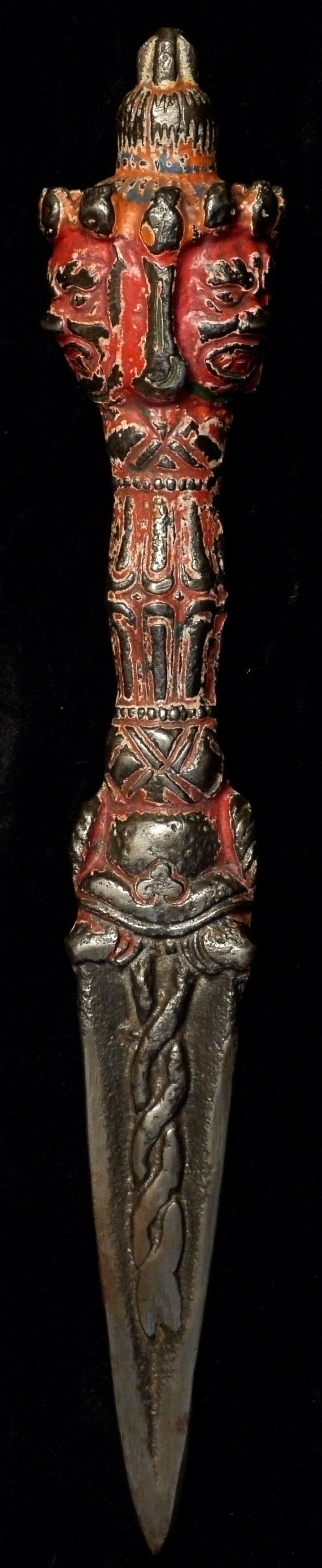 Antique Tibetan Iron (sky iron?) Phurba with red polychrome. At some other point someone tried to sharpen it a bit. Not as finely cast as some, but has an incredibly powerful feeling to it. Unusual sheen to the iron alloy-possibly made of "sky iron" (gathered up small meteorites melted down to make Phurba)Size is 8.25 inches long. Probably 19thC.