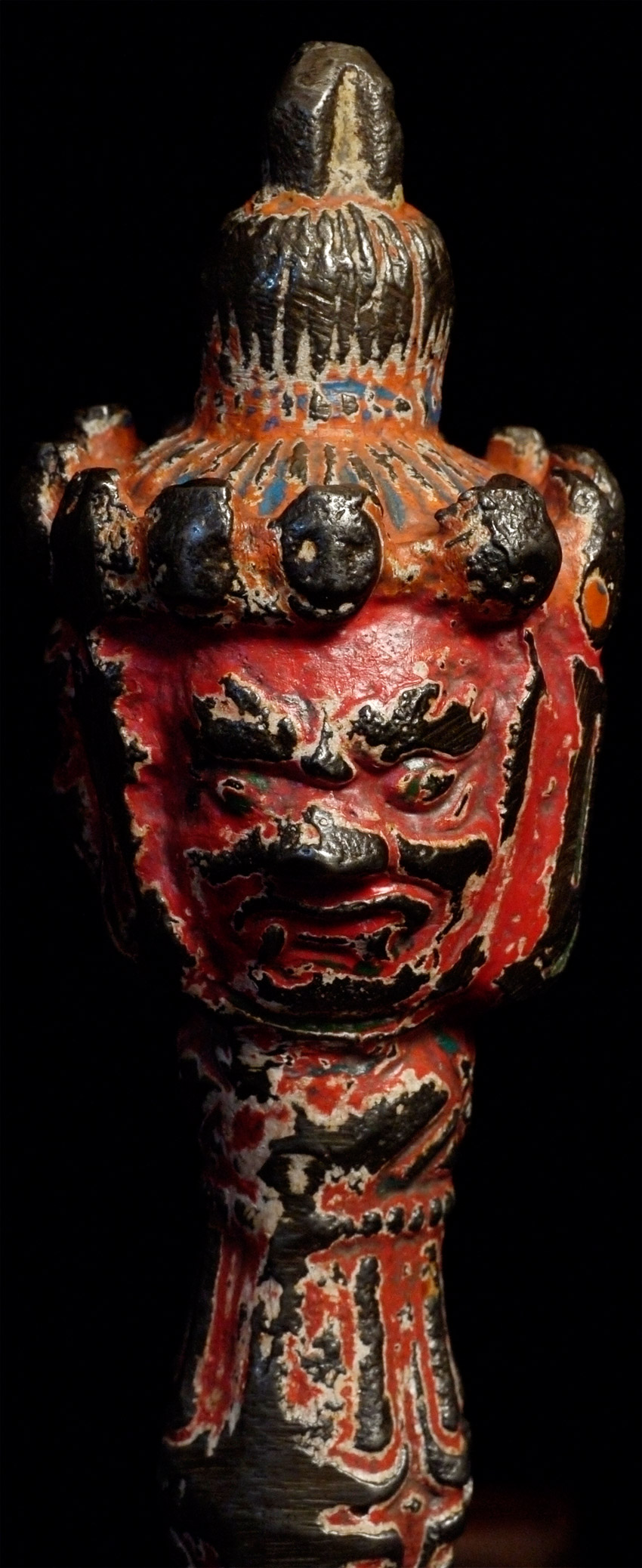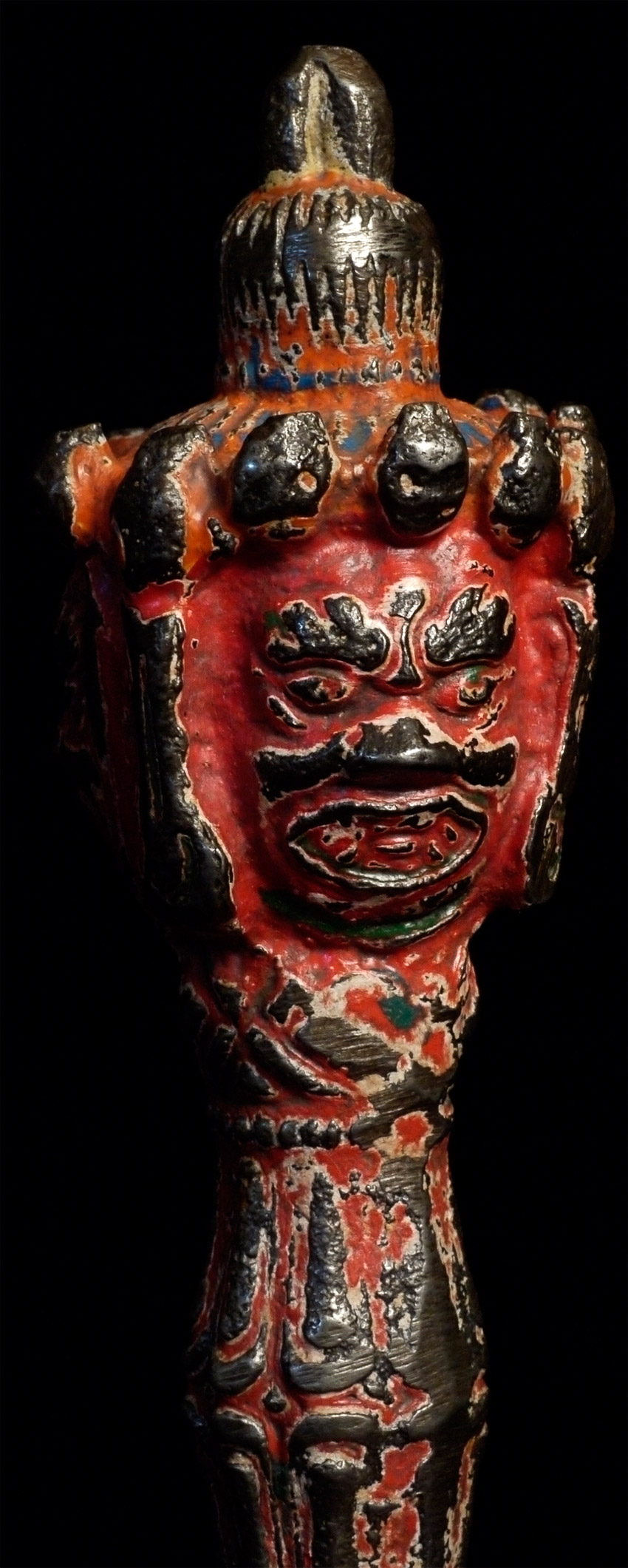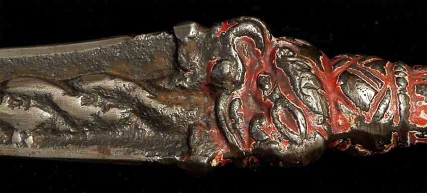 Antique Tibetan Iron (sky iron?) Phurba with red polychrome. At some other point someone tried to sharpen it a bit. Not as finely cast as some, but has an incredibly powerful feeling to it. Unusual sheen to the iron alloy-possibly made of "sky iron" (gathered up small meteorites melted down to make Phurba)Size is 8.25 inches long. Probably 19thC.