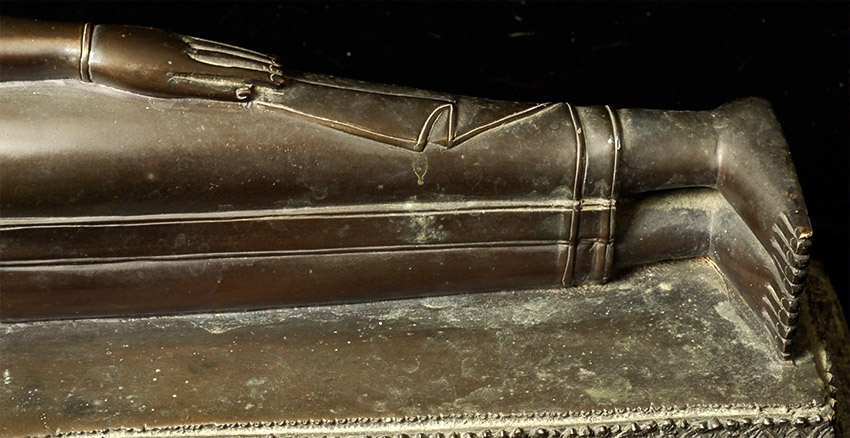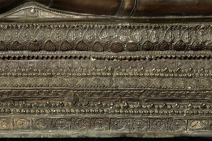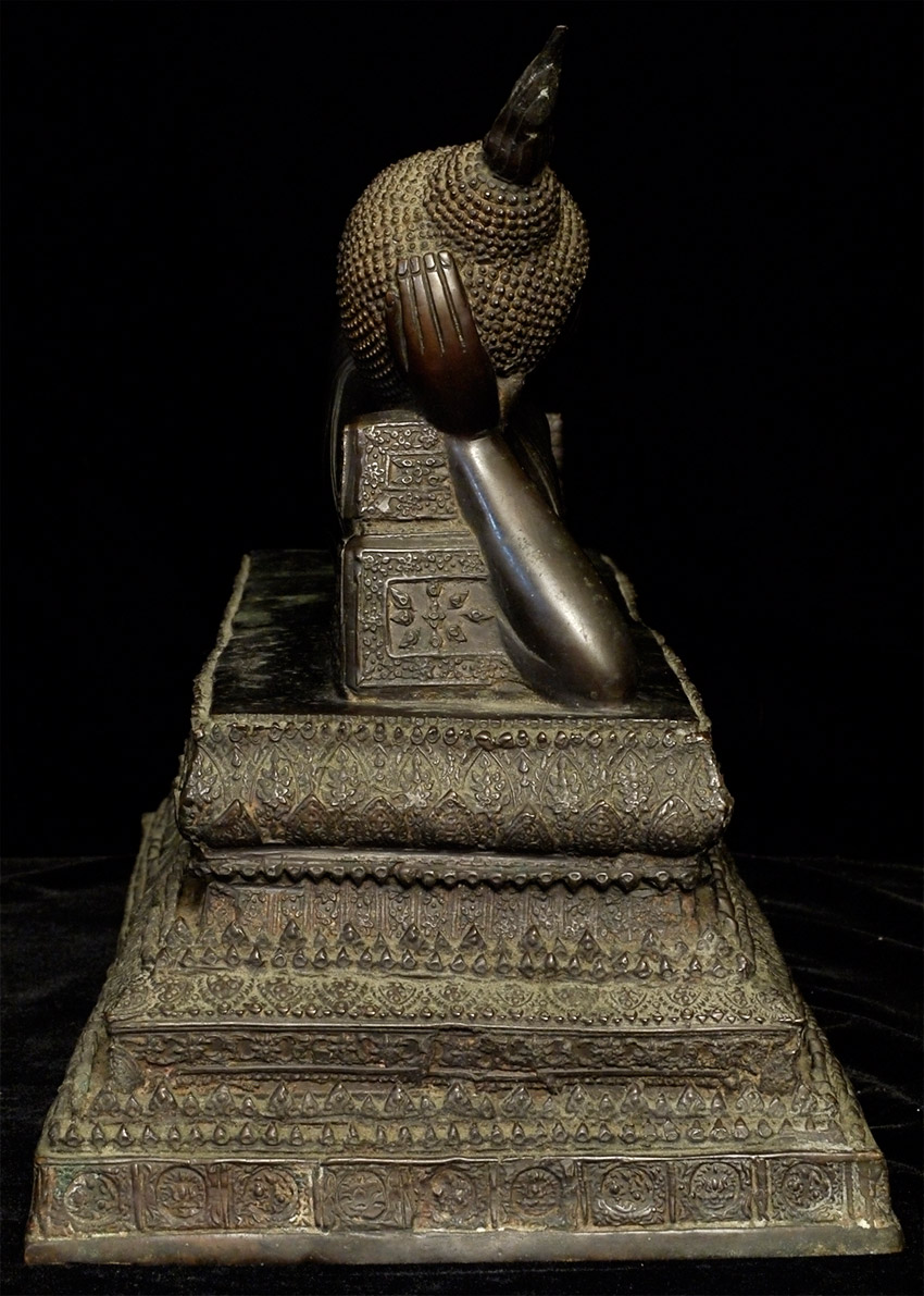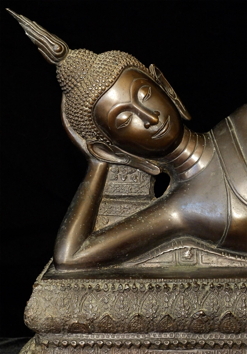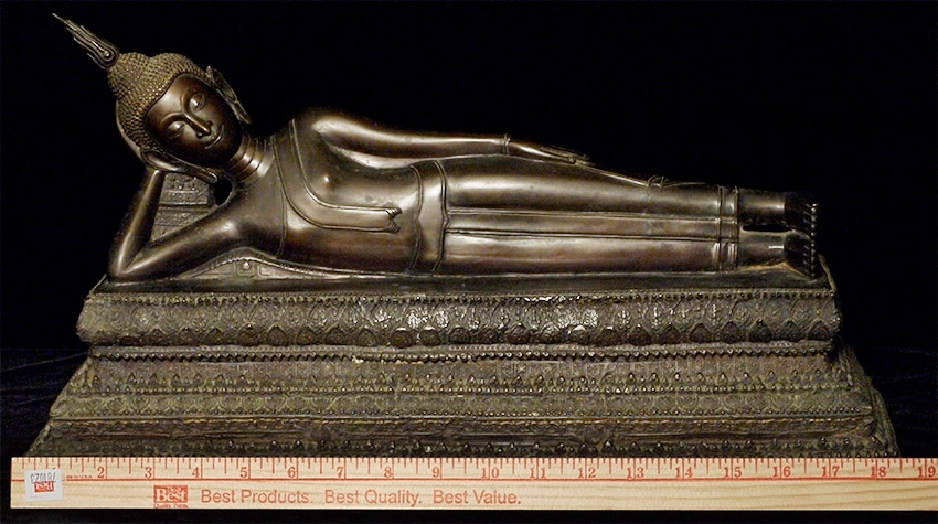 Circa 1900 late Rattanakosin Finely cast Thai bronze Reclining Buddha. Finest large reclining Buddha I have had the pleasure of offering. From a Scottish collection, collected in the 1960's. Sold previously by a major auction house as 19thC, I believe it is from the turn of the century-still over 100 years old. Quite large at 18.5 inches long, 10.5 inches tall, 7.5 inches deep. Look at the base- amazing!