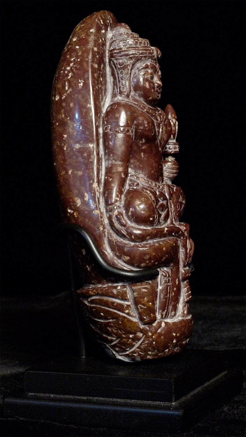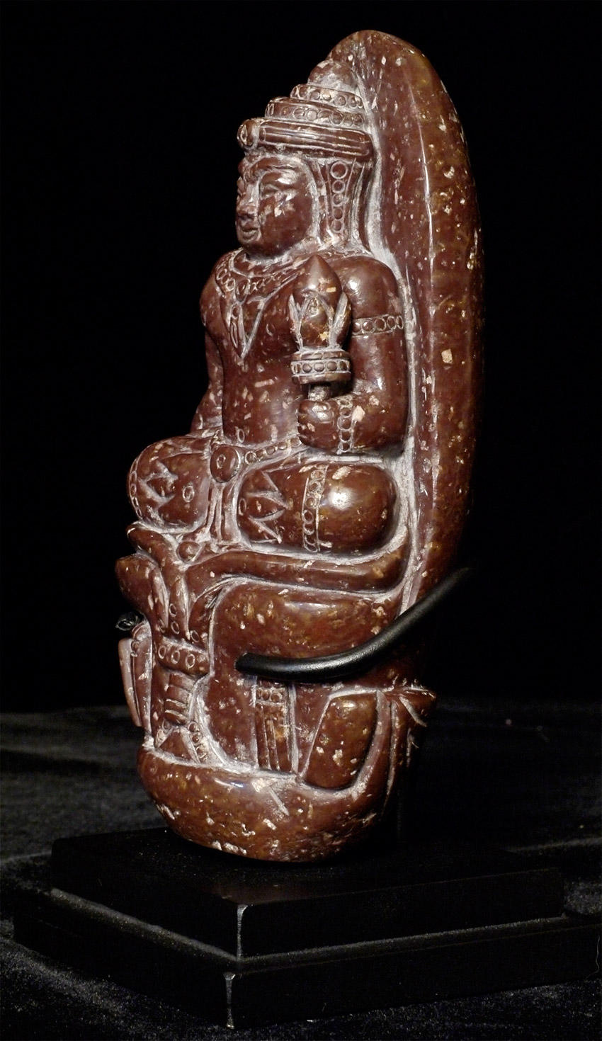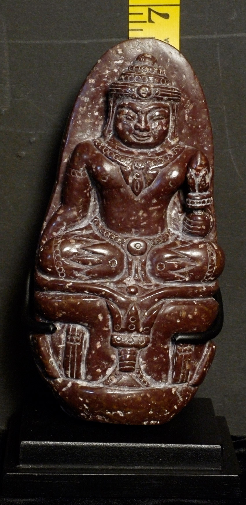 Very early Buddha or Buddhist figure reportedly excavated in Burma. Came with a now lost yellowed note probably written in the 1940's that claimed it was discovered in an ancient burial site while building roads during WW2. The piece itself is 6 inches tall, height on custom stand is 6.5 inches. Piece in his hand is separate and does not stay in place. Unsure of type of stone. Stylistically different than other early Burmese pieces, so a bit of a mystery. Looks as if it laid on its back for a very long time.