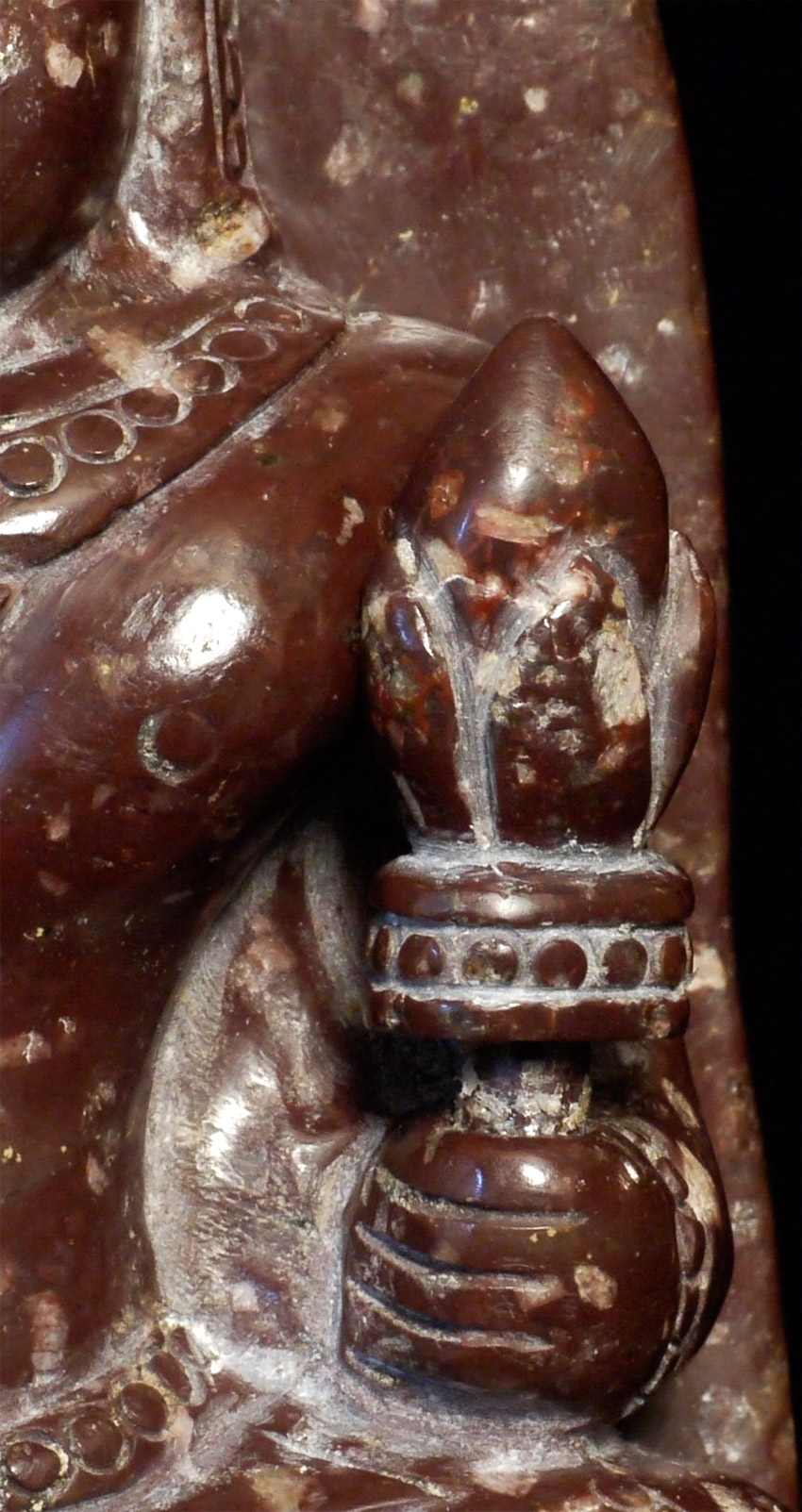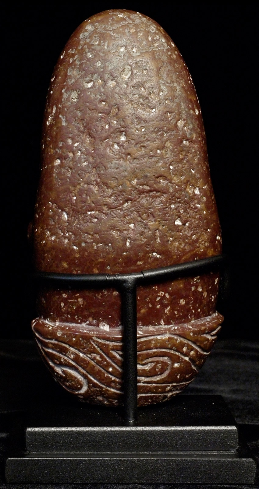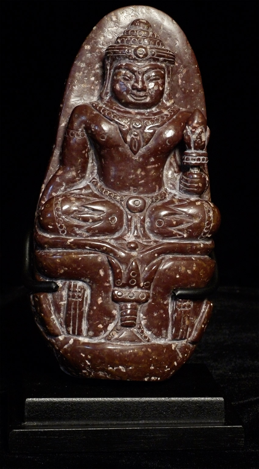Very early Buddha or Buddhist figure reportedly excavated in Burma. Came with a now lost yellowed note probably written in the 1940's that claimed it was discovered in an ancient burial site while building roads during WW2. The piece itself is 6 inches tall, height on custom stand is 6.5 inches. Piece in his hand is separate and does not stay in place. Unsure of type of stone. Stylistically different than other early Burmese pieces, so a bit of a mystery. Looks as if it laid on its back for a very long time.