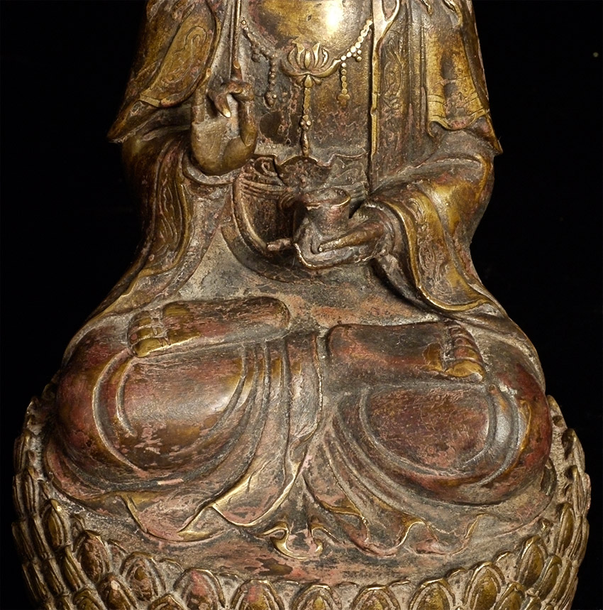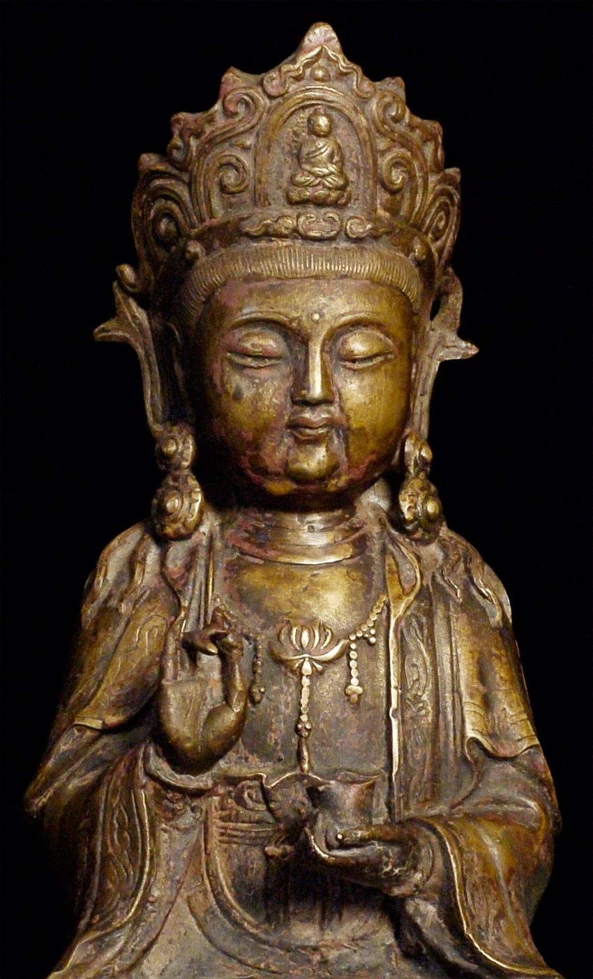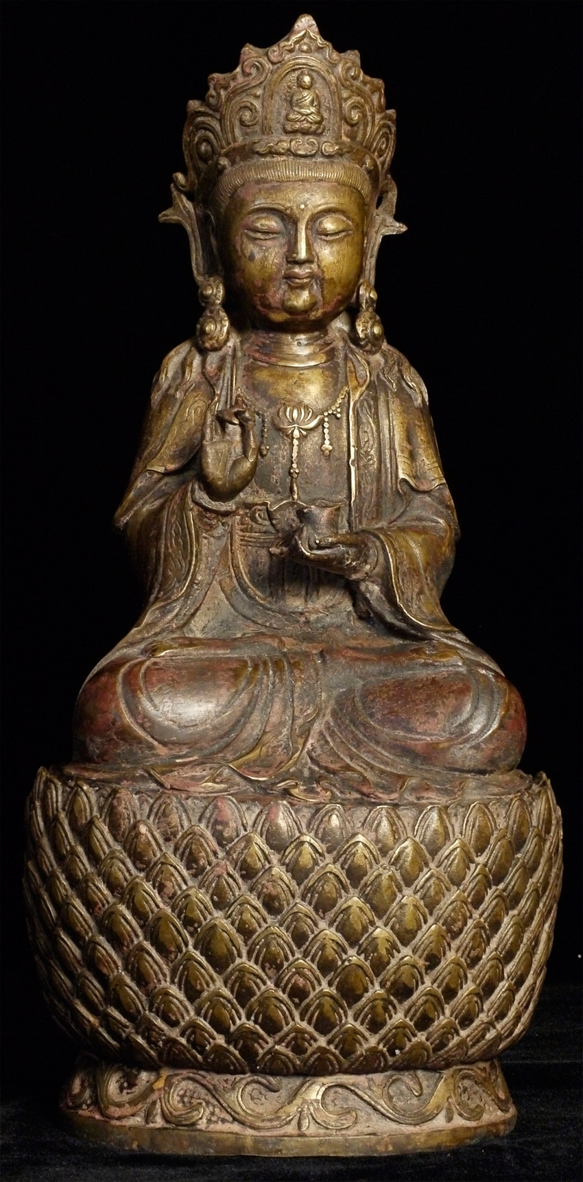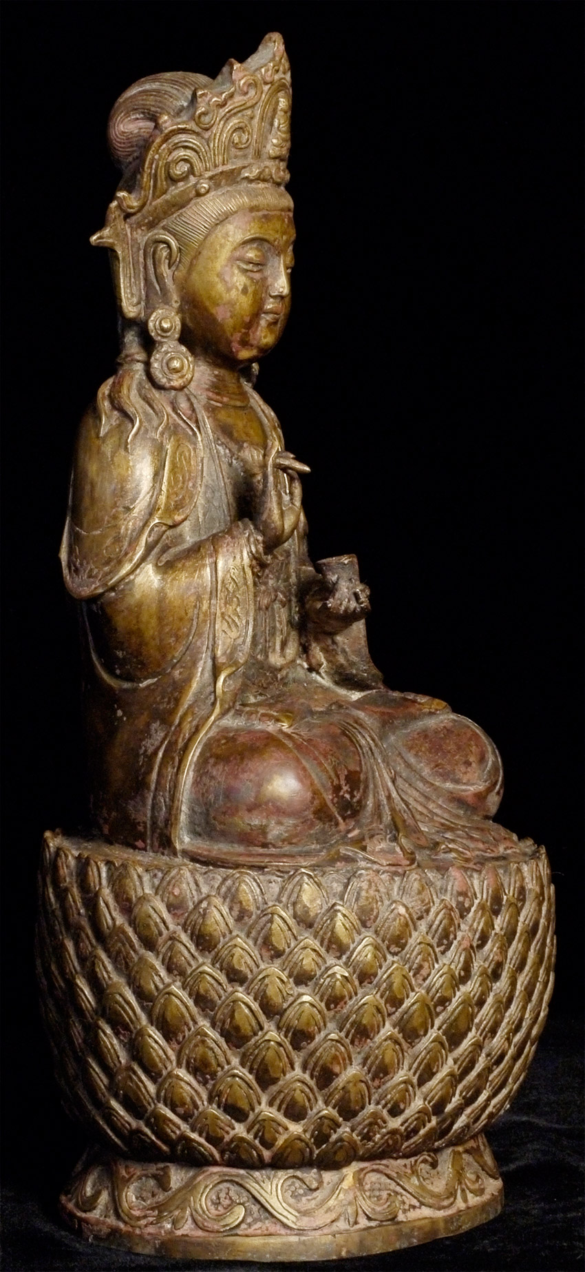 Antique Korean bronze Quanyin. Unsure how to date. Educated guess would contemporary with late Ming/Early Ching (17th/Early 18thc). Beautifully cast, with a deeply serene face. Sits 11 7/8 inches tall. Not seen another Korean example like this one before