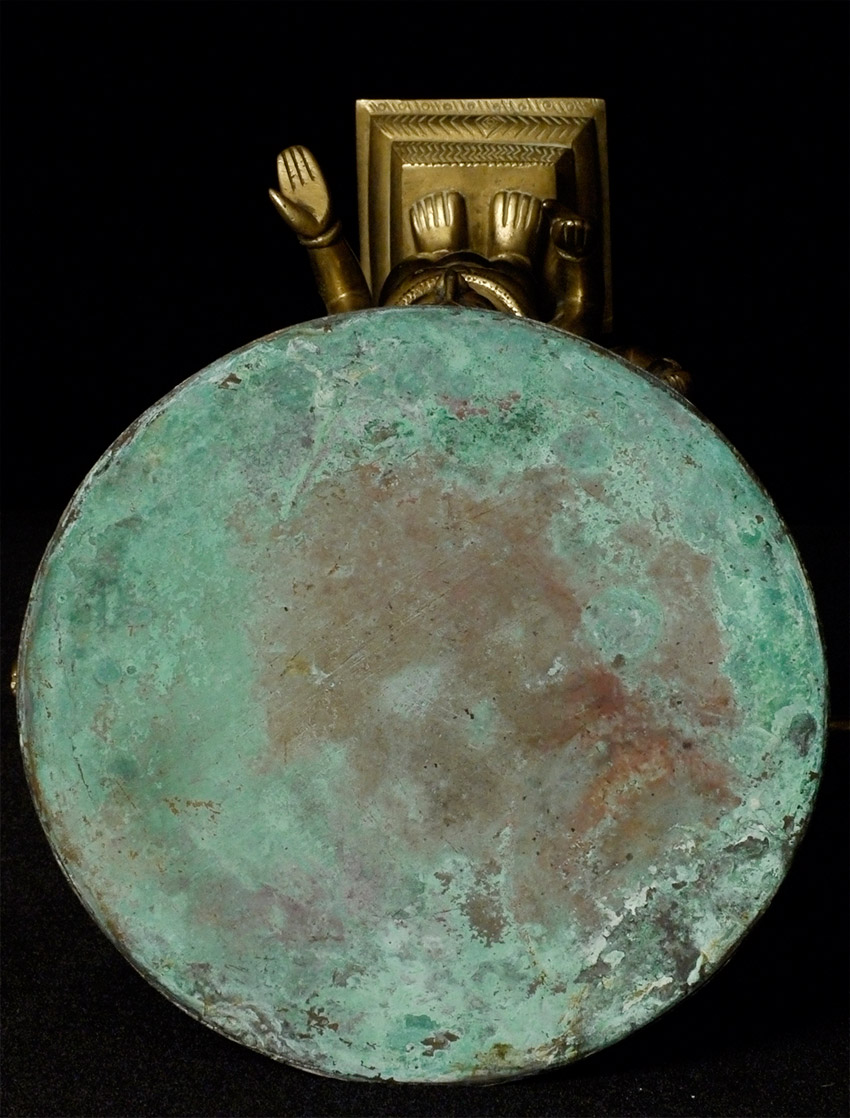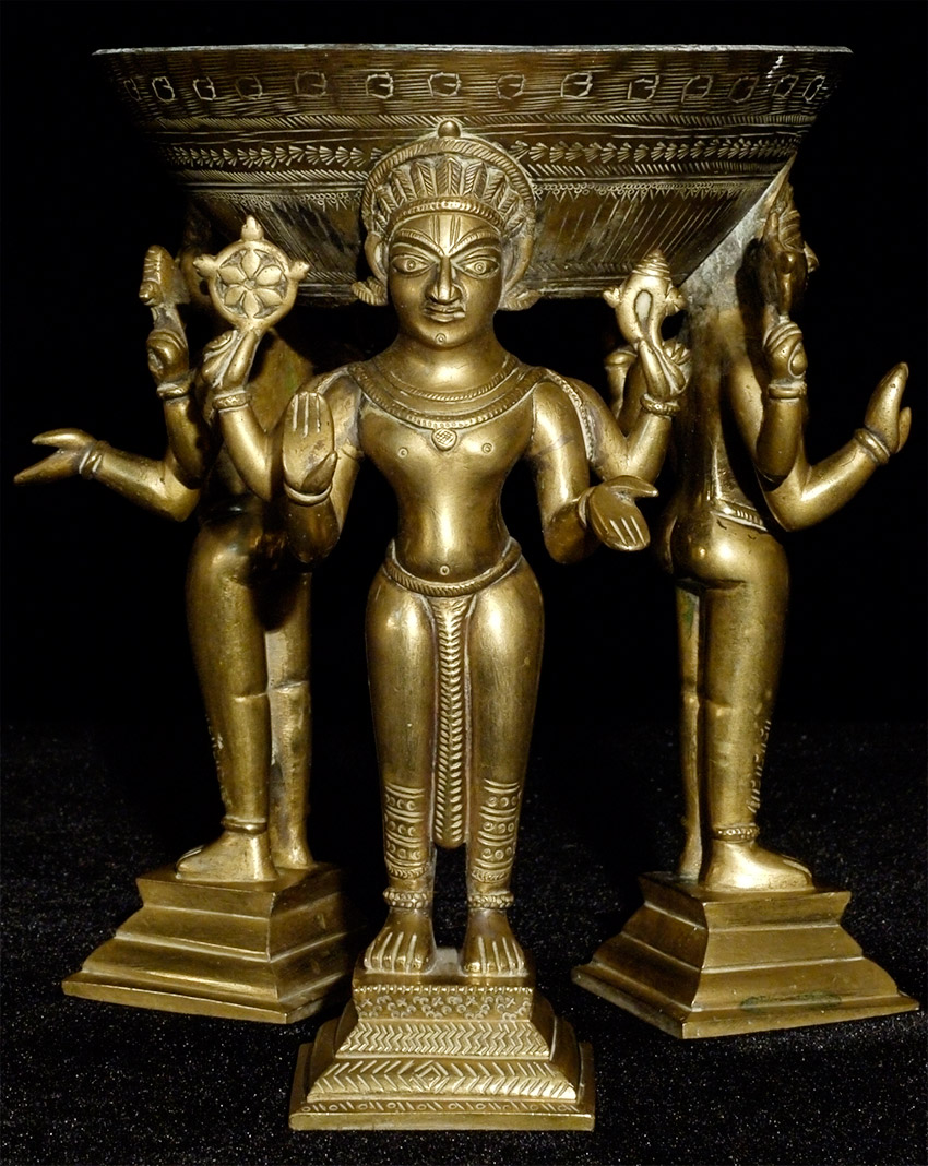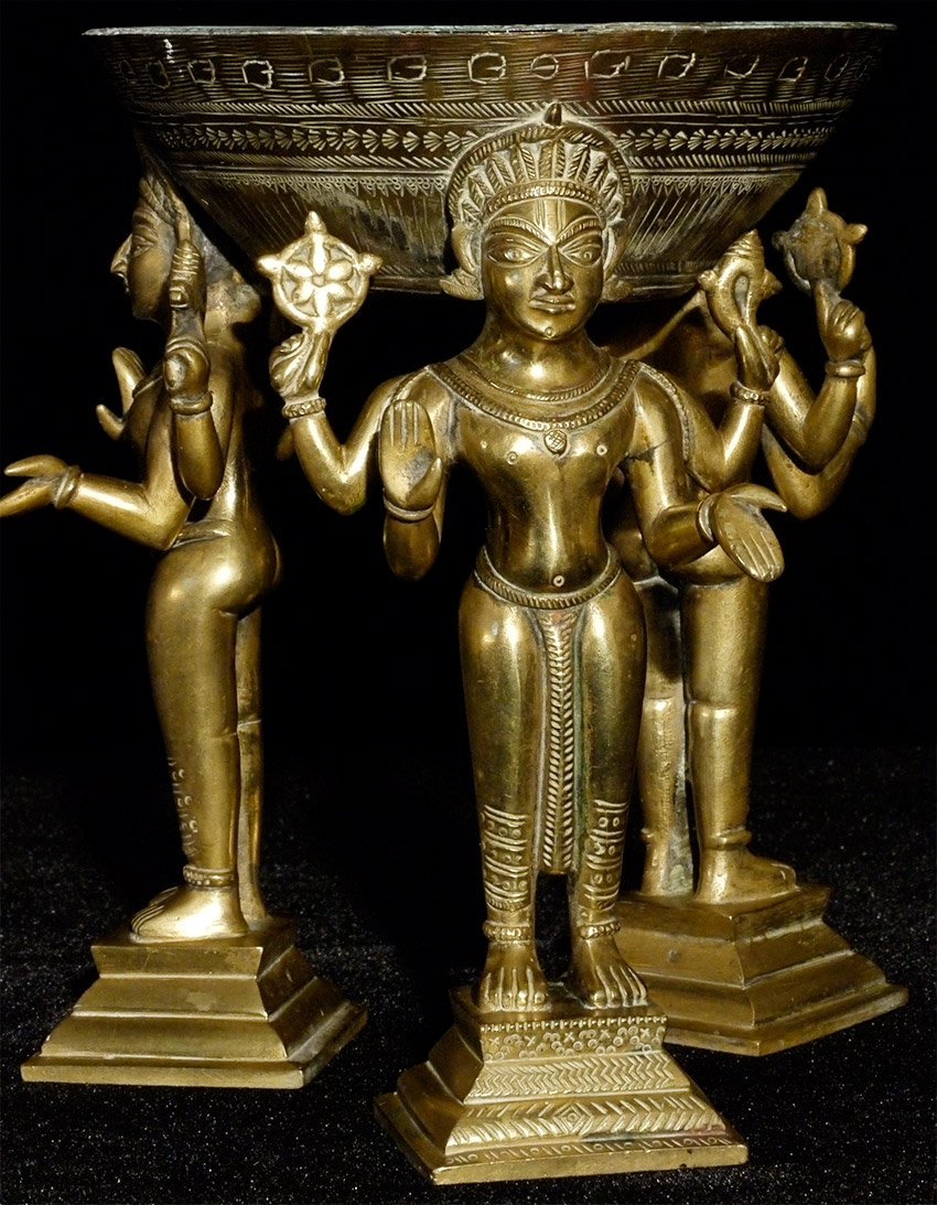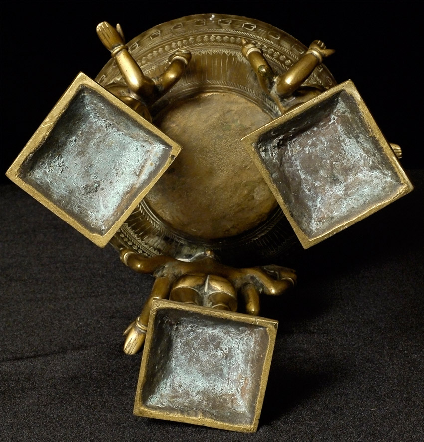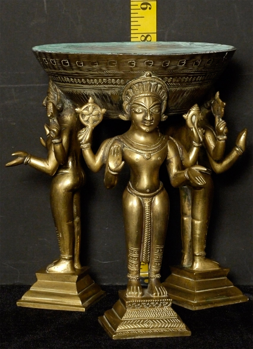 Antique Indian bronze- 3 figures holding up an elevated stand. Appears to have originally been part of something larger. Unique piece, and very heavy. Stands 7.75 inches tall, top diameter of 5 7/8 inches. Striking piece-crisply cast figures with penetrating gazes. Makes a superb centerpiece stand to display an important statue in the round.