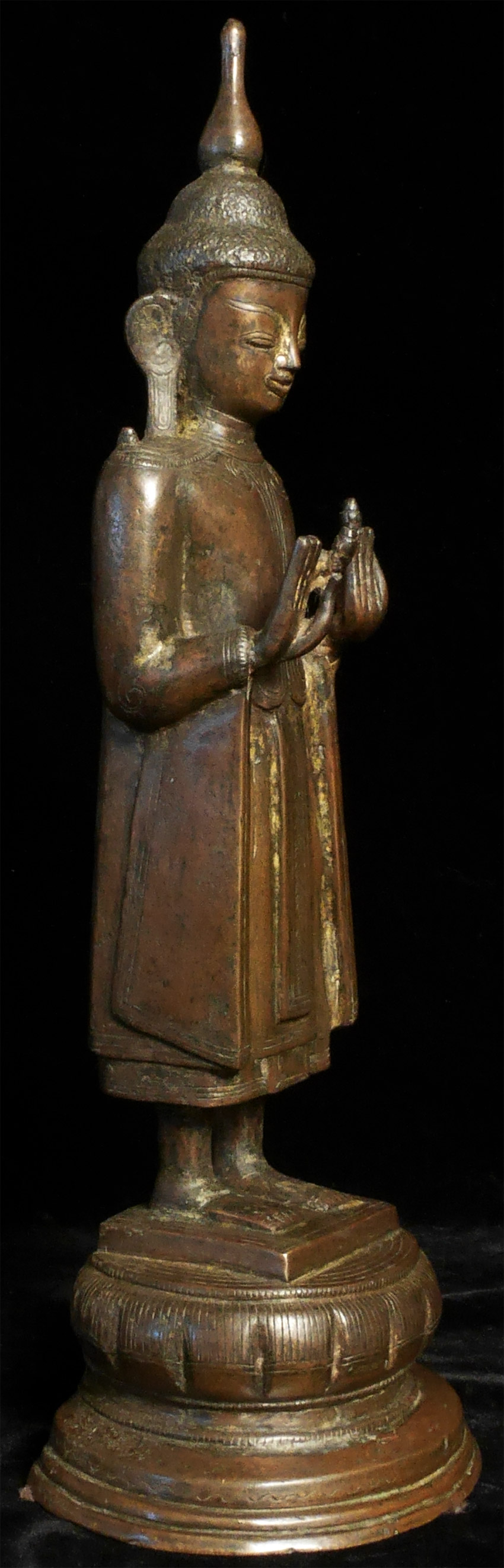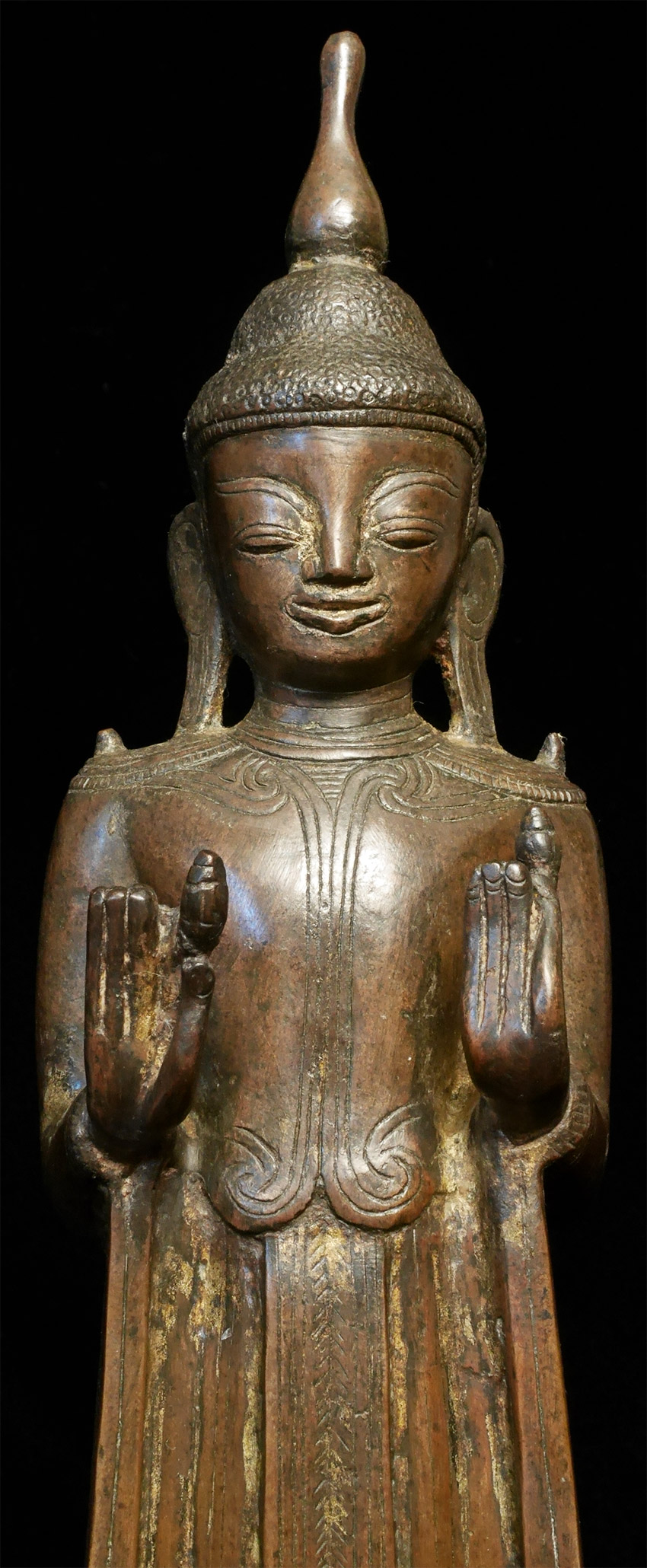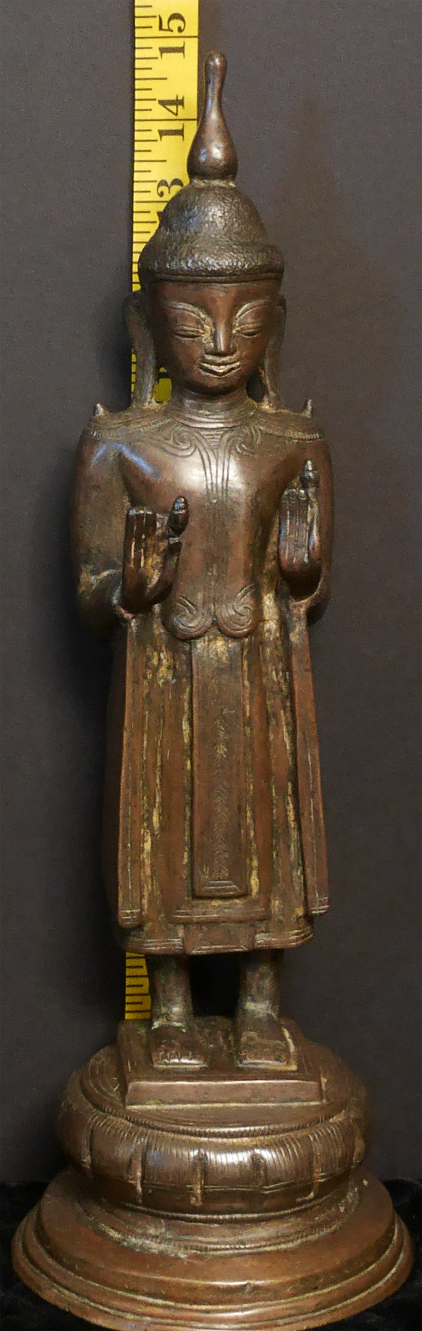 Superb 18thC Burmese Buddha with Miruban fruit in each hand. Probably Mon style, though possibly some Arakan influence. While I have seen this mudra before on a few Mon and Arakan standing Buddhas, it is an extremely uncommon one. The fingers and hands are beautifully articulated for this type of Buddha- a sign of its quality. Remains of original gilding. There are relatively few bronze standing Burmese Buddhas of this period that are of high quality. Design-work is etched in to the surface after casting. Distinctive base. Stands 14.75 inches tall. From an impressive Southern California estate.