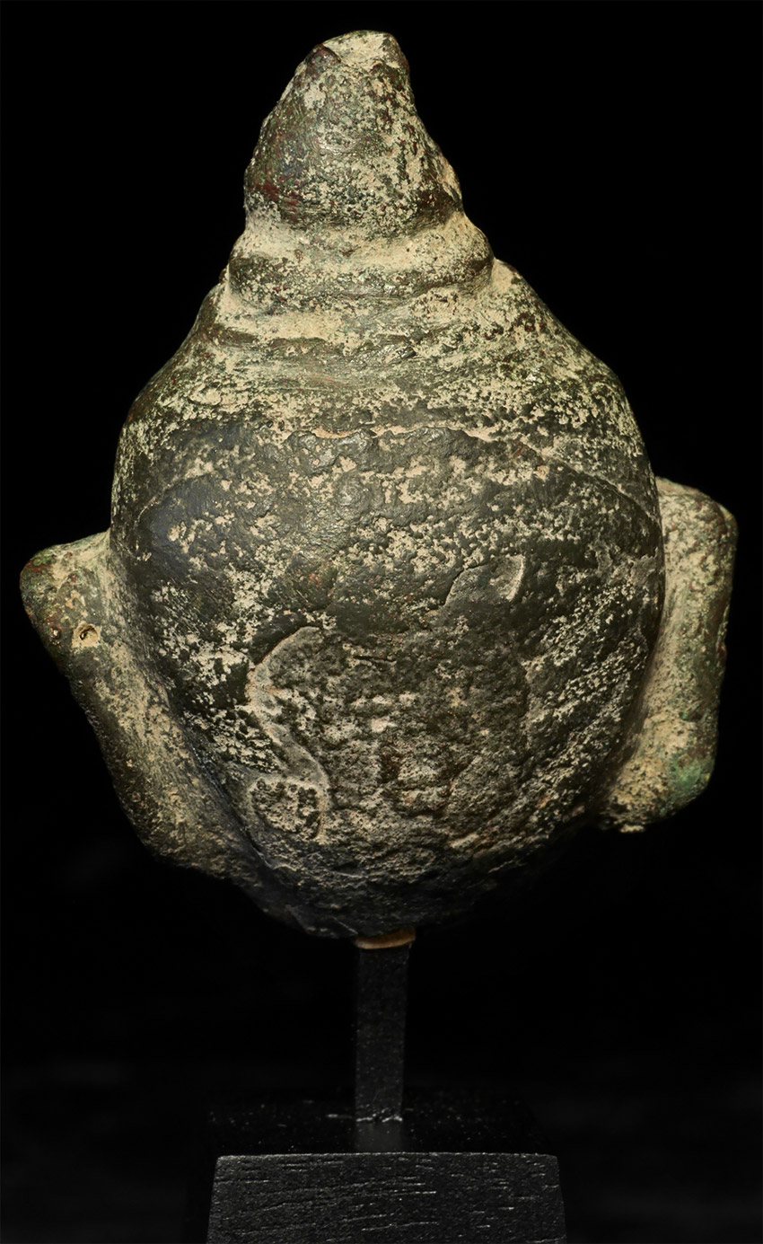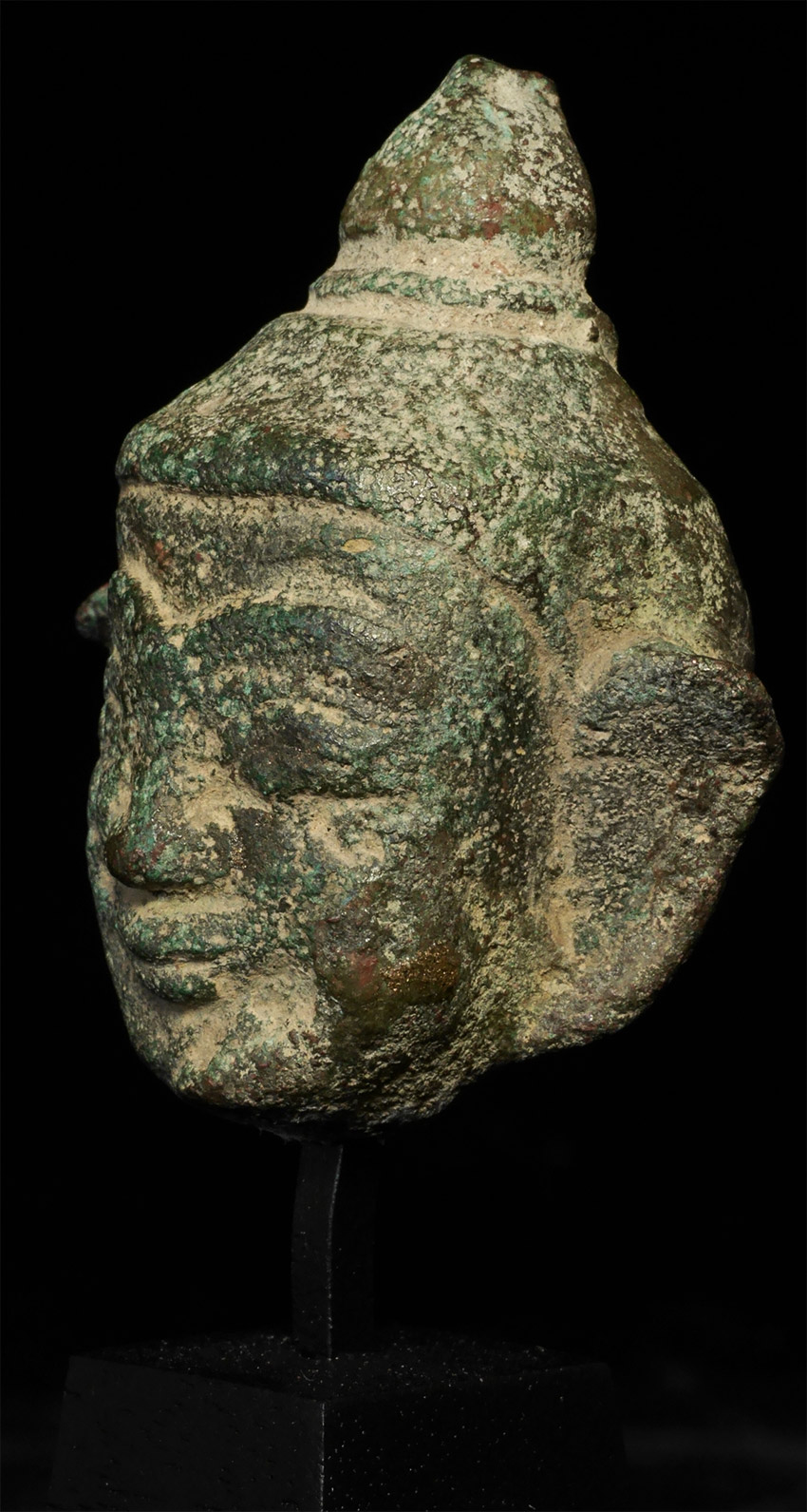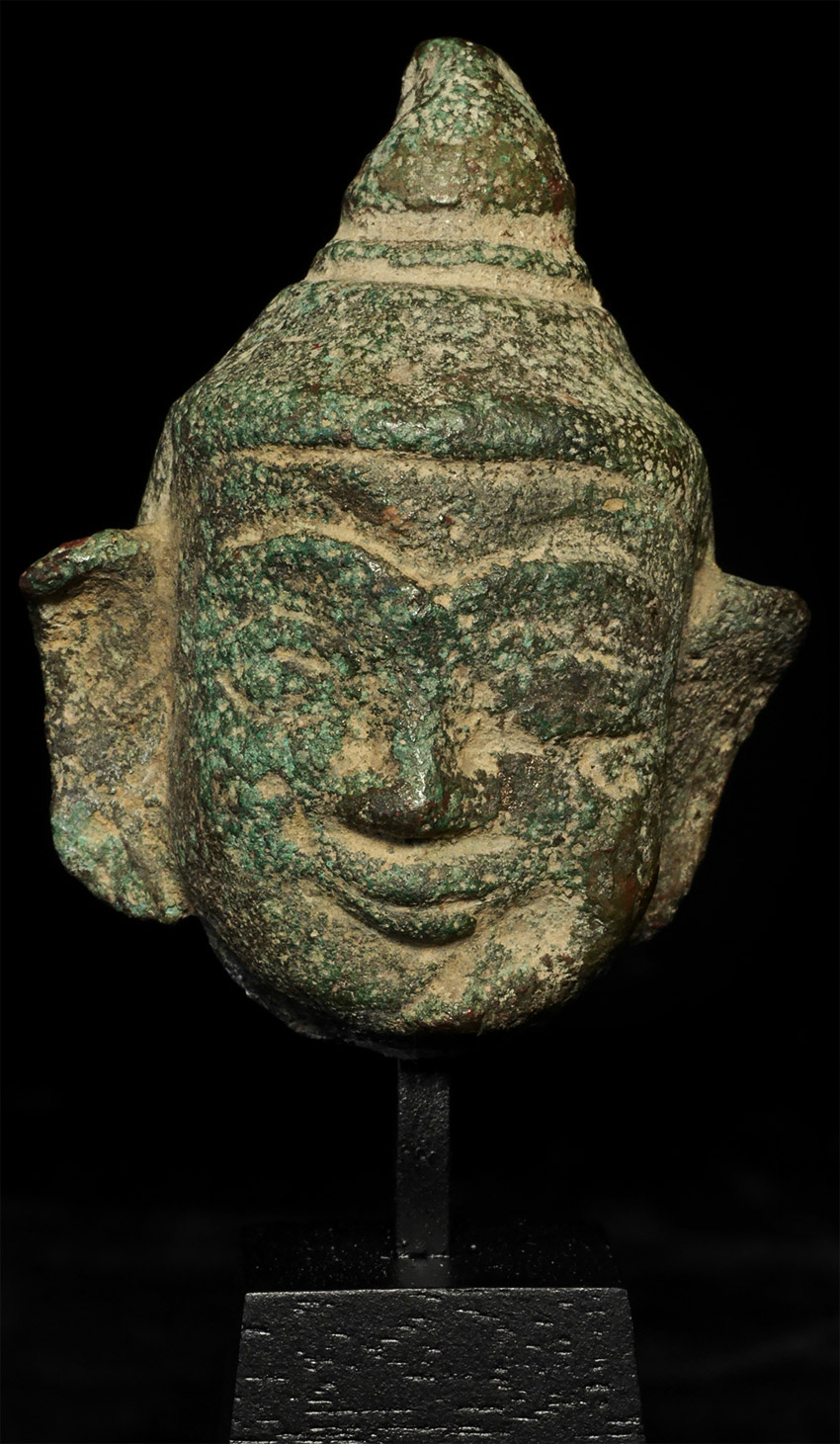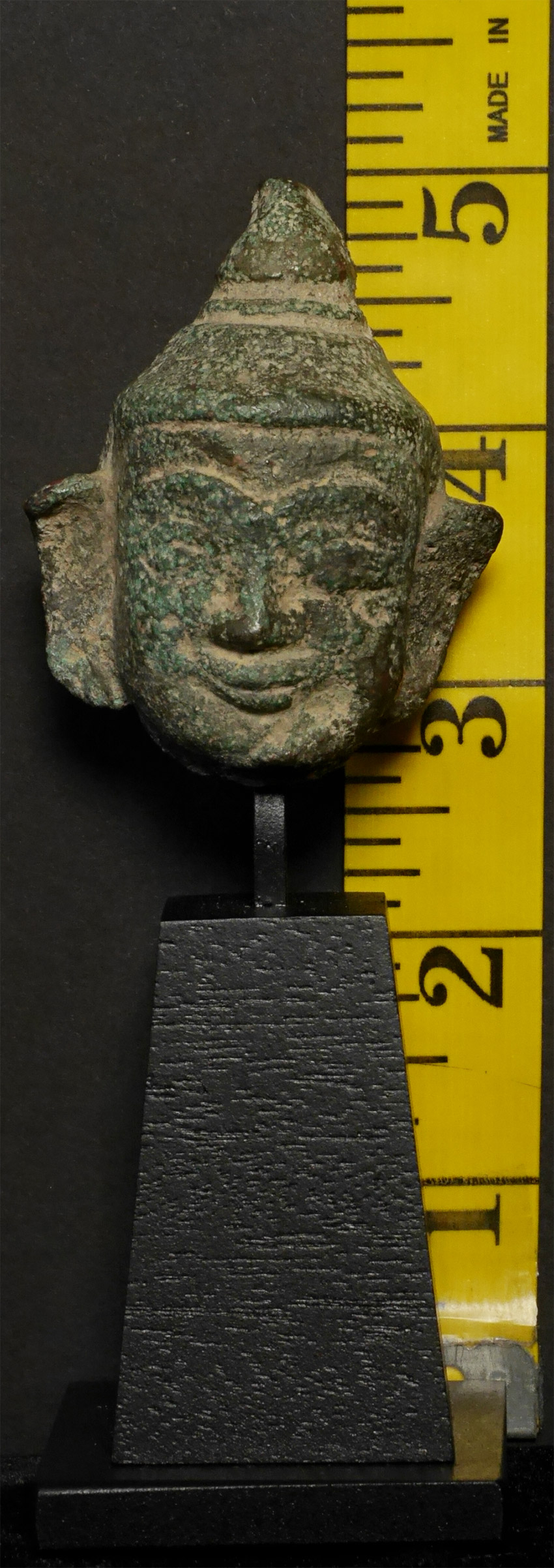 Extremely early Burmese (?) Buddha head. size is 2.5 inches tall (approx.), height on custom stand is 5 inches. Very distinctive floppy ears. Never seen another like it.