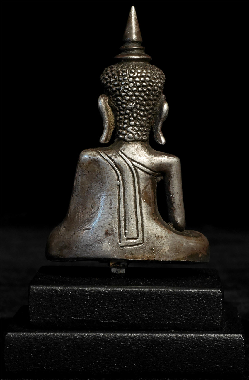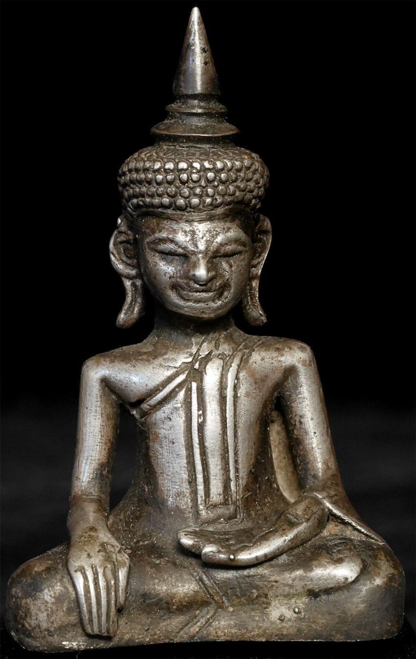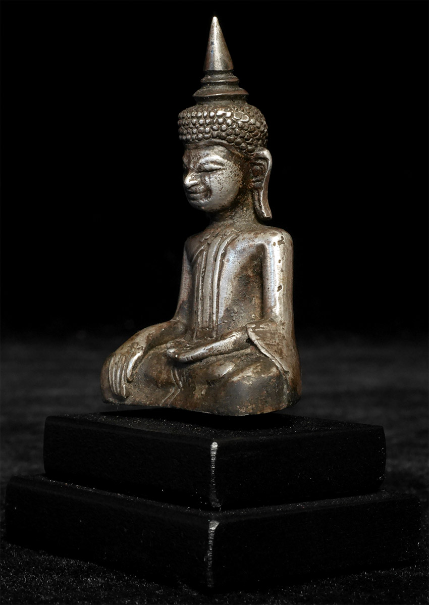 17thC silver or silver alloy Cambodian Buddha. Solid cast. Would have likely originally had a hollow cast lead or bronze alloy base. 2.25 inches tall, height on custom stand is 3 inches. Classic example of its type.
