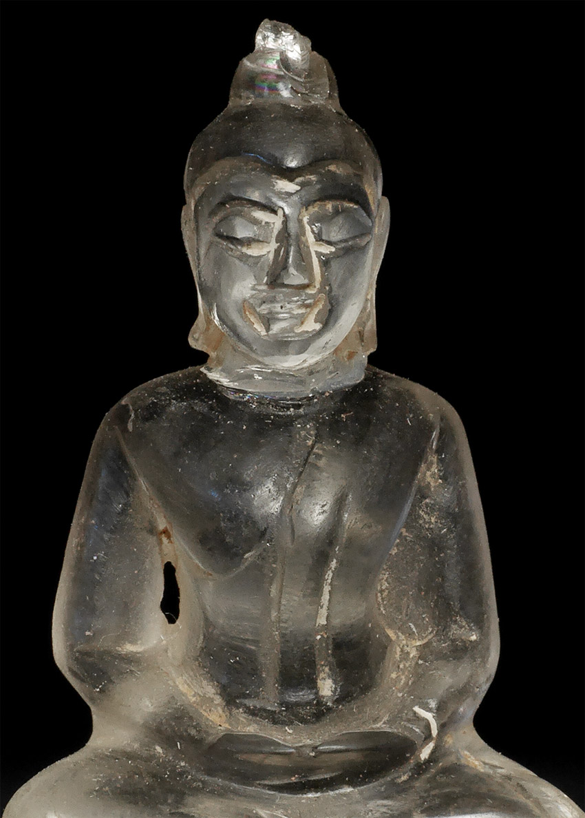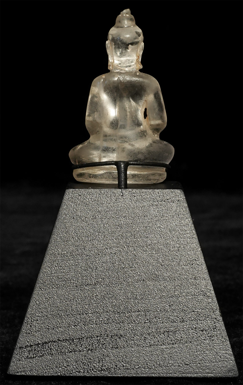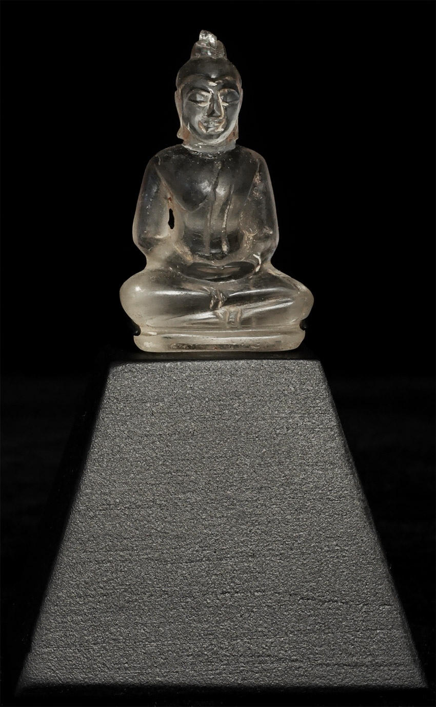16/17thC Northern Thai Crystal Buddha. Head reattached and finial chipped (which is not uncommon, as many/most of these were excavated). Height is 1.75" tall and 4.5" tall on its custom base. A well carved example.