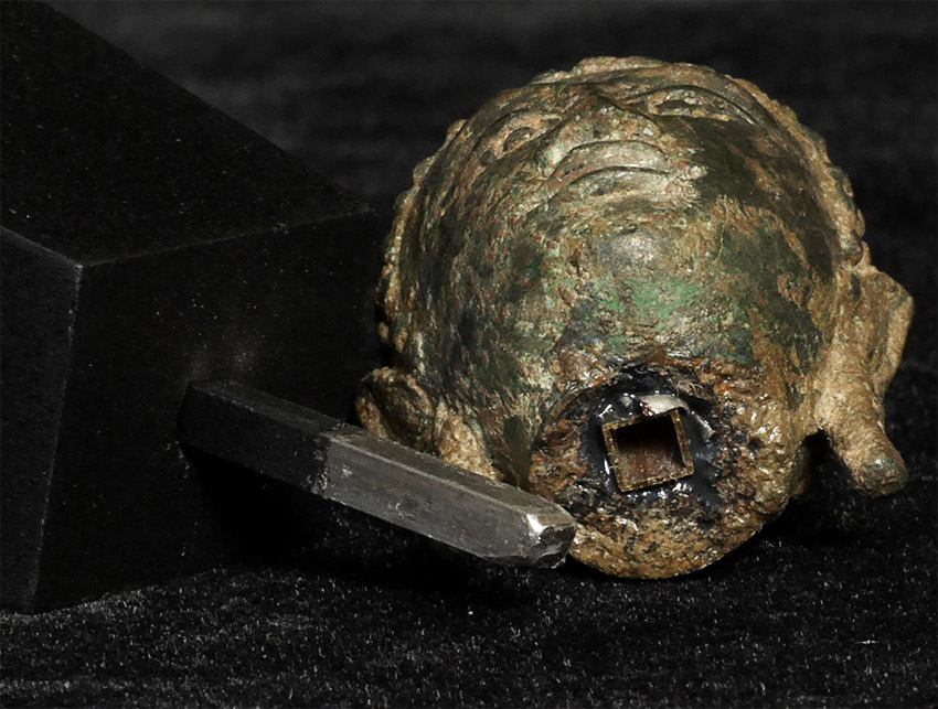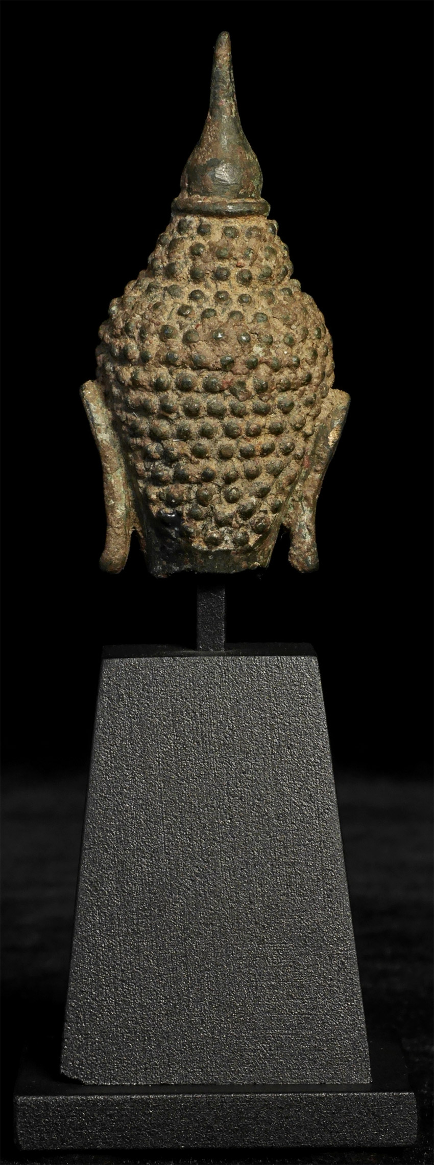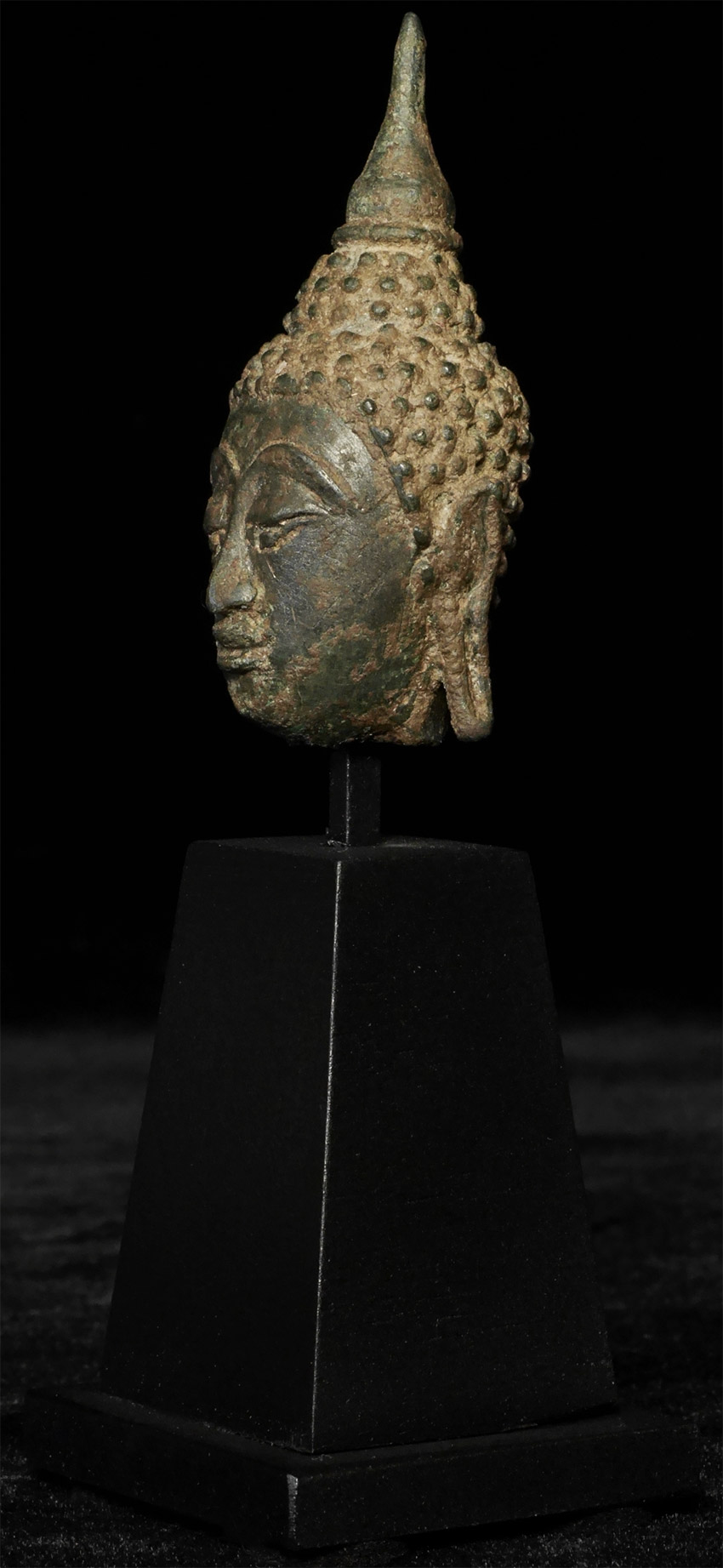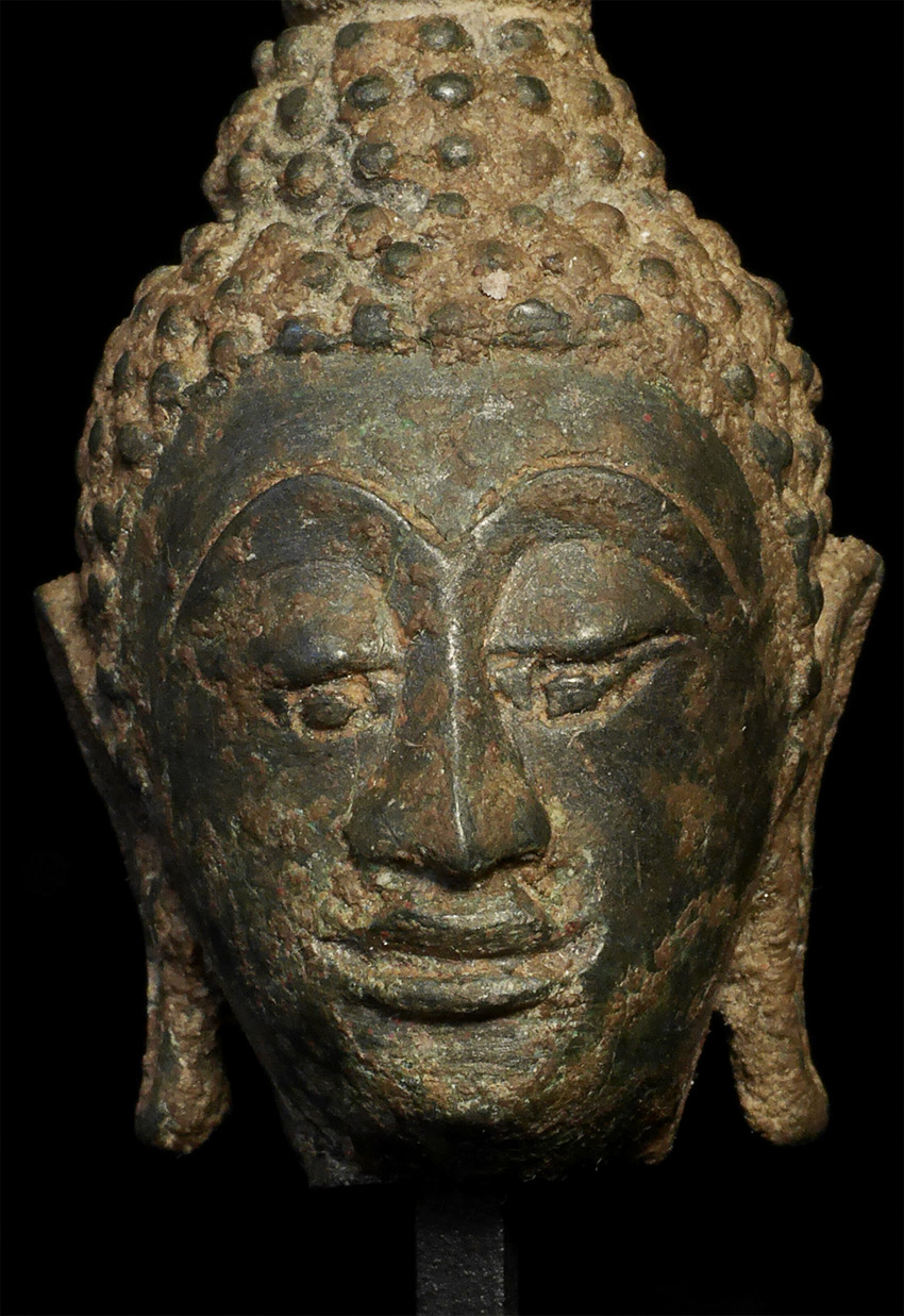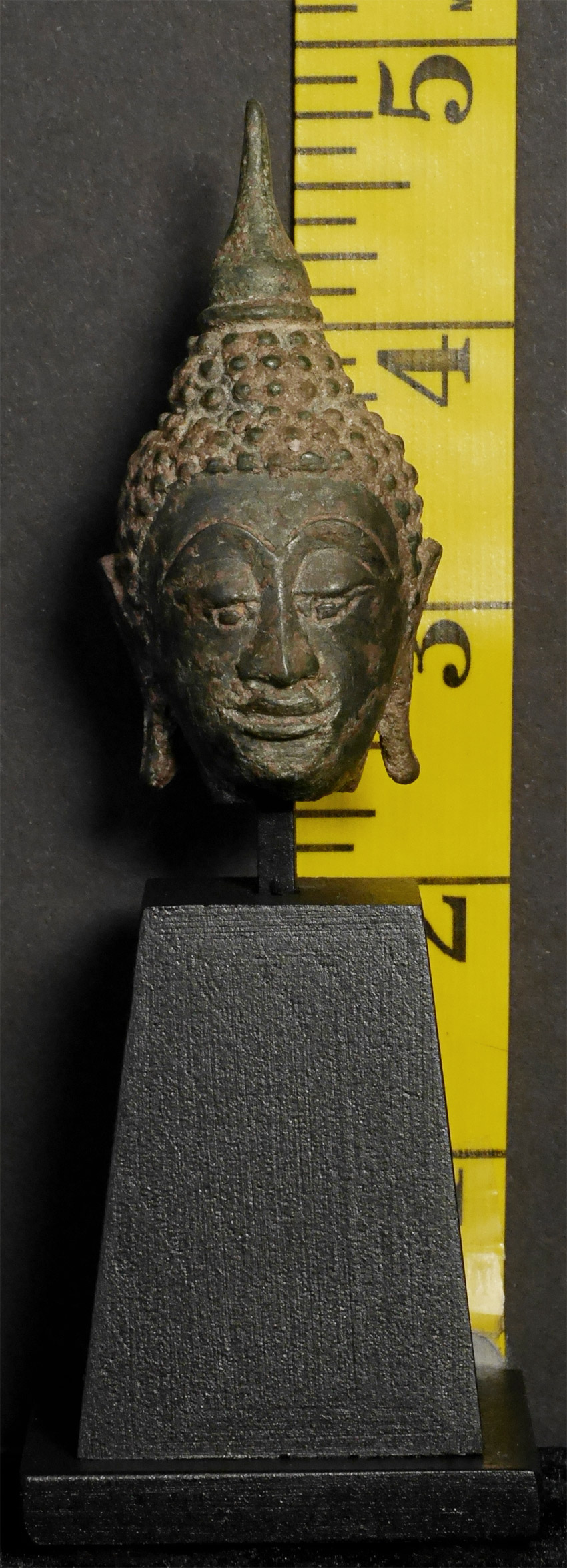 15/16thC Thai Buddha head on custom stand. Head is approximately 2.25 inches tall, height on custom stand is 4.75 inches.