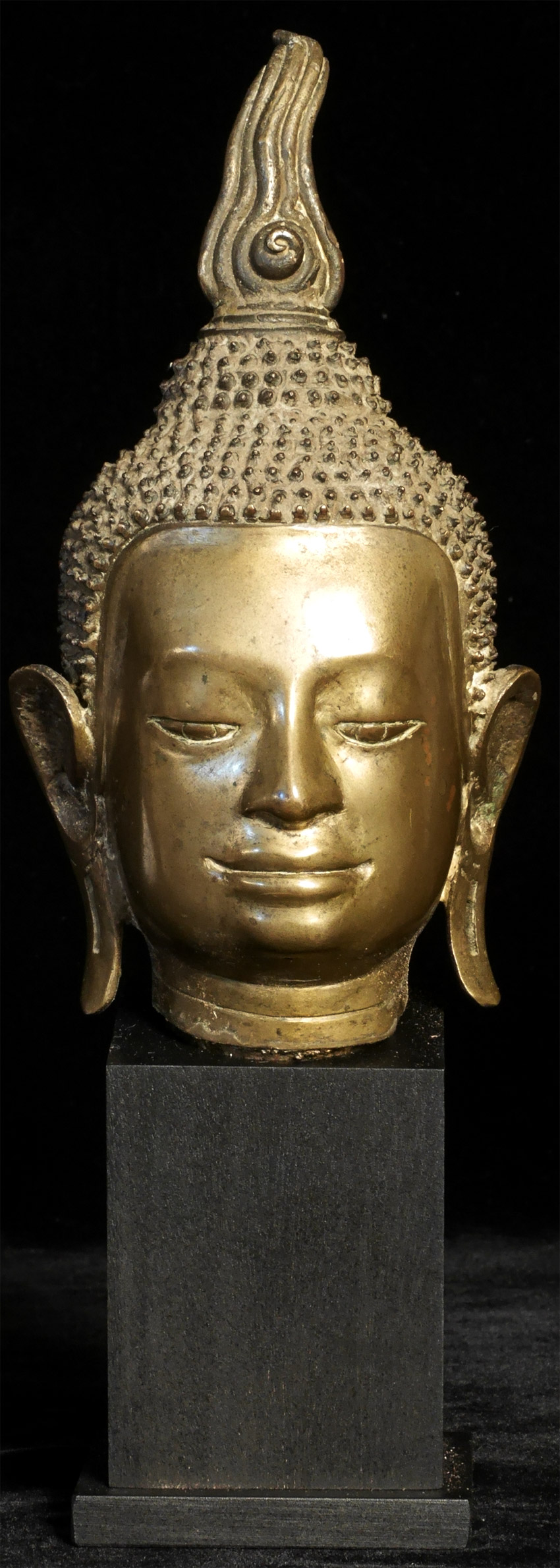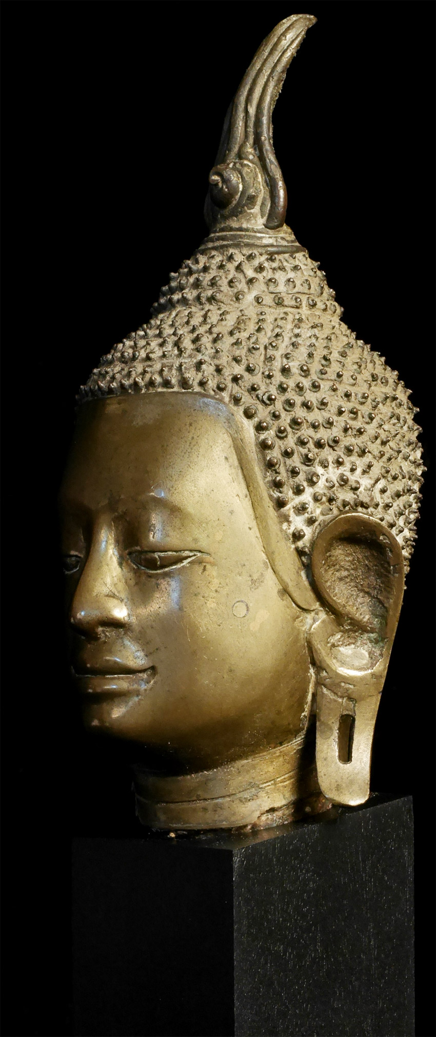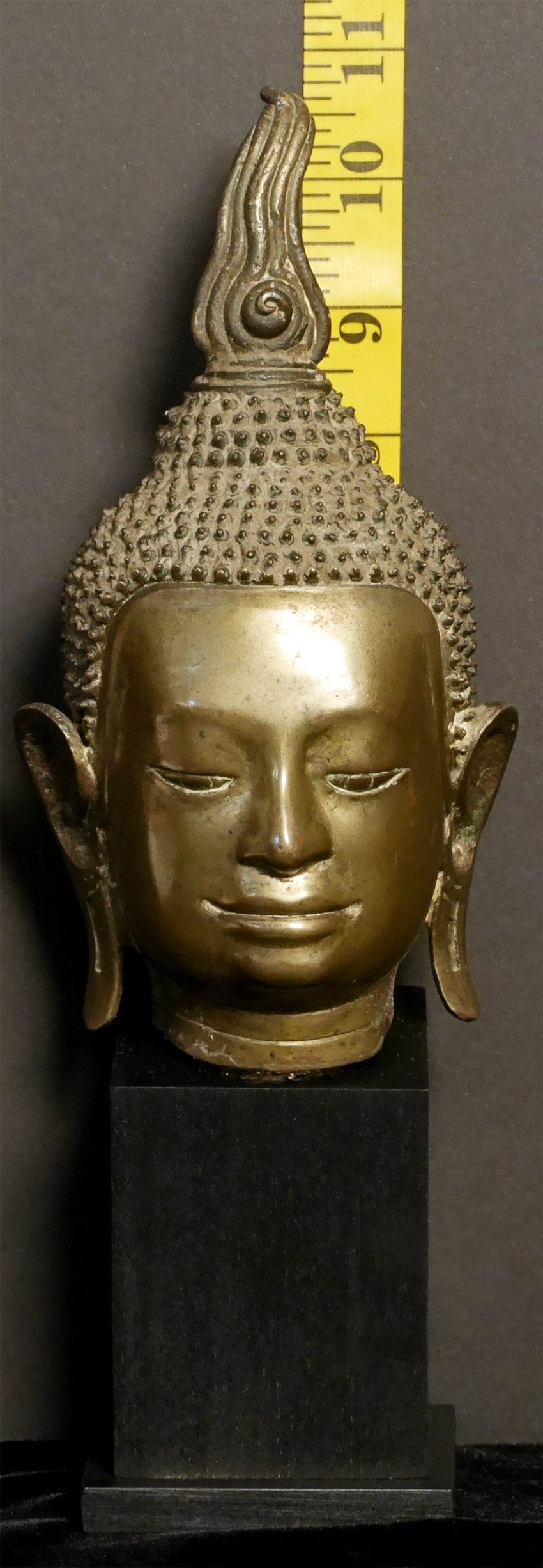 14/15thC Thai Bronze Uthong style Buddha head. Head is approximately 7 inches tall, height on custom stand is 10.75 inches. Extremely heavy.
