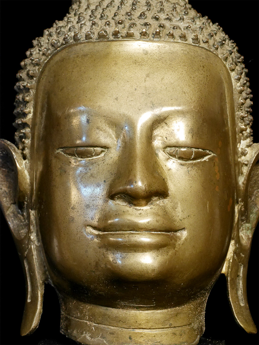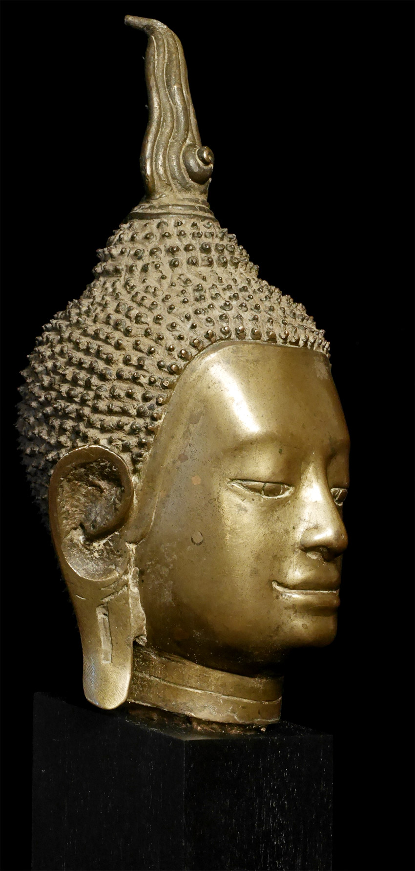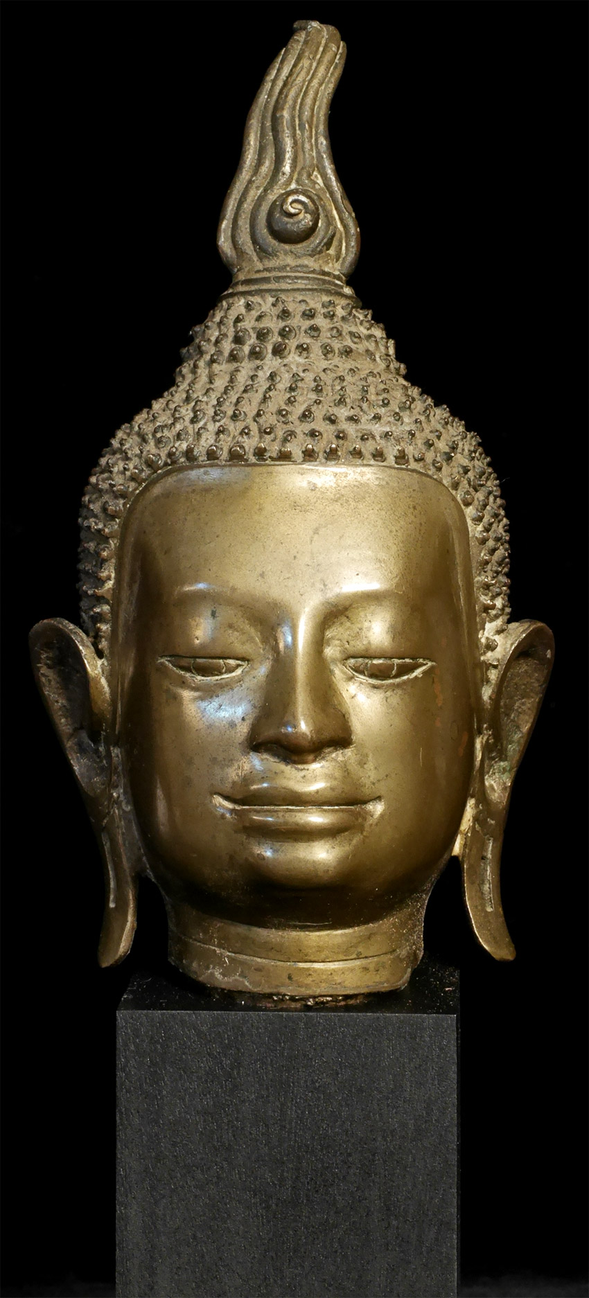 14/15thC Thai Bronze Uthong style Buddha head. Head is approximately 7 inches tall, height on custom stand is 10.75 inches. Extremely heavy.