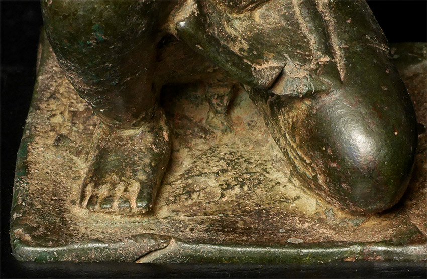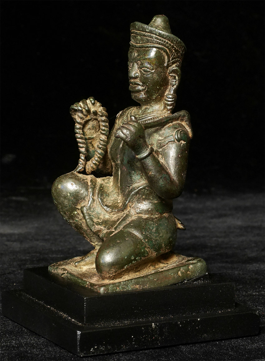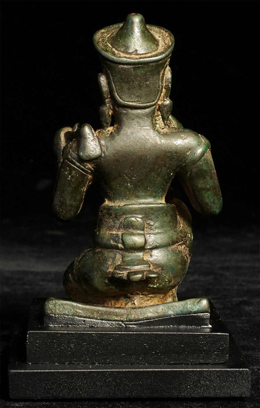 12thC Cambodian Solid-Cast Bronze "Divine Architect". Well cast heavy example. Kneels 3 7/8 inches tall, height on custom stand is 4.75 inches.