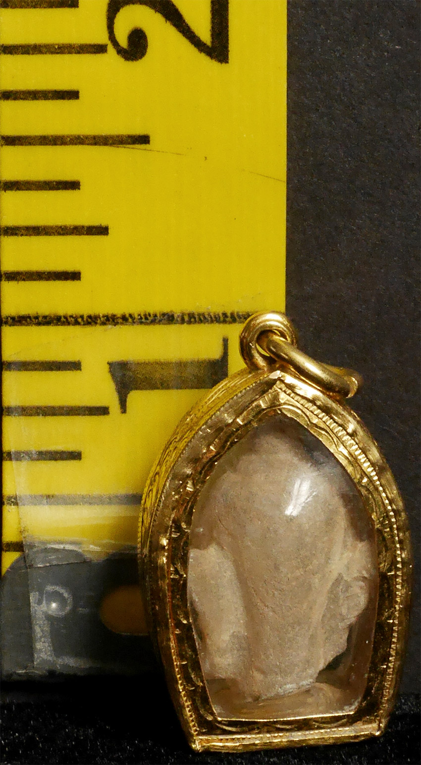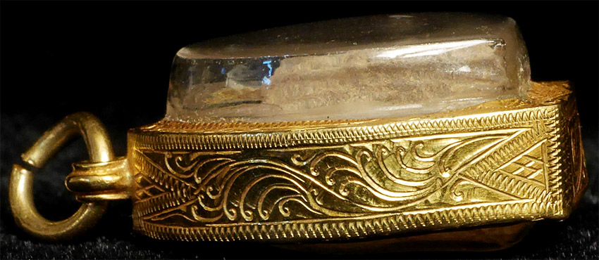 16/7th century crystal Buddha head in an amulet cast surrounded by 22k gold. Entire piece stands 1-1/4 Inches Tall. A beautiful sweet face in a light peach color -- very difficult to photograph -almost feels like there is a spirit living inside. Significant value in gold alone. Great piece to wear daily.