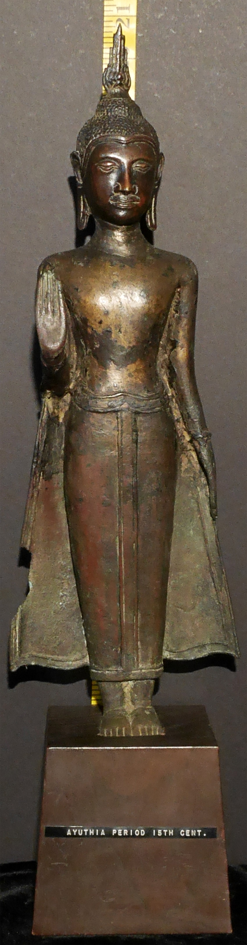 15/16thC Utong C Thai Bronze Buddha. A beautiful example of its type in a large size. The head looks to have been professionally reattached, though only evident upon close examination (price reflects this). The figure is 16.5 inches tall, height on the attached base is 20.75 inches.