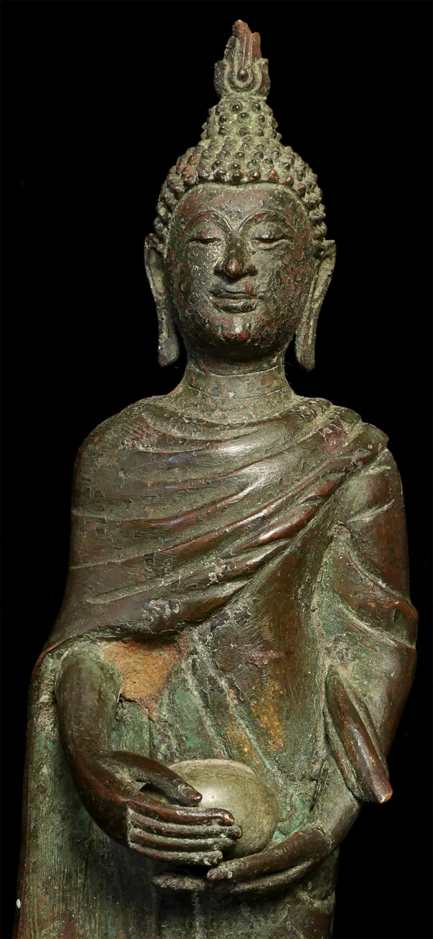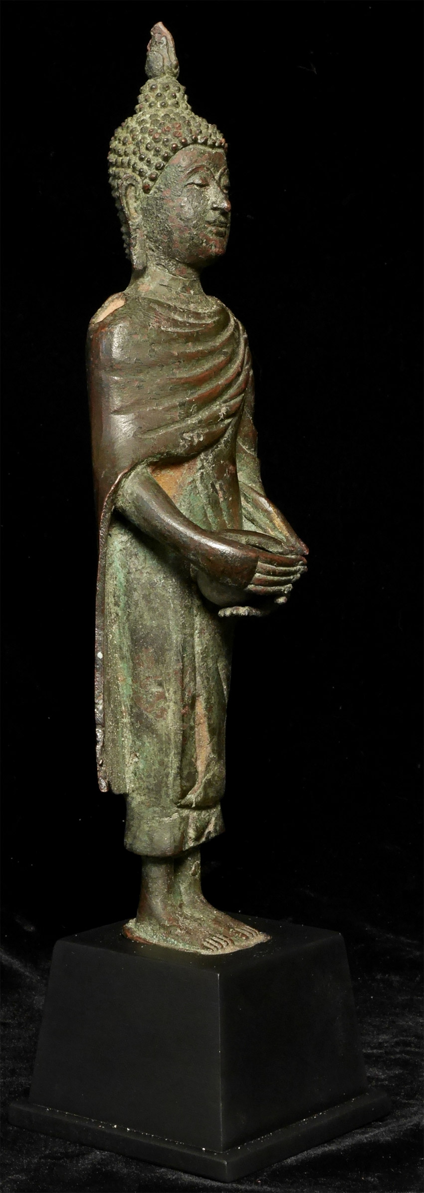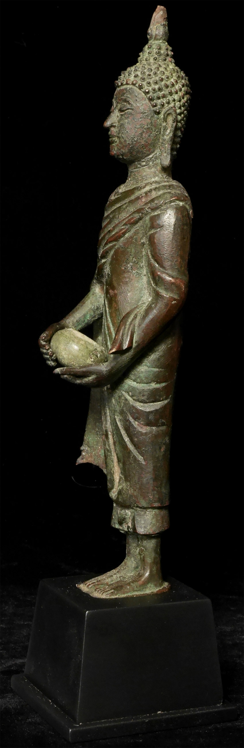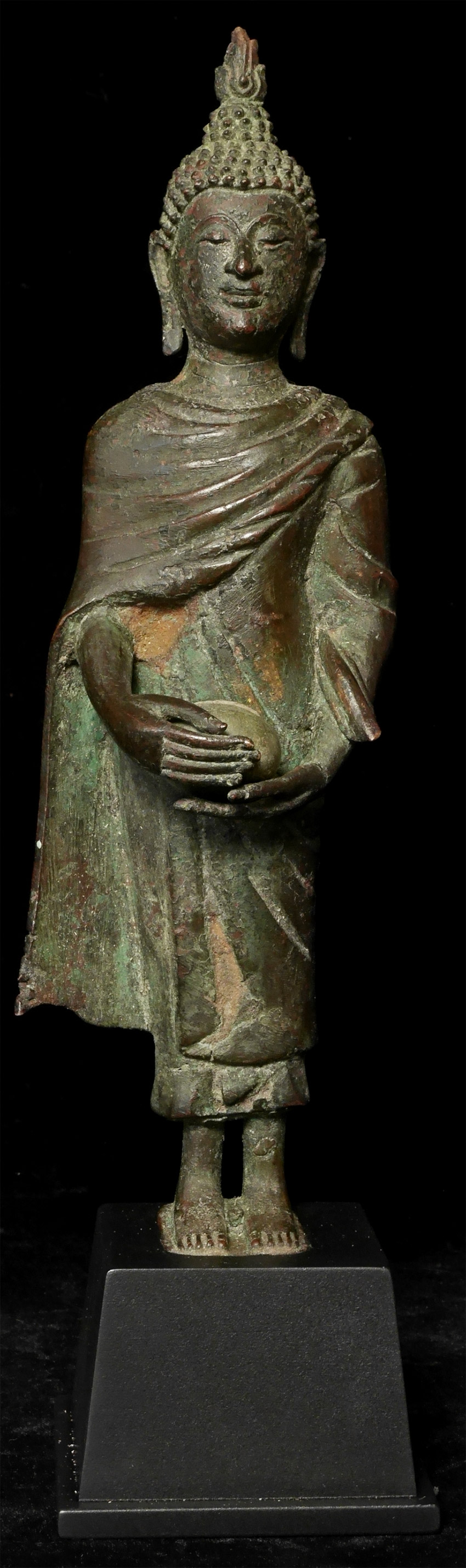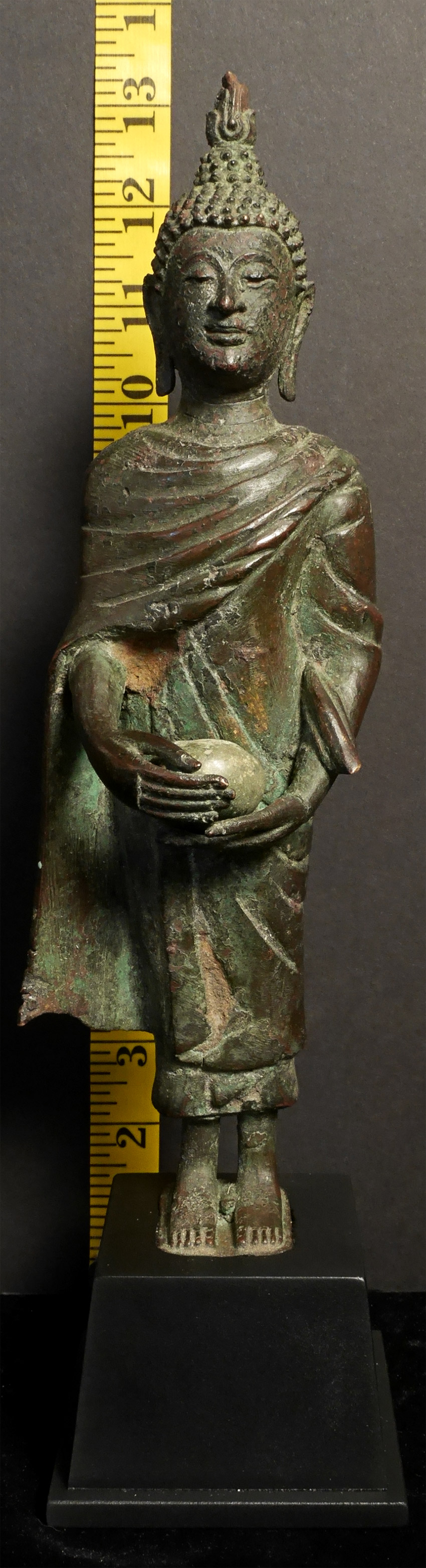 Circa 1900 Thai Bronze Buddha as Monk w begging bowl. Stands11 in, w base13.25 in. Good quality antique example of pre-enlightenment Buddha during late Rama V or a little later.- not common. There are some casting flaws in robes, but they are still beautiful and interesting. His face and body are perfect. Look at the photos.