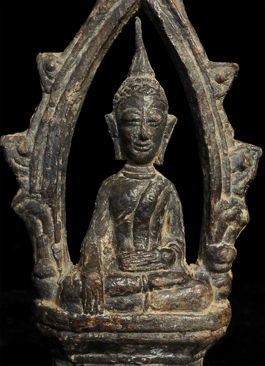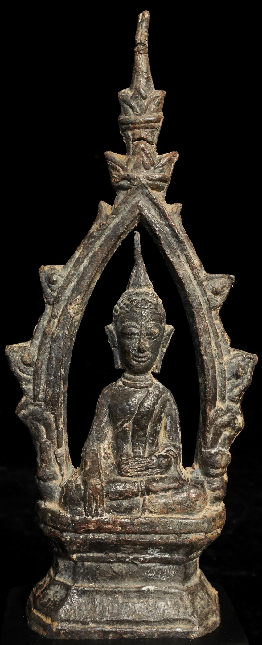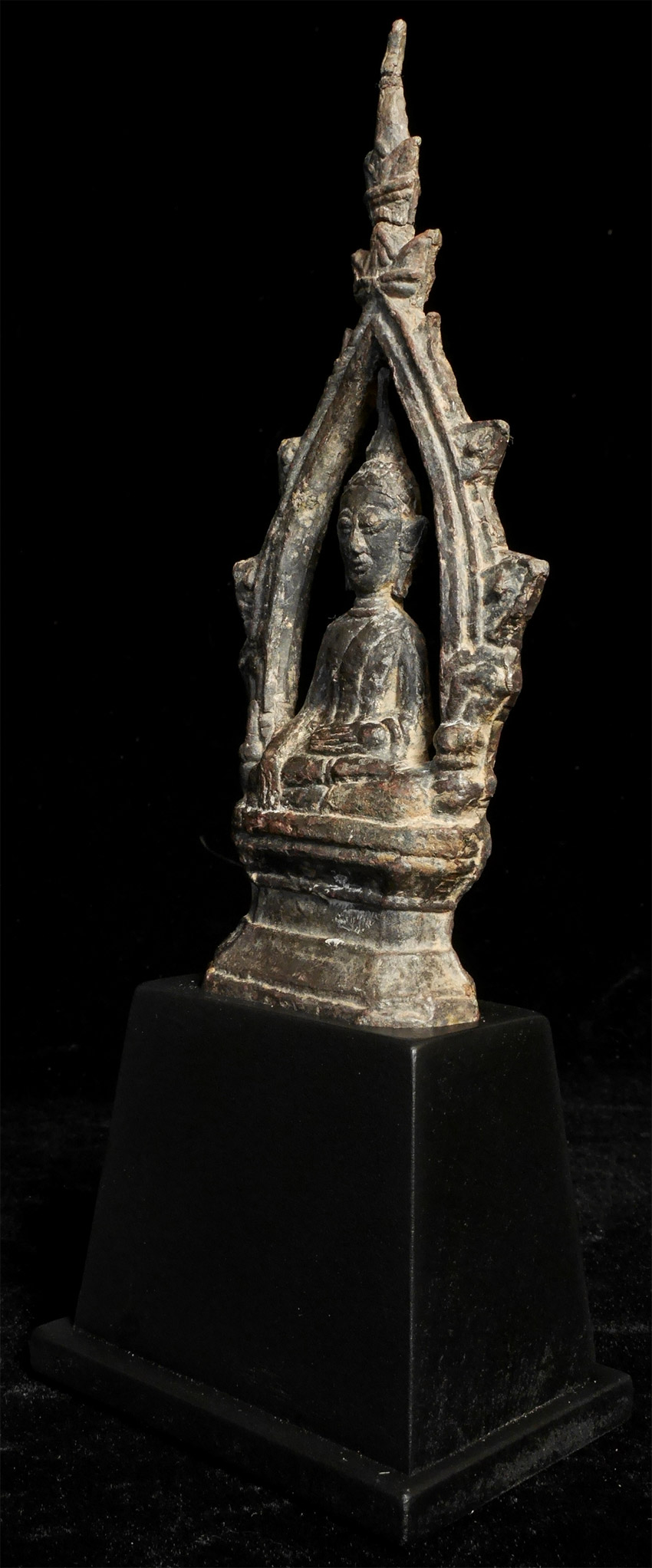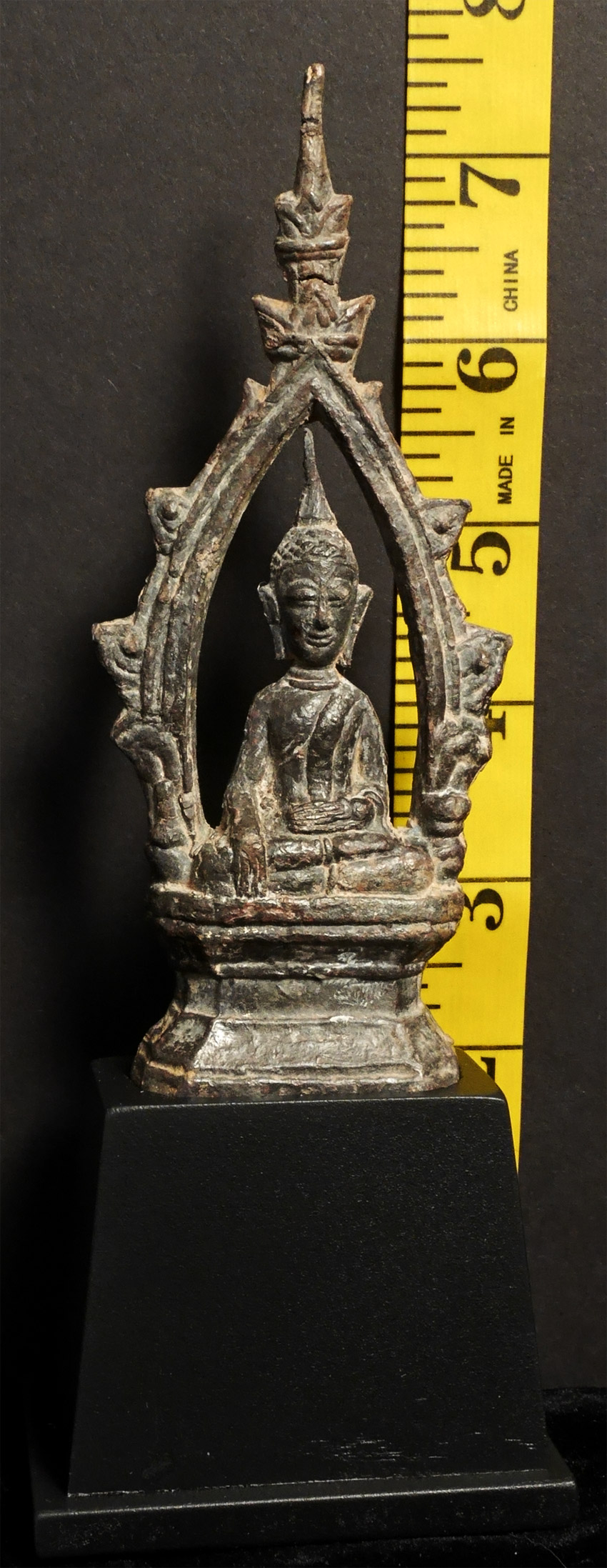 Uncommon Laos/Burmese/Southern China antique lead alloy Buddha. Typically this type is extremely flat- this one has real weight to it. Stands 5 3/8" tall and 7.5" tall on its custom base.