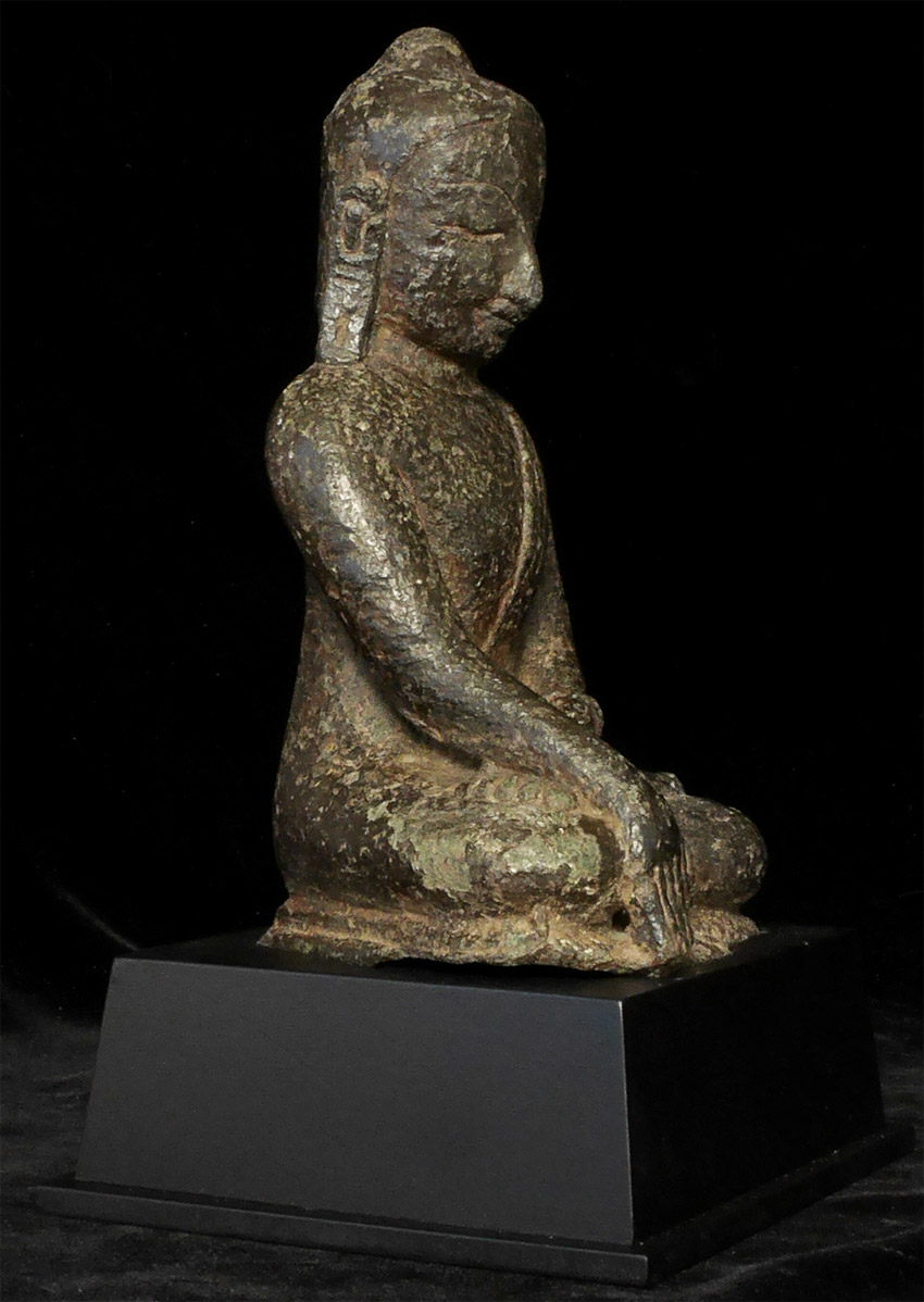 Late Pagan Burmese Buddha. Thickly cast, with an ancient patina. Probably 13t/14thC. Sits 8.5 inches tall, 10.75 inches on custom base. Original base removed long ago, probably at a time of scarcity of bronze, and used to make other Buddha images. Now has a custom base. This type has a distinctive face which is very expressive. Big presence. Rare type.