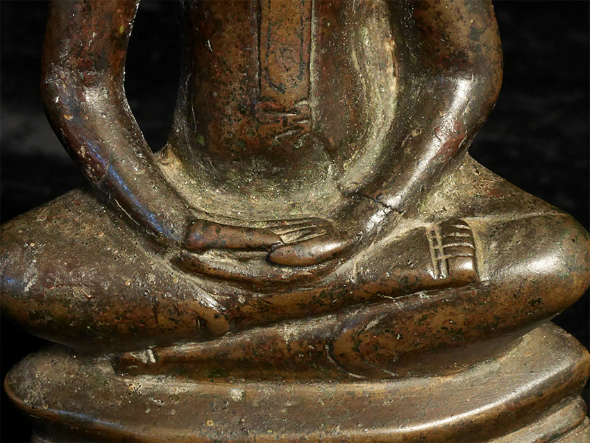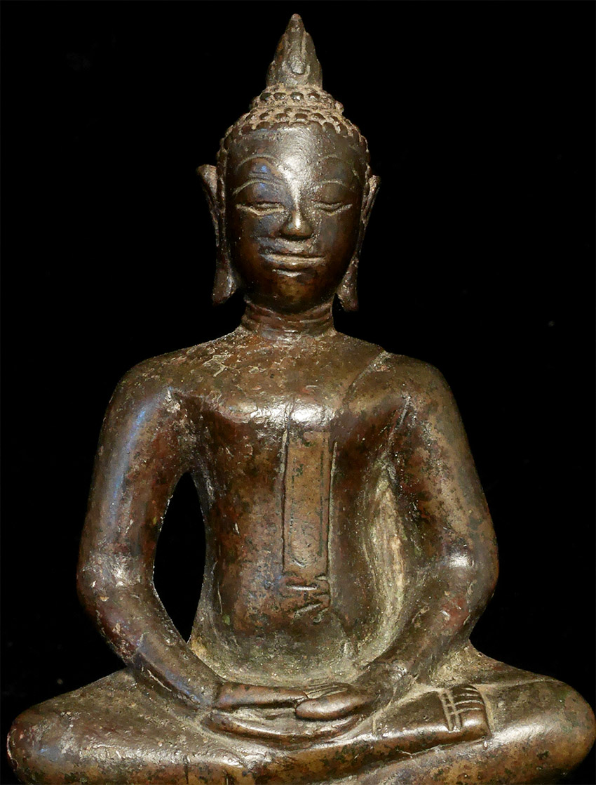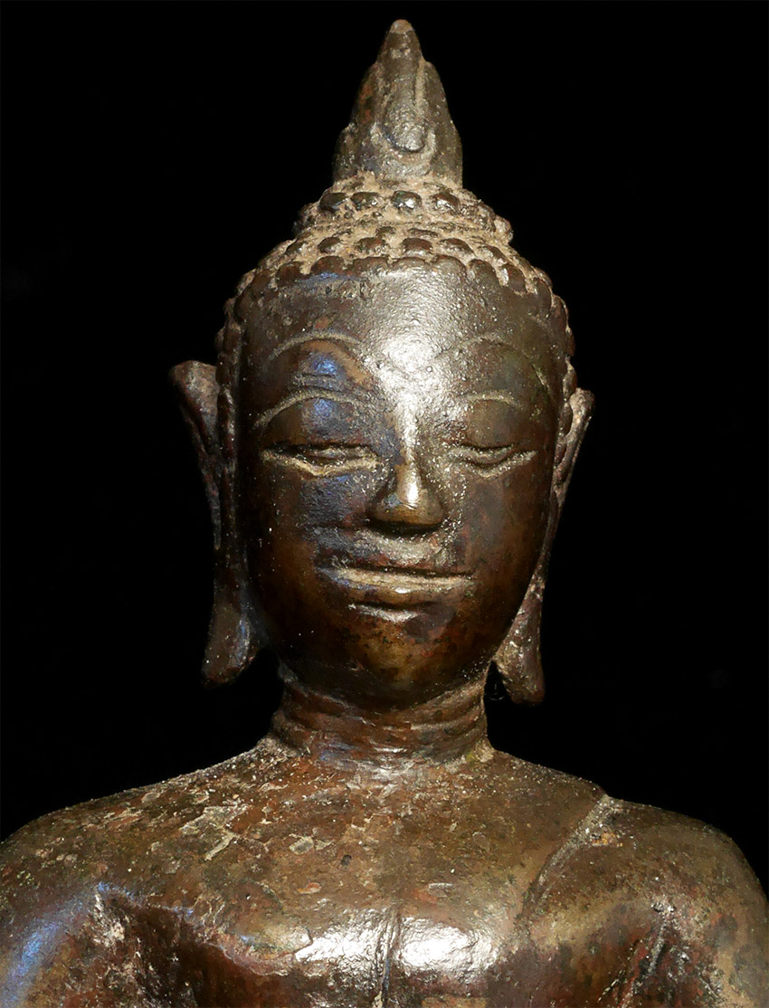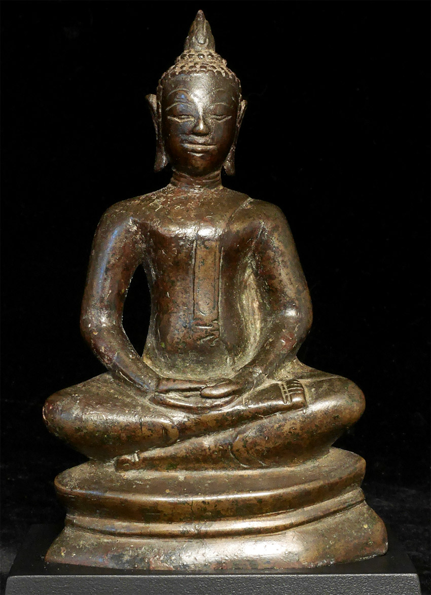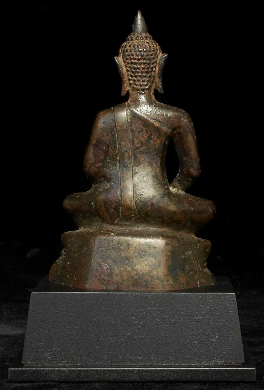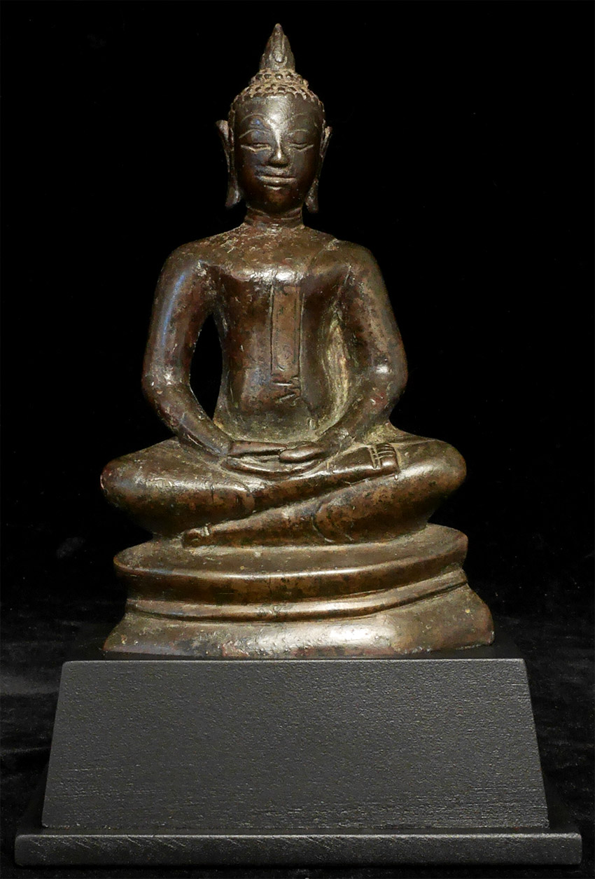 Very fine 15/16thC Thai Utong "C" Style Bronze Buddha. Sits 5 inches tall, total height on custom stand is 6.5 inches. This type is much rarer than its Ayuthaya counterpart (and much more sought after by collectors- especially these small very fine ones that look joyful rather than the more serious U-Tong types which are much more common). This is a 20+ year personal favorite. Even in the 1990's was quite expensive to purchase compared to other Thai Buddhas.