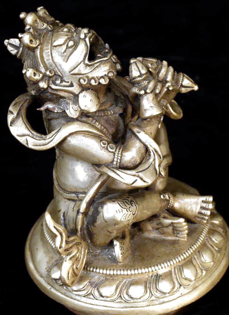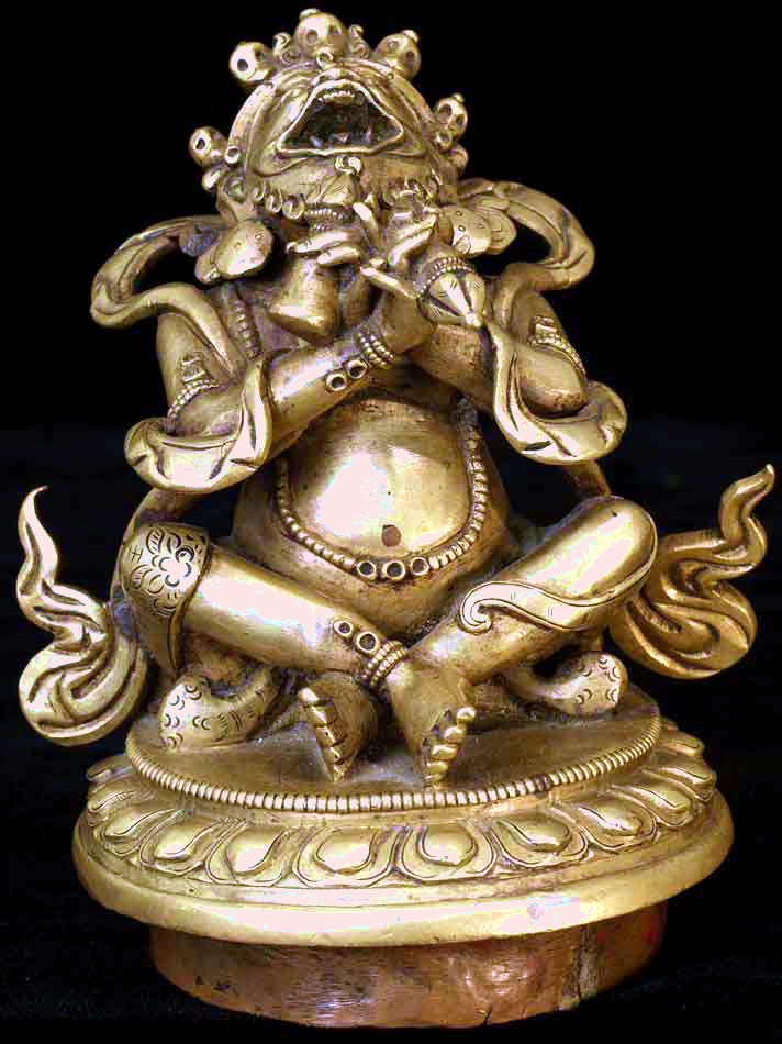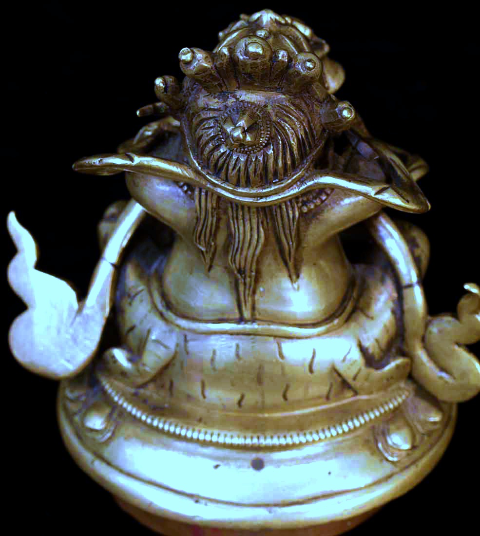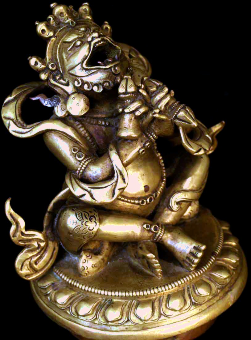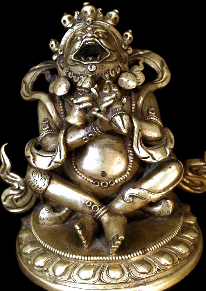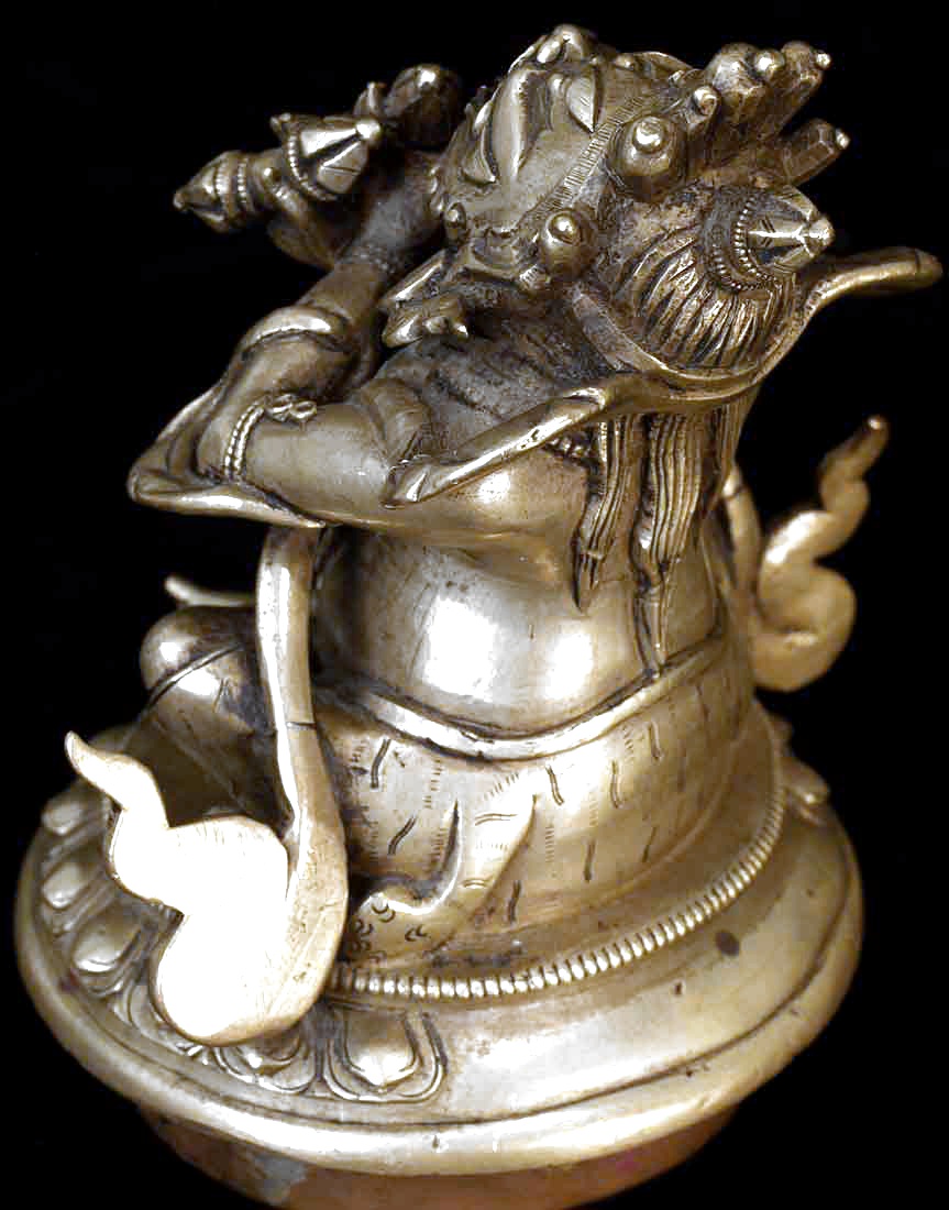 This is an 18th century finely cast Sino-Tibetan protective deity who is the eater of bad dreams. He is in the form of a censor, and is designed so that the smoke comes out if his mouth. I am not sure whether he ever had a bottom. His fangs are copper, as is the lip around the bottom. The face is incredible- as good as I have seen on one of these, and they can go in to the high thousands. He sits 4.25 inches tall by 3.5 inches wide at his widest. The pictures are not of the best quality- the bronze has a better surface than appears in the photos.
