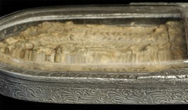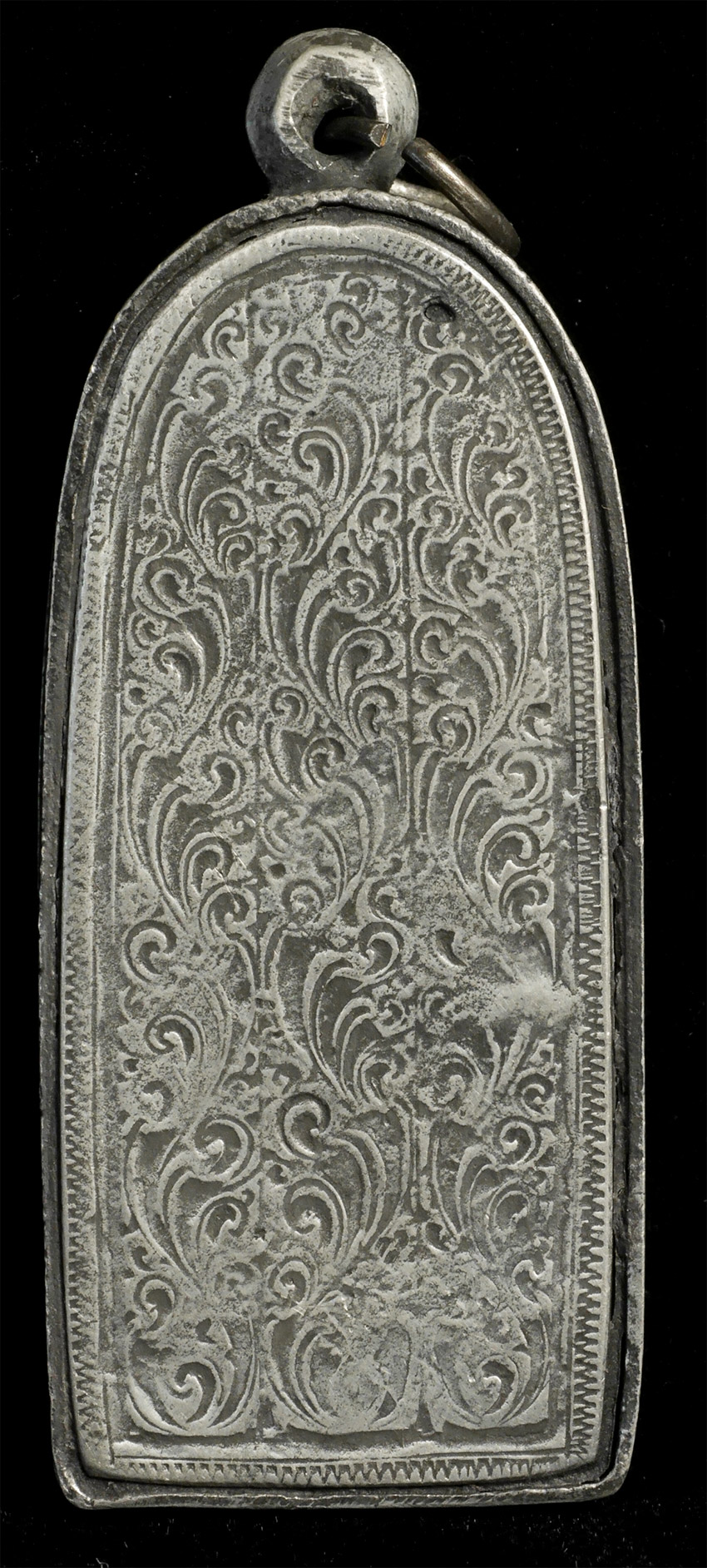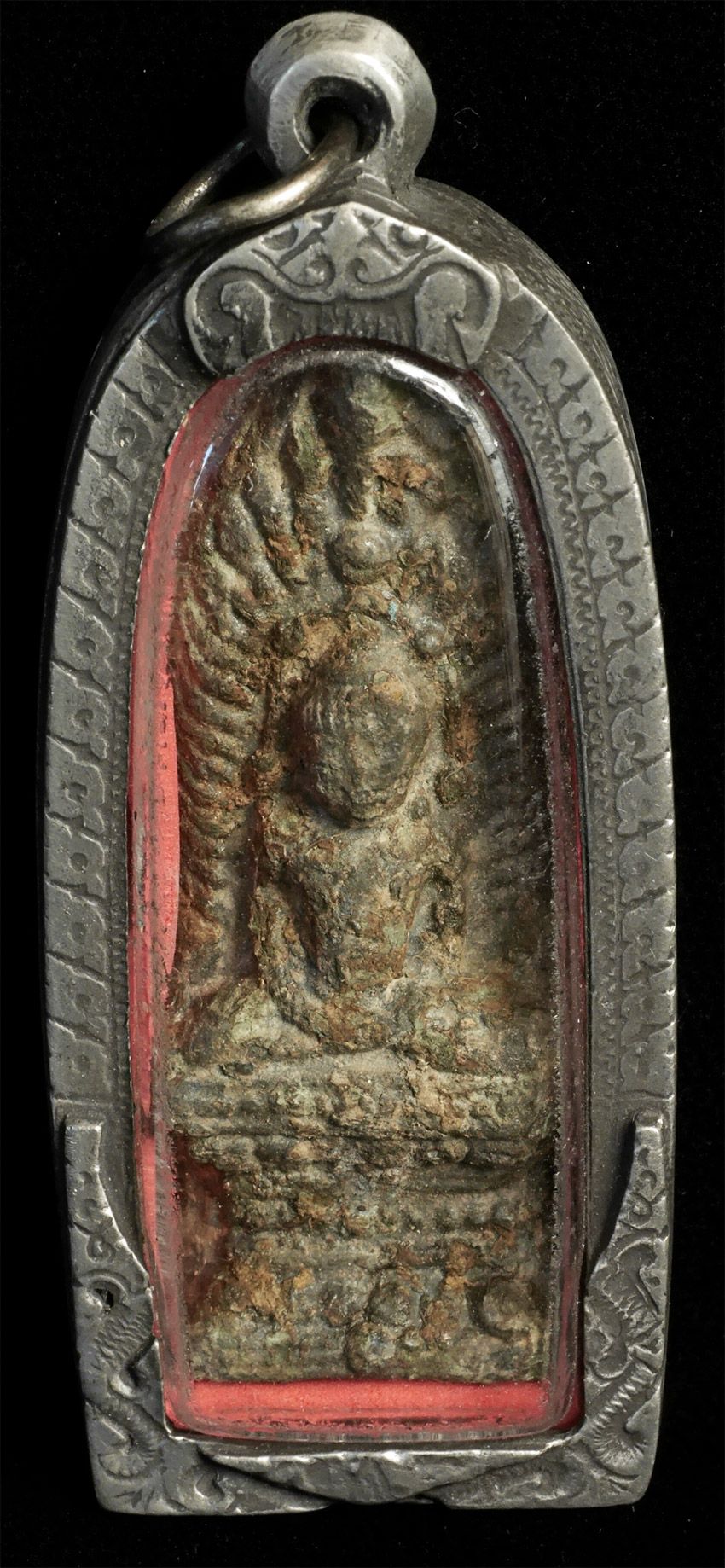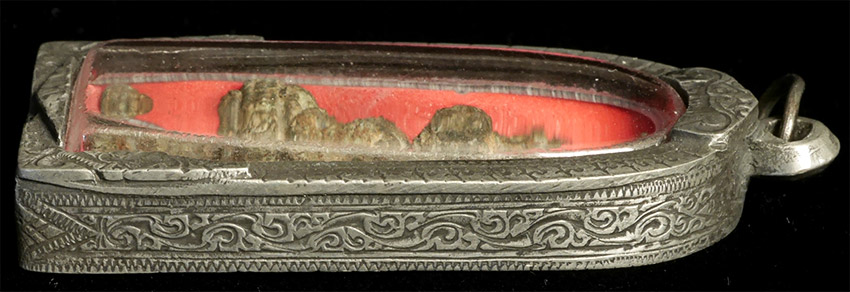 Three amulets gifted by the widow of a very wealth Chinese-Thai businessman I had become good friends with in the 1990's (he was not in the Buddha business). He had reportedly treasured these for more than 20 years. All three appear authentic Khmer, and the cases are amazing- the finest I've seen. 3 figures ranging in height from 1.75 inches to 2 3/8. Case heights range from 2.25 to 2 7/8 inches.