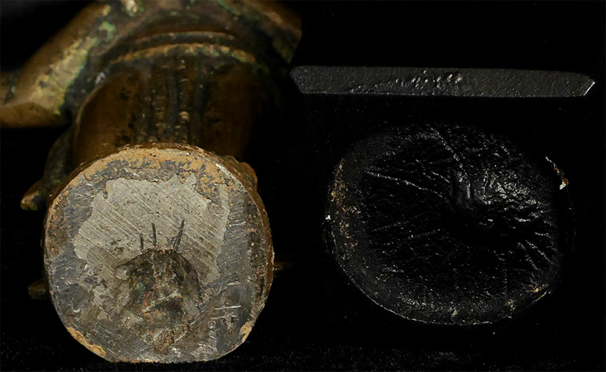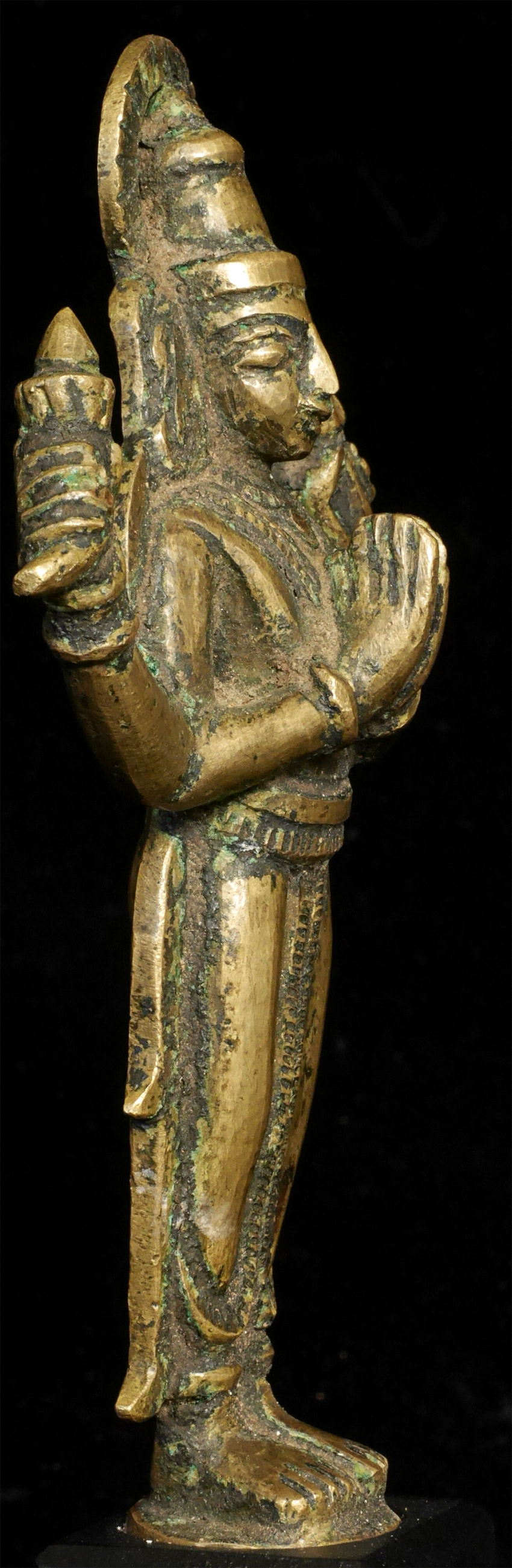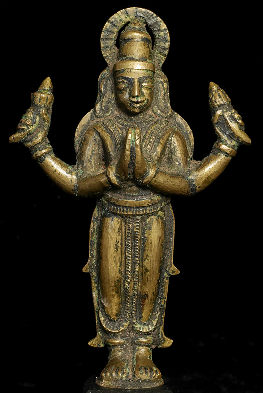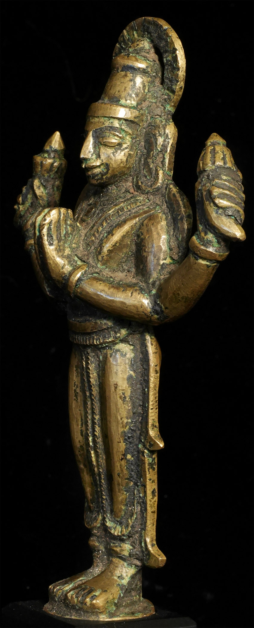 Nice antique 4 arm Hindu figure. Very heavy. Stand 6 inches tall, height on custom stand is 7 7/8 inches.
