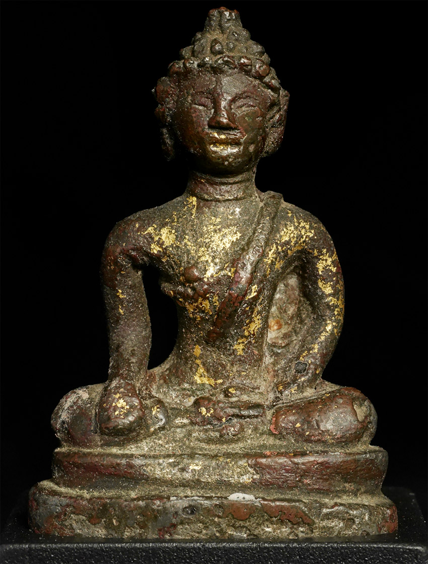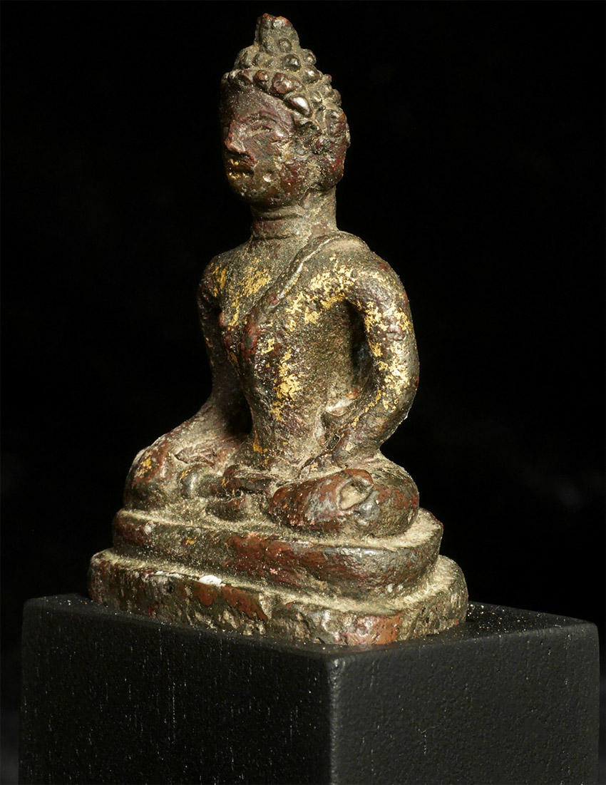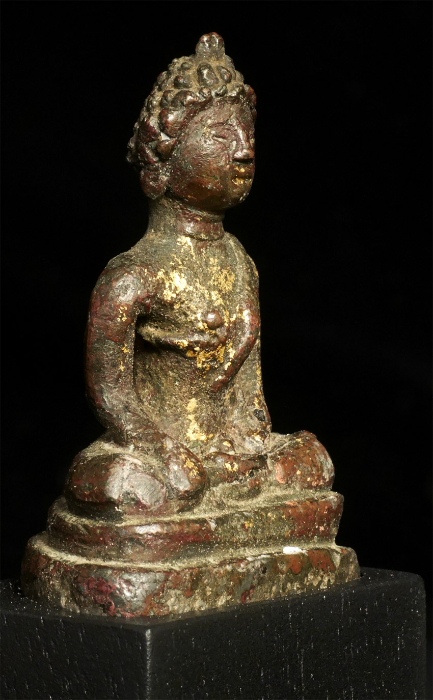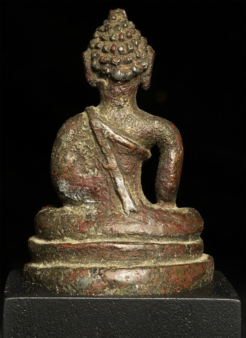 Rare early solid cast Buddha- looks to be very early- a good 700 to 800 years old. Probably SE Asian, and possibly Mon--hard to tell with some of these early ones. Measures 2 inches tall and 4 inches on its custom base
