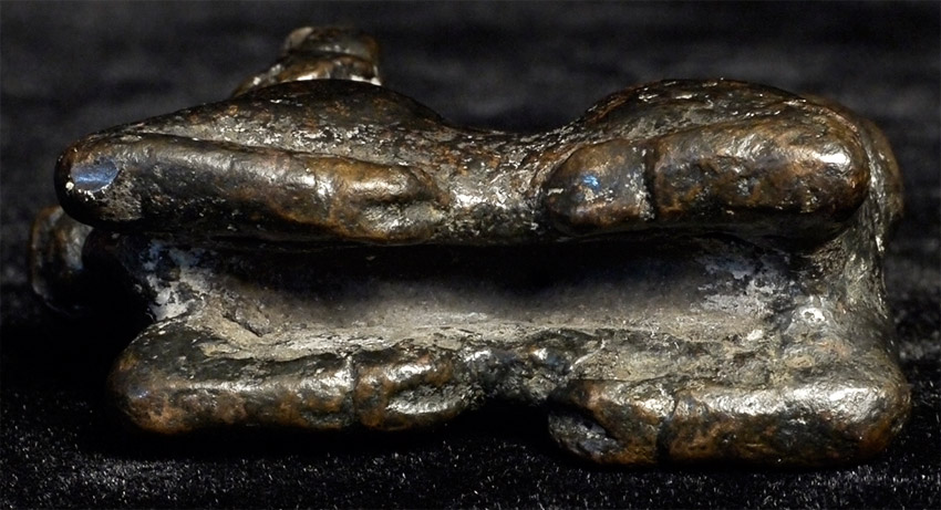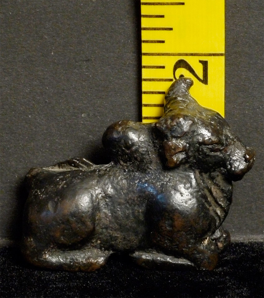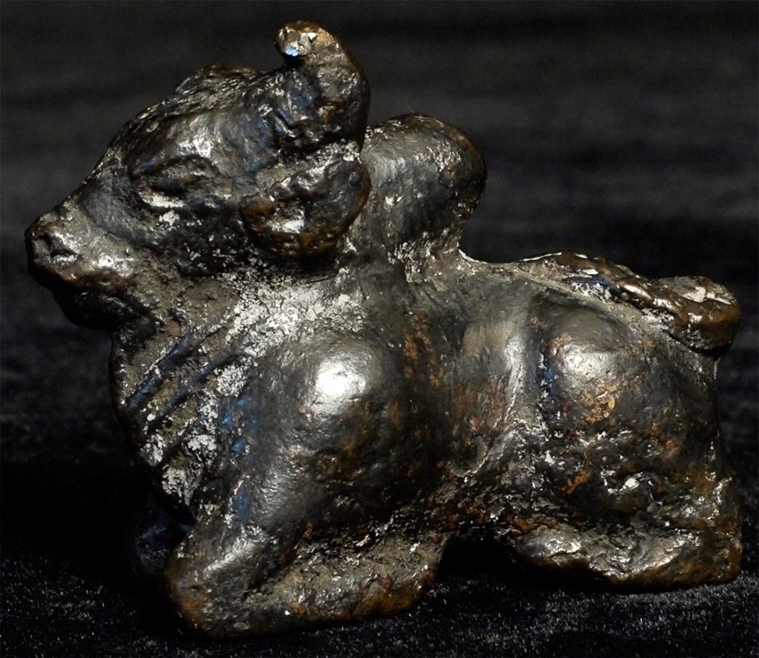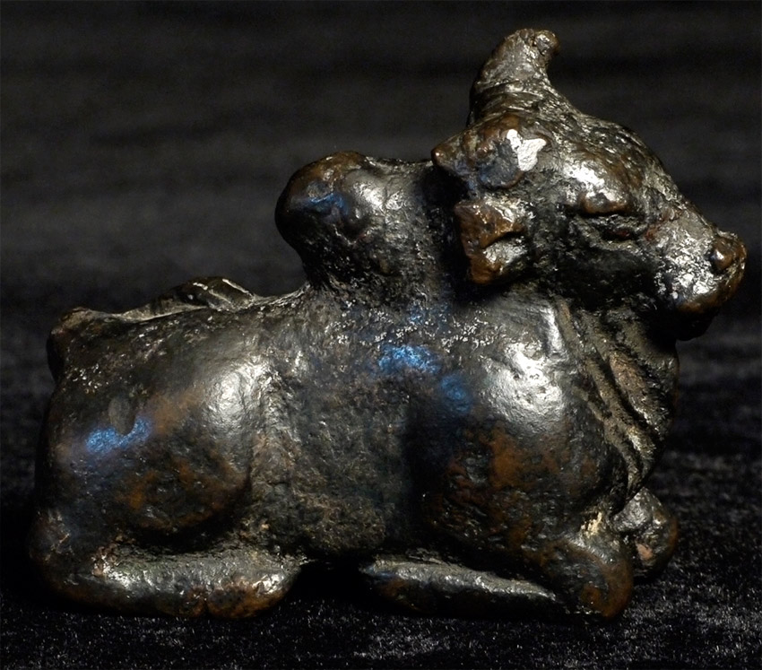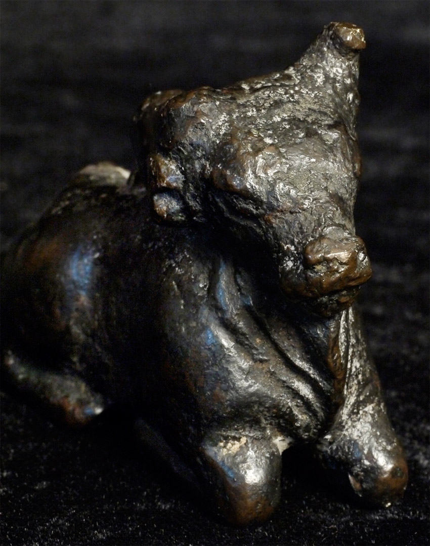An authentic solid-cast Indian "Pala" period sitting bull. From a well know Southern California collection, you are unlikely to encounter another anytime in the near future. Real sensitivity to the sculpting-you can especiall see it in the face. This rare survivor is close to 1000 years old. NOTE- this piece was formerly in the collection of Samuel Eilenberg. Dr. Eilenberg amassed one of America's great collections of South and Southeast Asian bronzes in the 20th century, and it is his collection that created a significant core of the S.E. Asian section at the Metropolitan Museum of Art in New York City. The thing I love about his collection there is a very good book show casing his collection plus I have owned a half dozen small pieces from his collection that were auctioned off in the 1990's) is that he collected small as well as large, folk as well as classic. He had an eye for small pieces like this one that are not great in scale or fancy in adornment, but they show great personality and exemplify what makes their period and type so special.