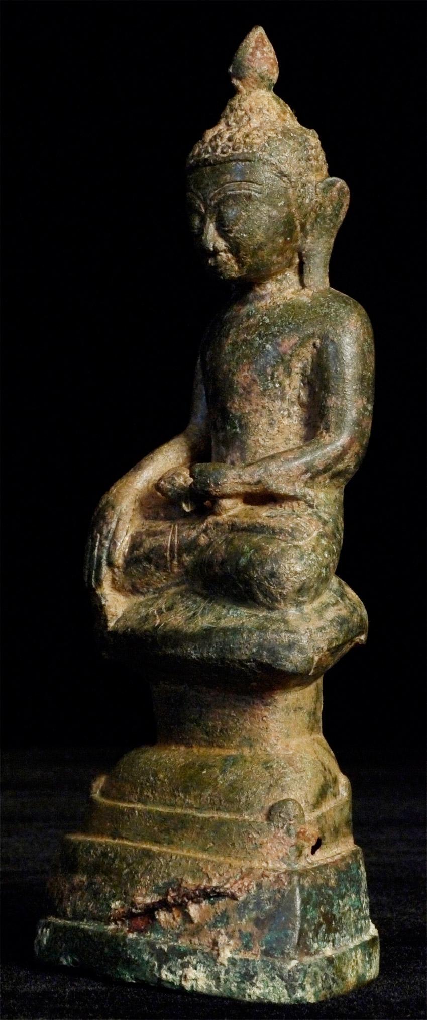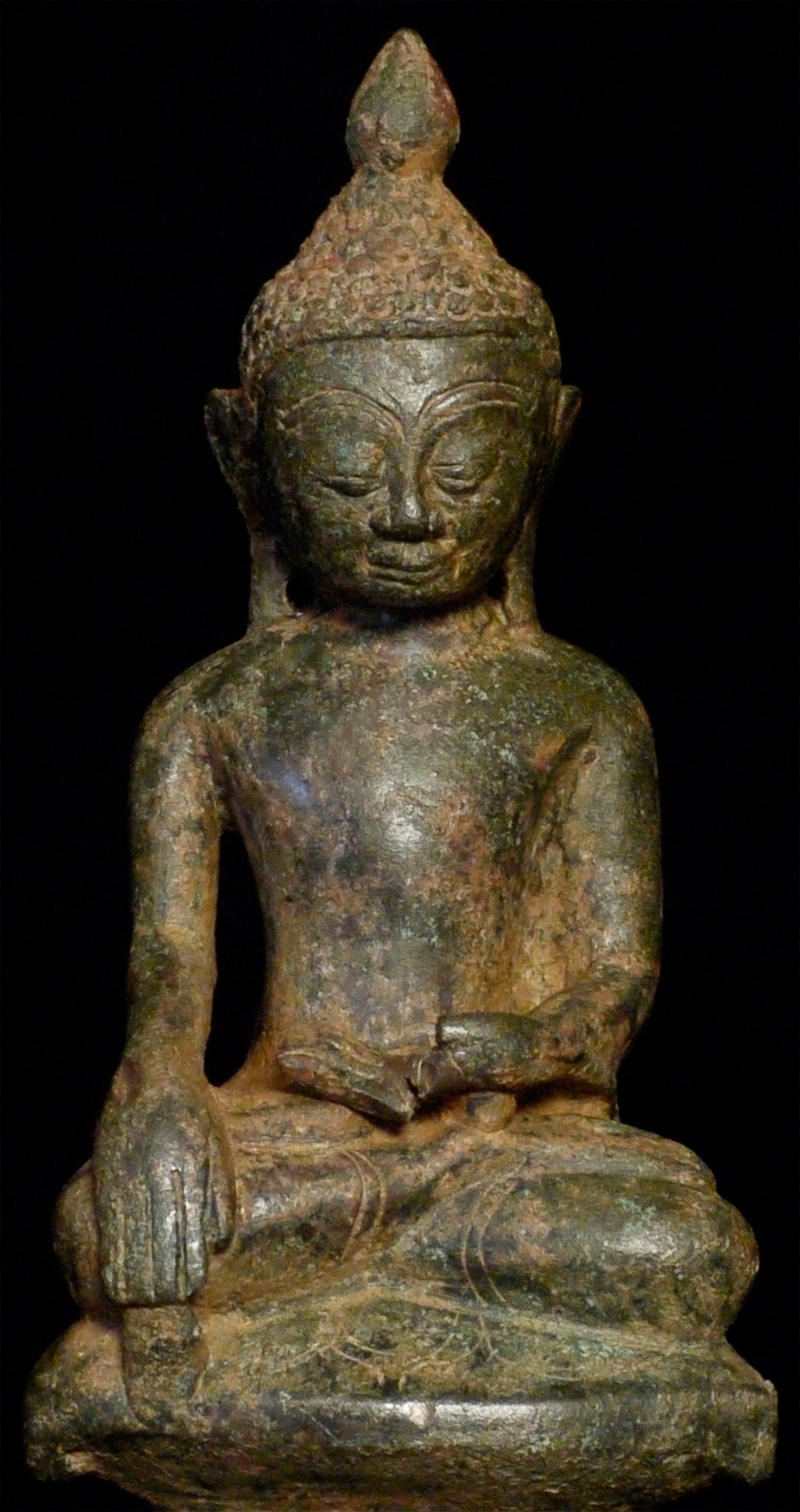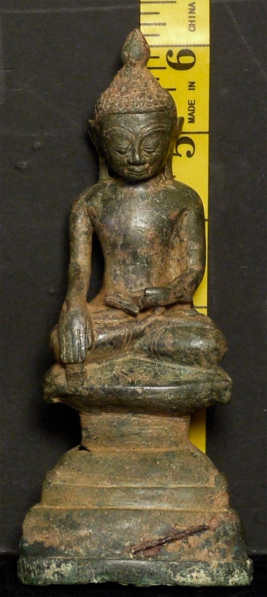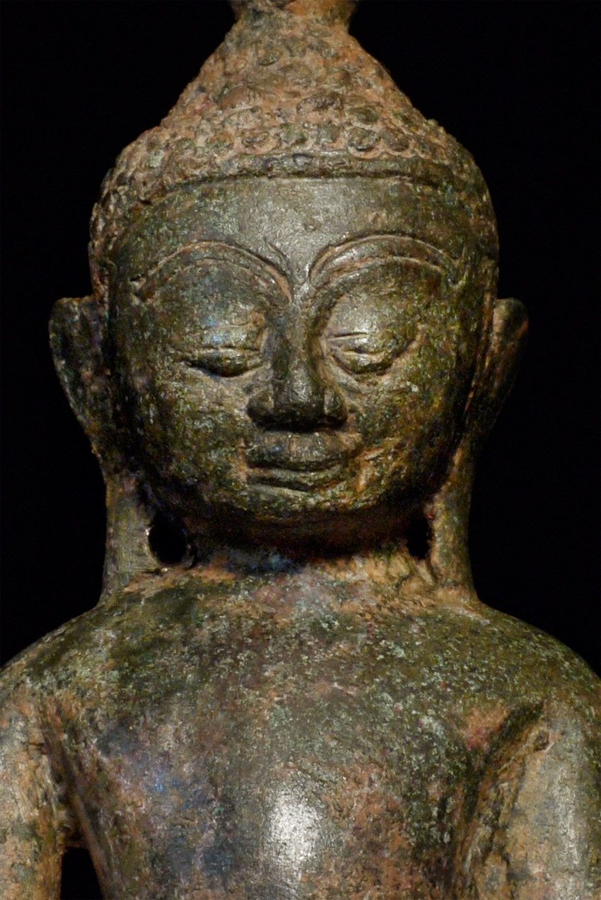 Burmese bronze Buddha- earlier than the typical Shan Buddhas, which are more angular, with more pointed features and narrower faces. This type has influence from late Ava, and has a more rounded, almost "baby" face which is very pleasing. Just over 6 inches. Appears to have been long buried.