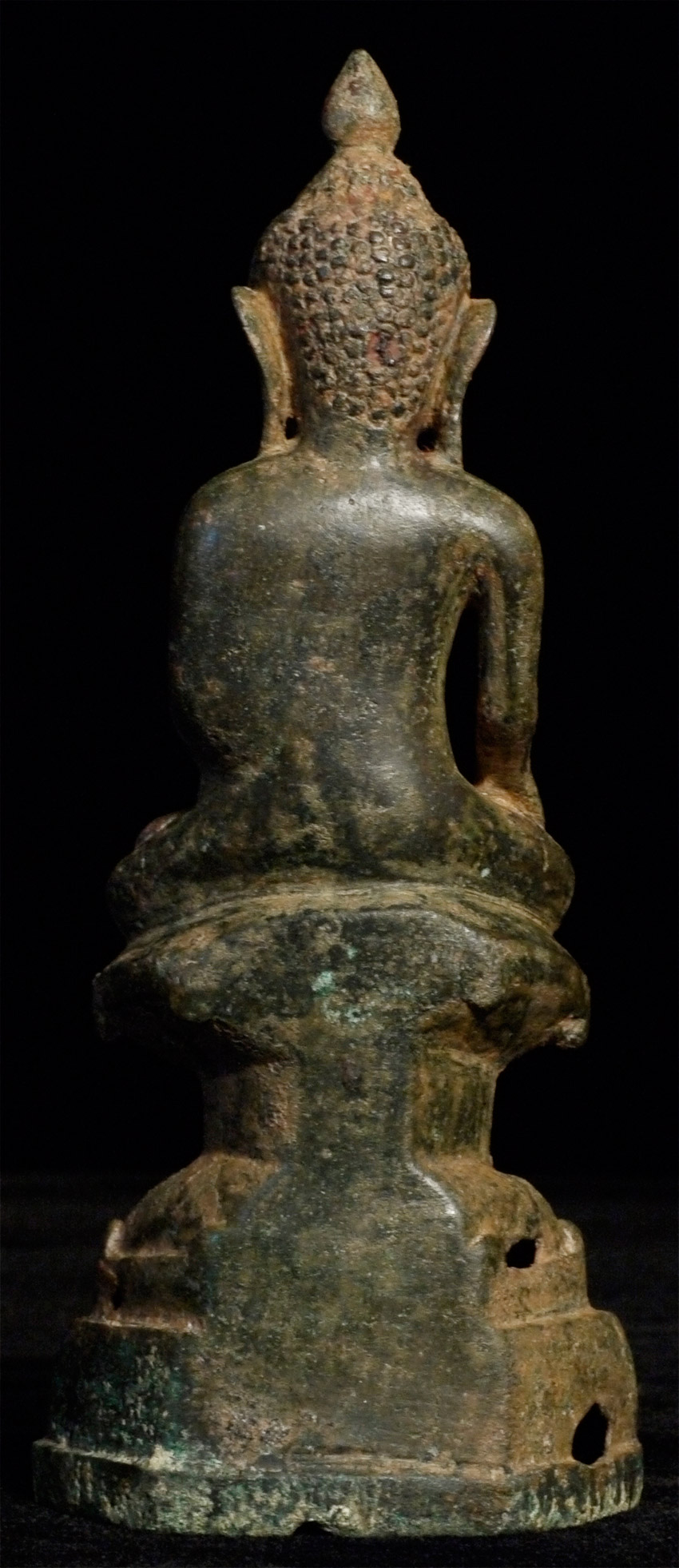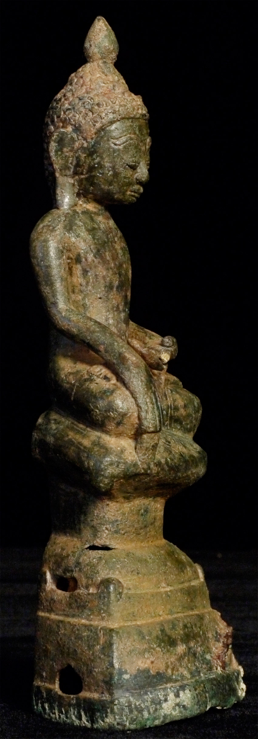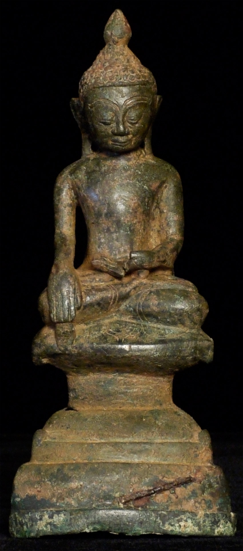 Burmese bronze Buddha- earlier than the typical Shan Buddhas, which are more angular, with more pointed features and narrower faces. This type has influence from late Ava, and has a more rounded, almost "baby" face which is very pleasing. Just over 6 inches. Appears to have been long buried.