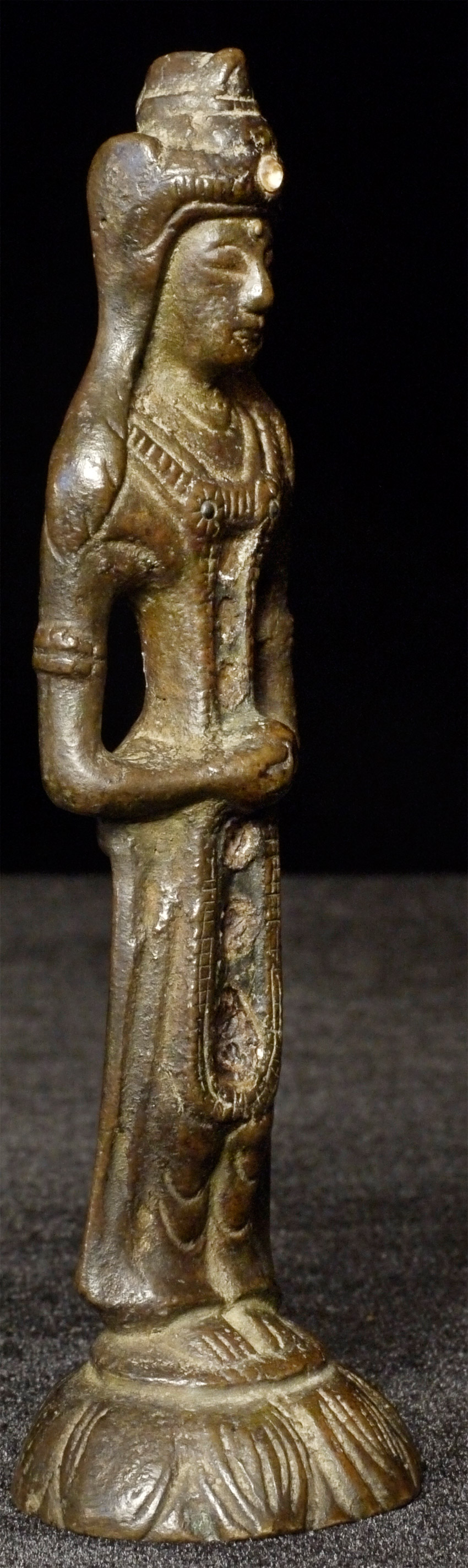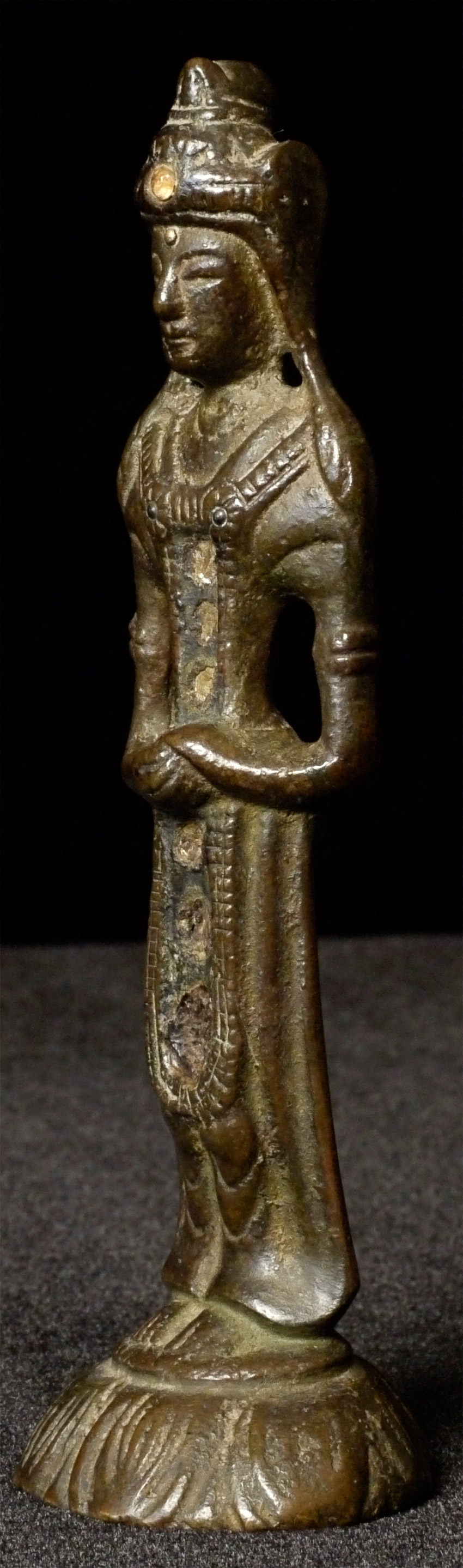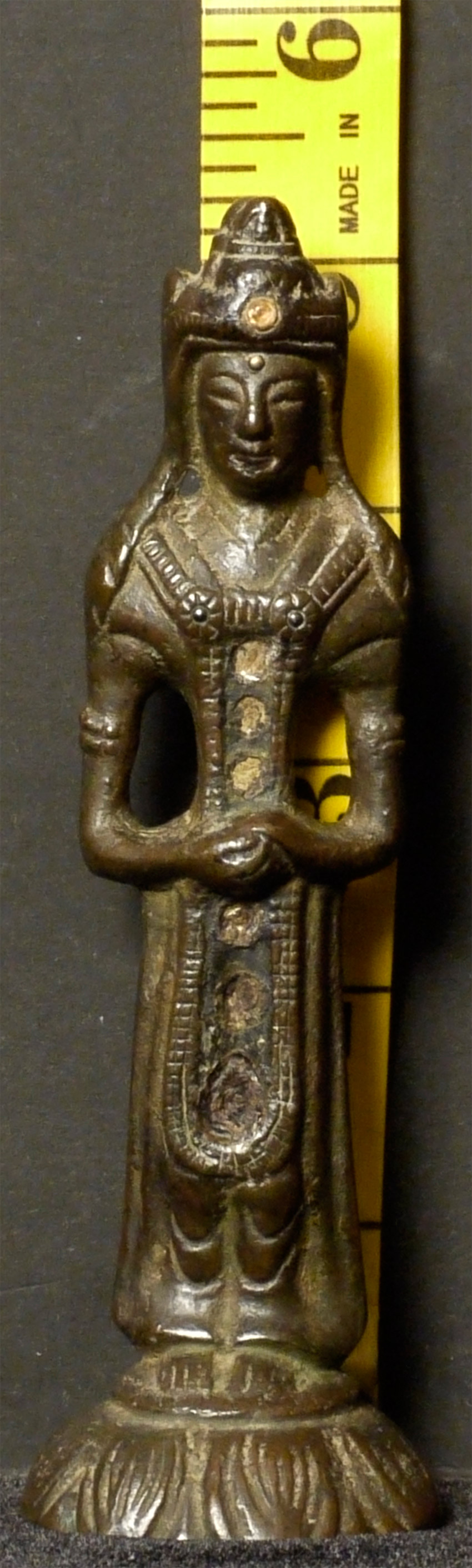 Antique Chinese or Korean Bronze Buddha. Very good example of its type. 5.25 inches tall. Looks to have originally had stones or beads down the center of the front and in the forehead. I originally listed as Korean, but Koller, the well respected Swiss Auction house, has a nearly identical example-slightly smaller at 4 and 7/8 inches-in their June 2016 auction (lot 175) with a pre-estimate of 2000 to 3000 Swiss dollars. They describe theirs is 6th century Sui, and Chinese. Koller often gets much higher than their pre-auction estimates. The last photo below is of the Koller example up for auction. Please see 6721 and 5265 for related examples.