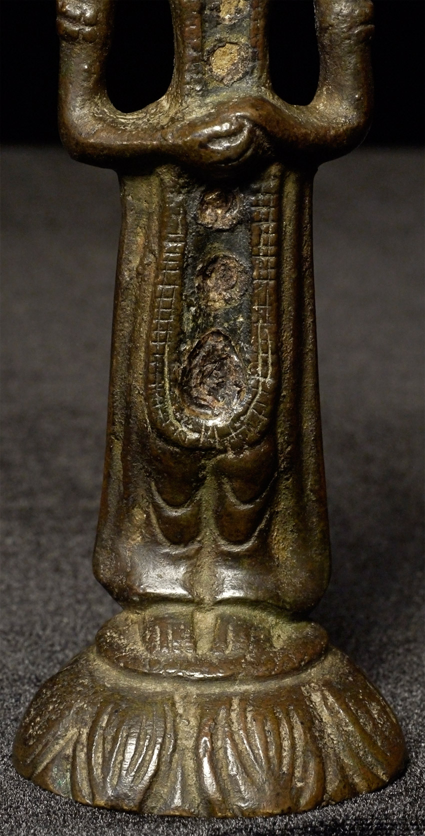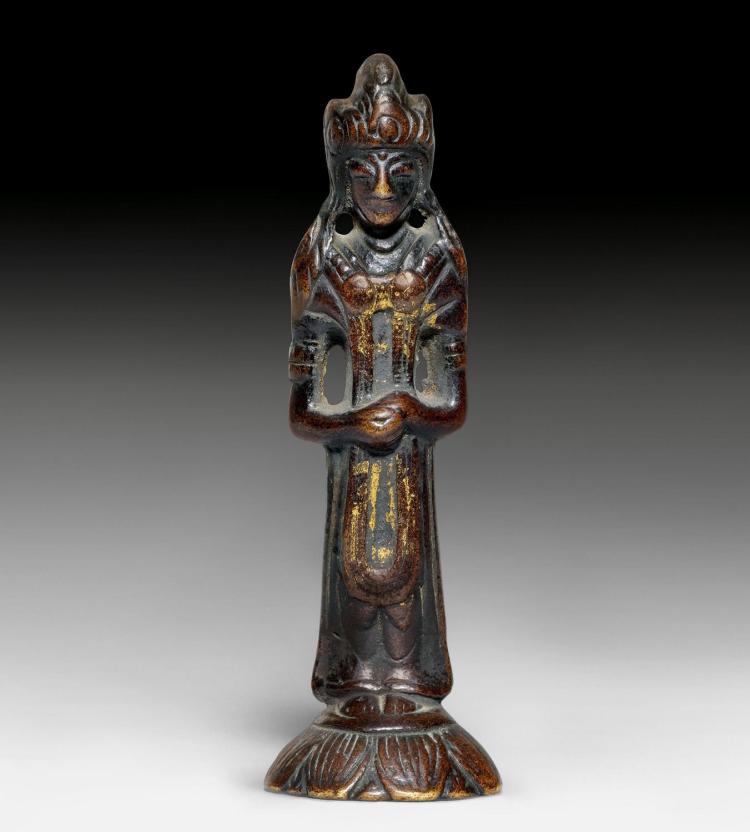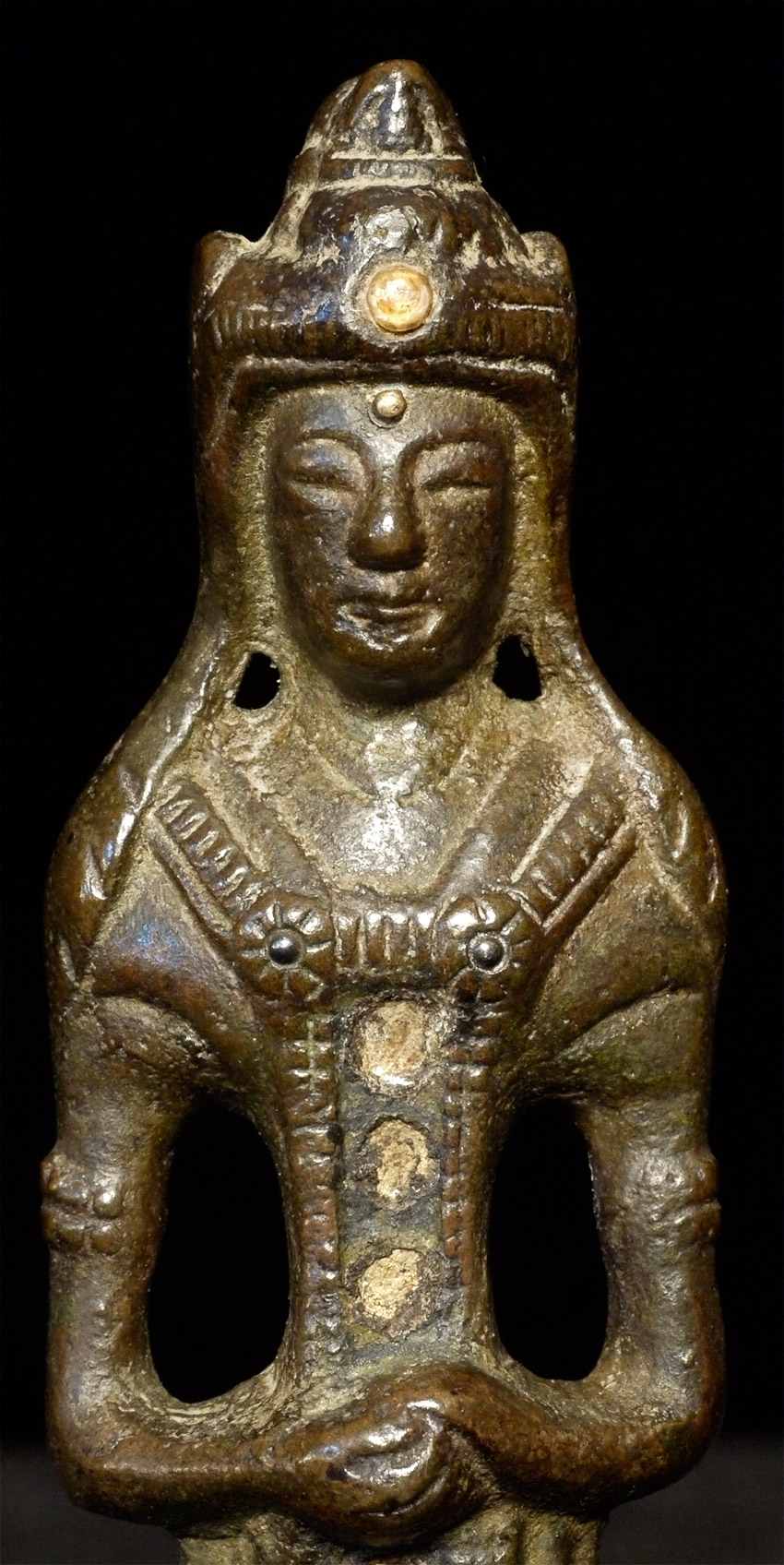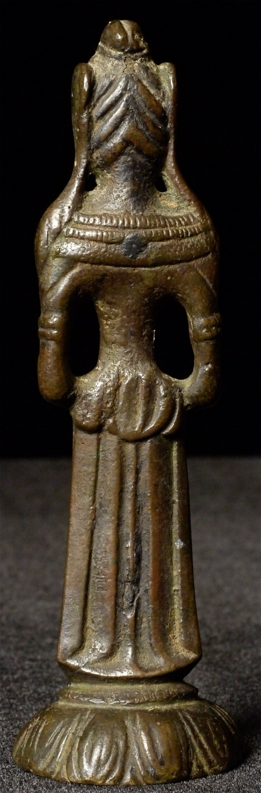 Antique Chinese or Korean Bronze Buddha. Very good example of its type. 5.25 inches tall. Looks to have originally had stones or beads down the center of the front and in the forehead. I originally listed as Korean, but Koller, the well respected Swiss Auction house, has a nearly identical example-slightly smaller at 4 and 7/8 inches-in their June 2016 auction (lot 175) with a pre-estimate of 2000 to 3000 Swiss dollars. They describe theirs is 6th century Sui, and Chinese. Koller often gets much higher than their pre-auction estimates. The last photo below is of the Koller example up for auction. Please see 6721 and 5265 for related examples.
