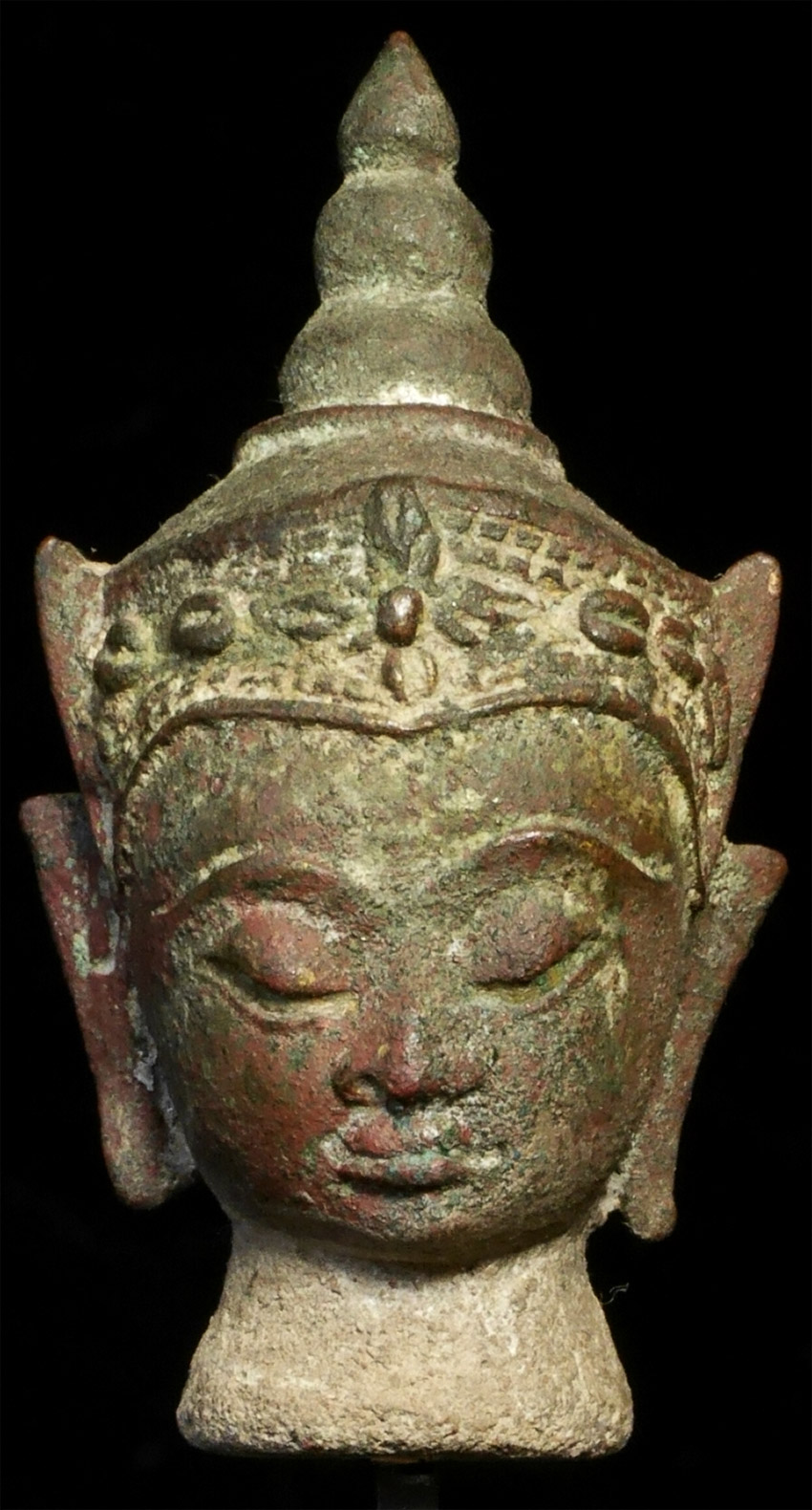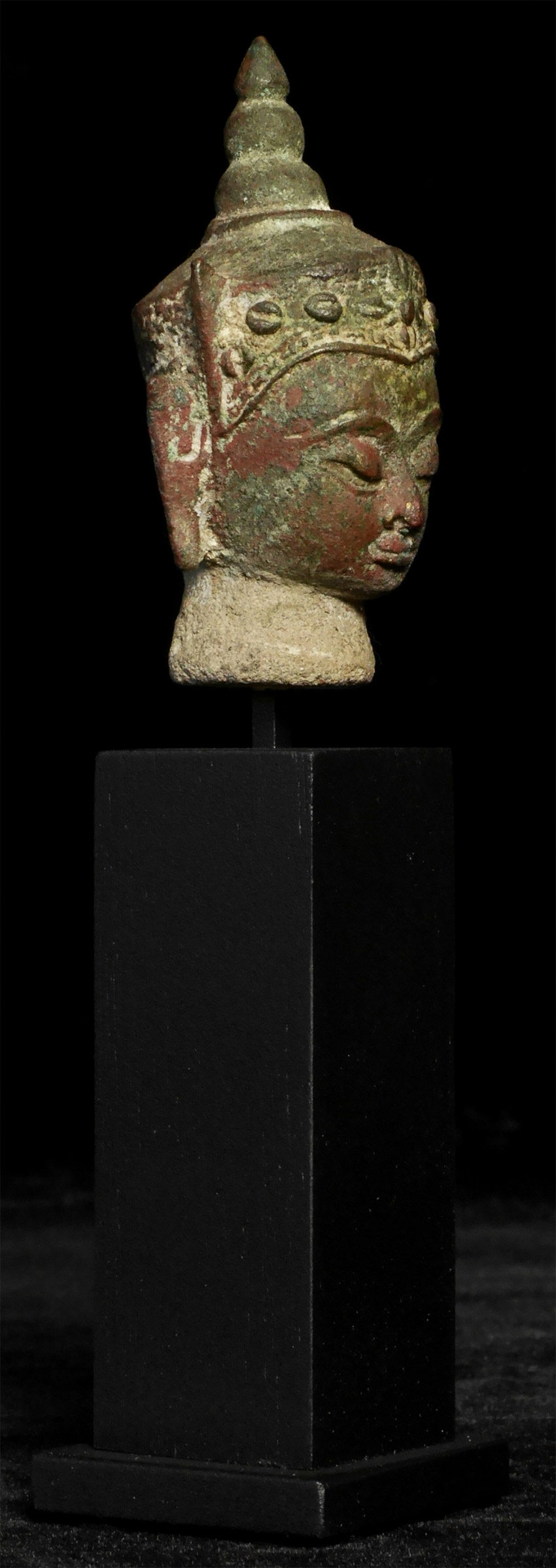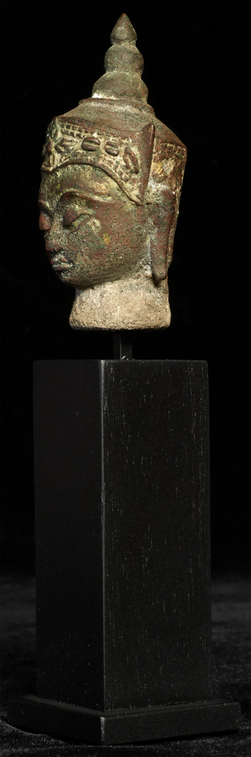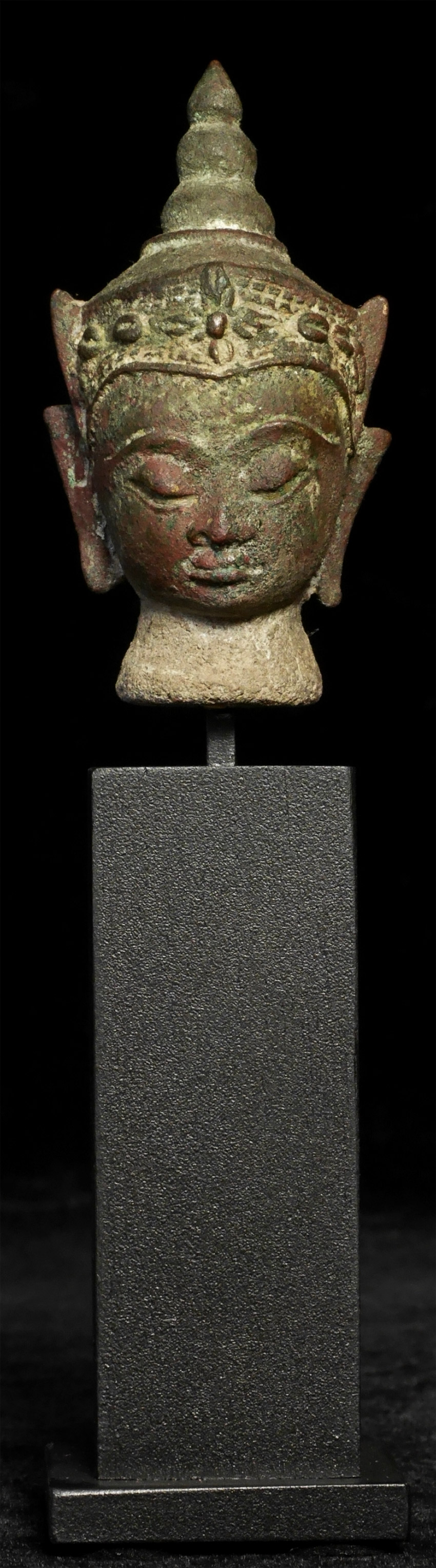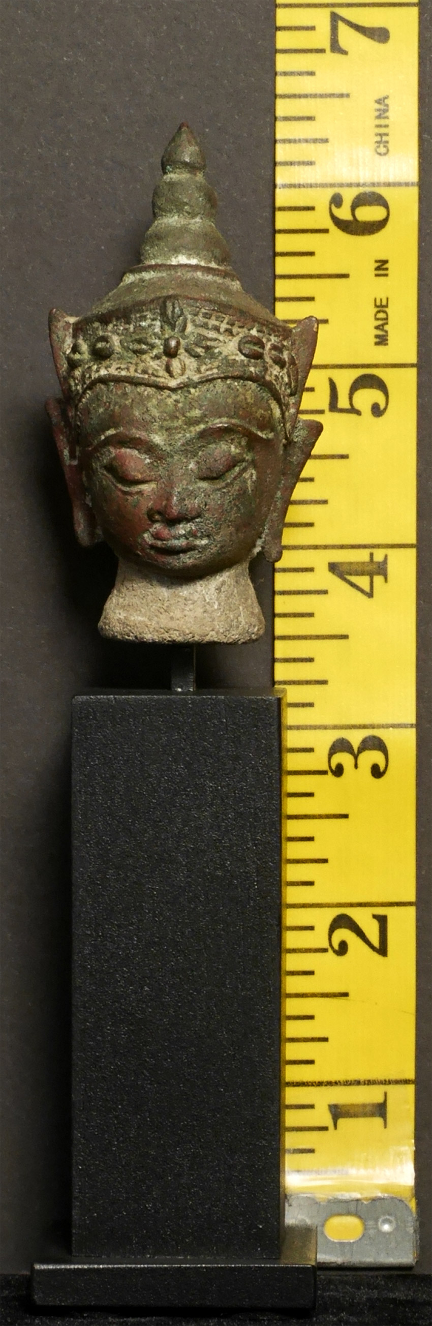 Serene face in this 18thC Thai bronze head .Measures 3 inches and 6 3/8 inches tall with its custom base.