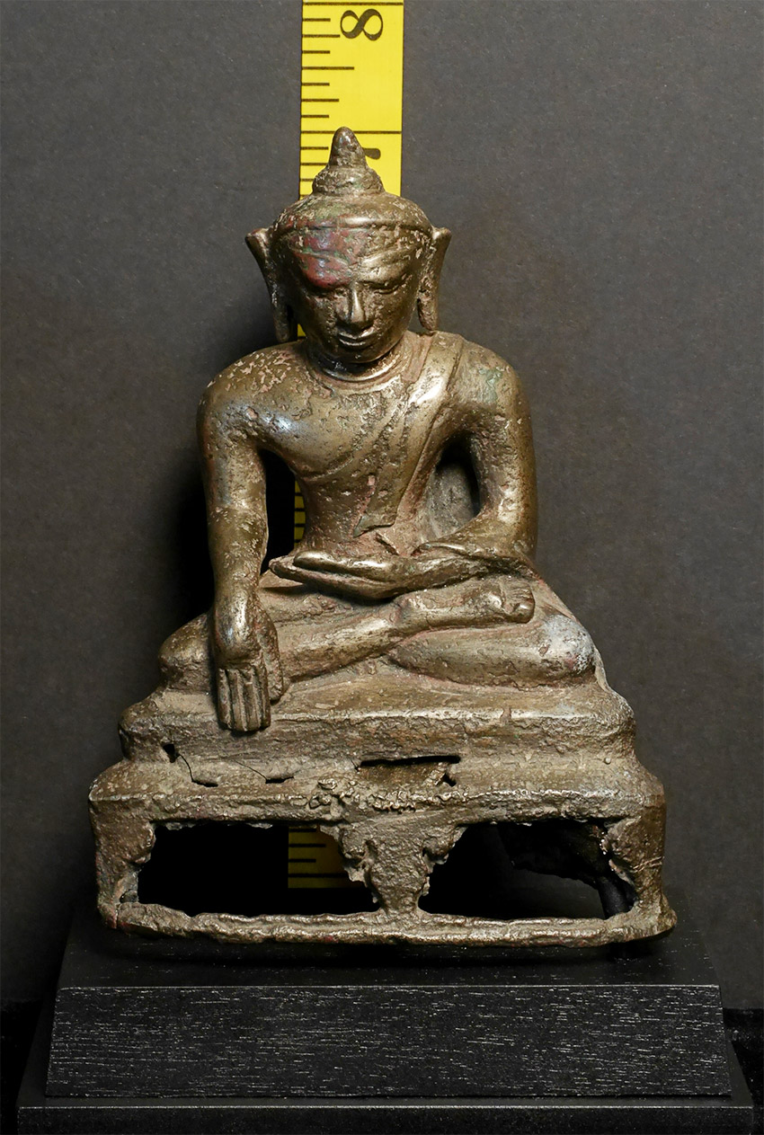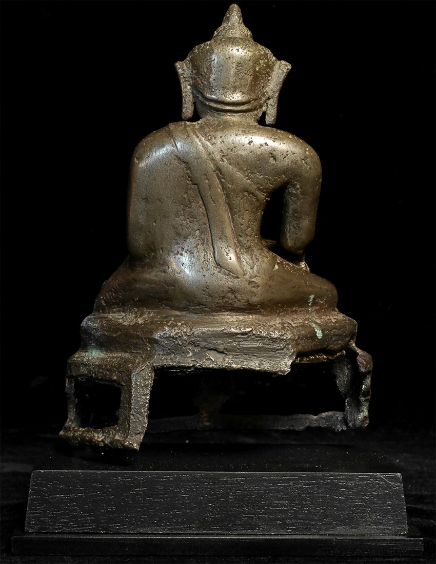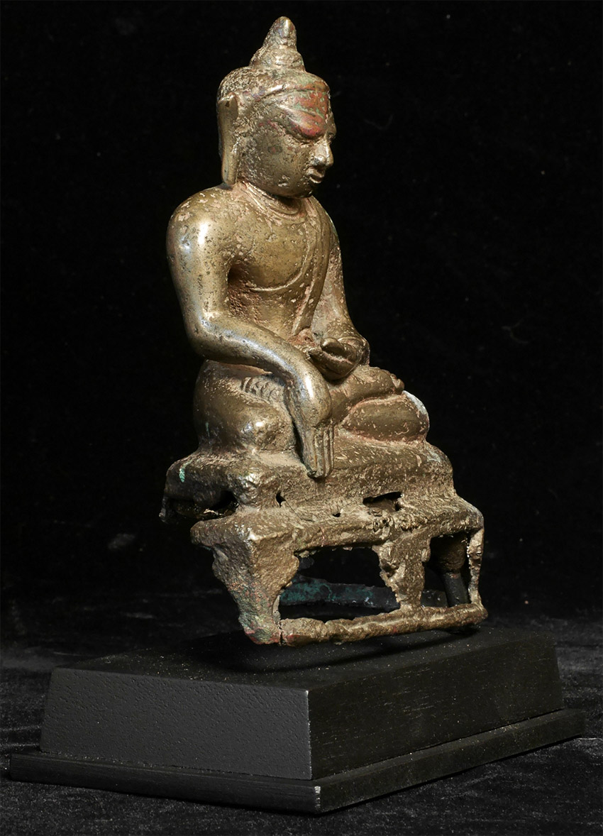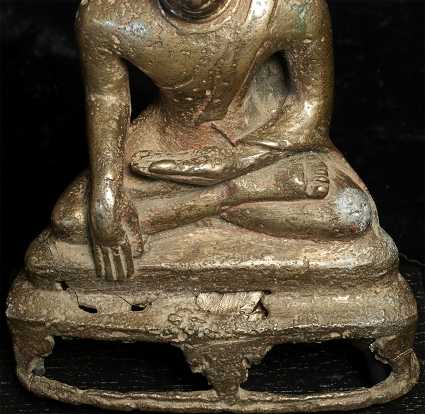 This is a rare late Pagan/Pinya bronze Burmese Buddha from the 13th or 14th centuries. The base is highly unusual and has originally had an additional figure or figures attached to it. There is expectable surface wear, some losses and extensive original casting flaws, and damage/loss to the base. The face is in deep meditation. I've seen one other like him, item # 5317. He sits 7 inches tall with the custom base, 6 inches for the statue alone.